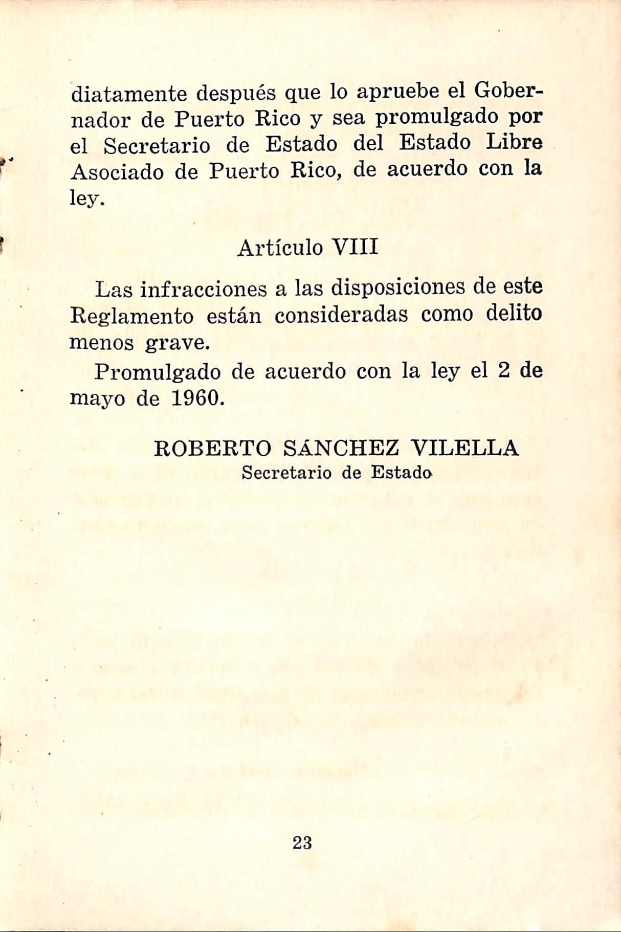 Este Reglamento empezará a regir inme diatamente después de su aprobación por el Gobernador del Estado Libre Asociado de Puerto Rico. Promulgado de acuerdo con la Ley el 2 de mayo de 1960.