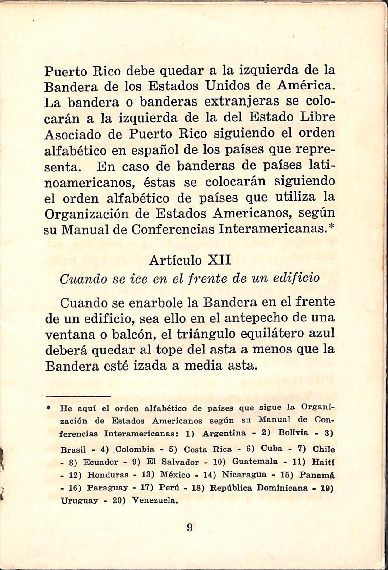 Puerto Rico debe quedar a la izquierda de la Bandera de los Estados Unidos de América. La bandera o banderas extranjeras se colo carán a la izquierda de la del Estado Libre Asociado de Puerto Rico siguiendo el orden alfabético en español de los países que repre senta. En caso de banderas de países lati noamericanos, éstas se colocarán siguiendo el orden alfabético de países que utiliza la Organización de Estados Americanos, según su Manual de Conferencias Interamericanas.*