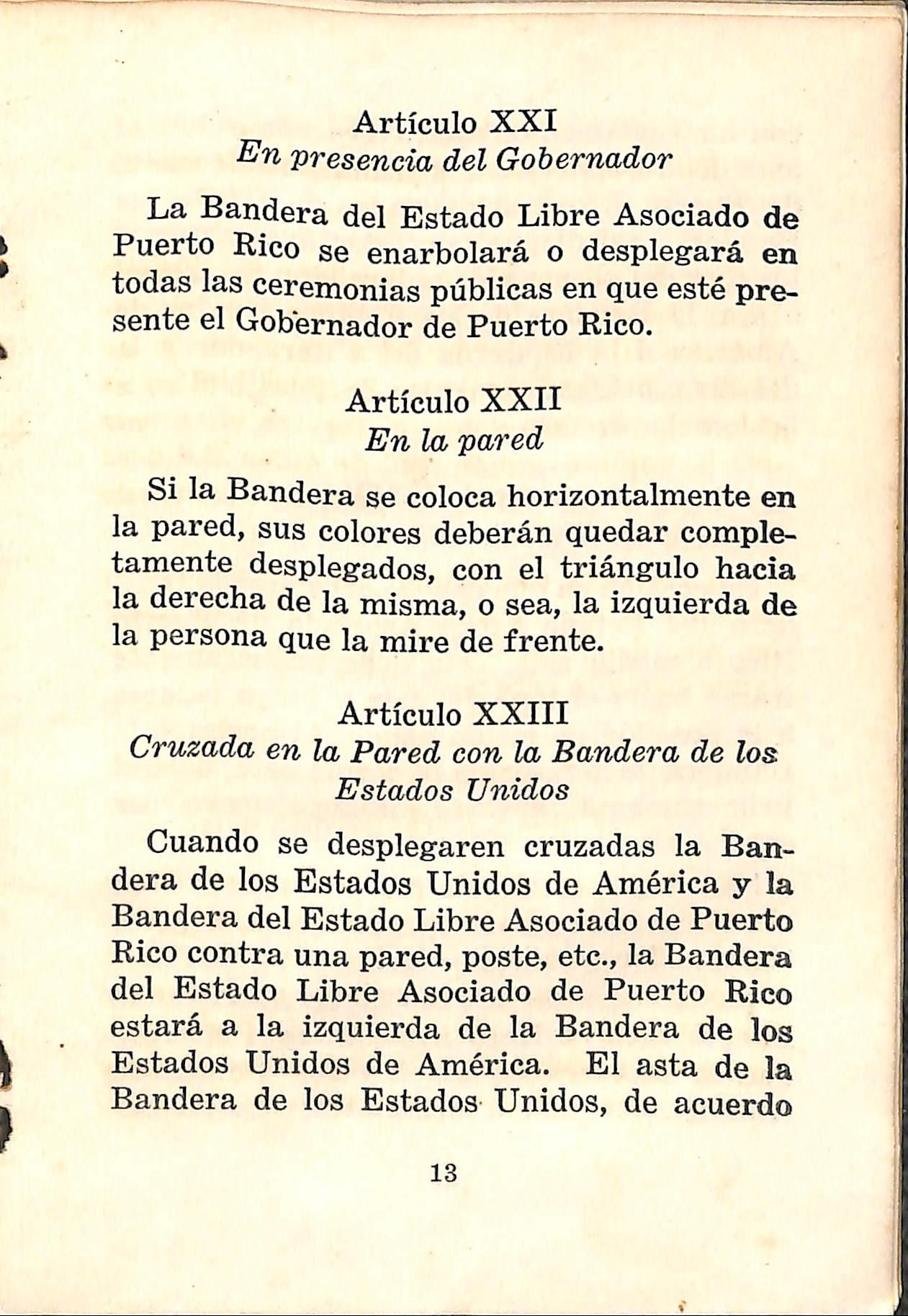 La Bandera podrá enarbolarse de noche en ocasiones especiales en que desee producir un efecto patriótico. Al enarbolarse la Bandera del Estado Libre Asociado de Puerto Rico junto a cualquiera otra bandera represen tativa de nación o pueblo, ambas serán de igual tamaño y se enarbolarán en astas de tamaño igual de manera que al desplegarse queden al mismo nivel.