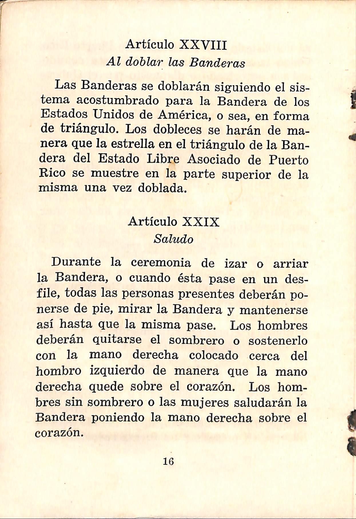 Las Banderas se doblarán siguiendo el sis tema acostumbrado para la Bandera de los Estados Unidos de América, o sea, en forma de triángulo. Los dobleces se harán de ma nera que la estrella en el triángulo de la Ban dera del Estado Libre Asociado de Puerto Rico se muestre en la parte superior de la misma una vez doblada.
