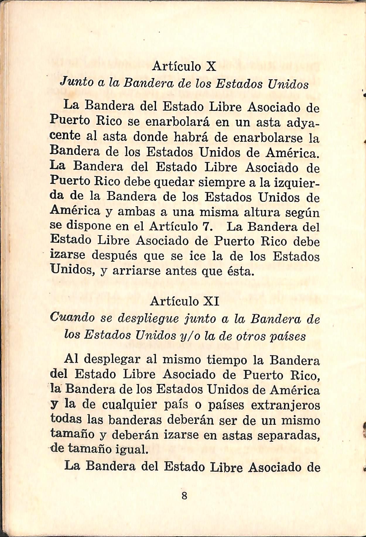 La Bandera del Estado Libre Asociado de Puerto Rico se enarbolará en un asta adya cente al asta donde habrá de enarbolarse la Bandera de los Estados Unidos de América. La Bandera del Estado Libre Asociado de Puerto Rico debe quedar siempre a la izquier da de la Bandera de los Estados Unidos de América y ambas a una misma altura según se dispone en el Artículo 7. La Bandera del Estado Libre Asociado de Puerto Rico debe izarse después que se ice la de los Estados Unidos, y arriarse antes que ésta.