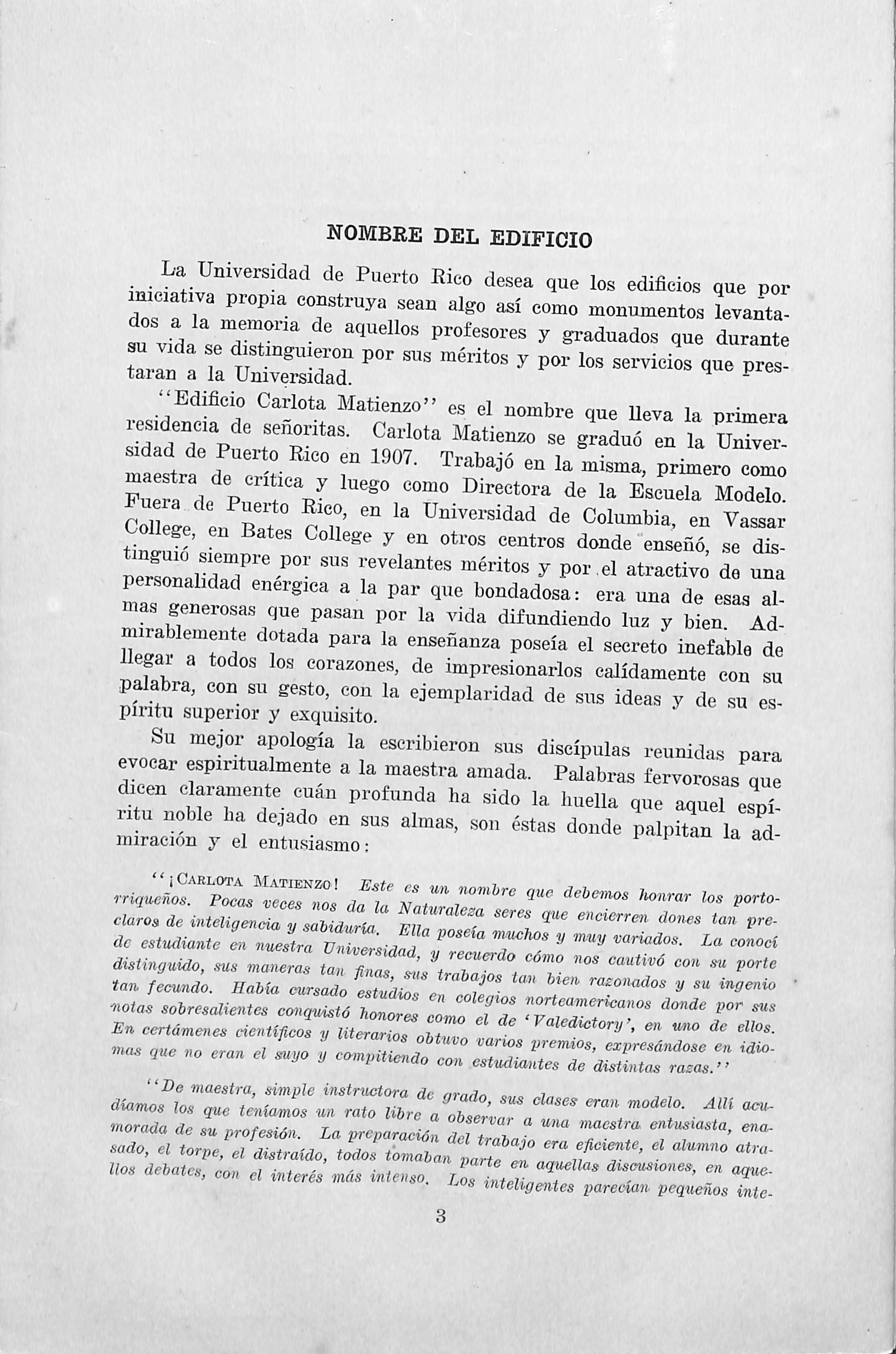 "Edificio Carlota Matienao" es el nombre que Ueva la primera ies.denma de amontas. Carlota Matienzo se graduó en la üniver sidad de Puerto Rico en 1907 Trabain on in maestra de rrí+in i -Lrabajo en la misma, primero como Fuera de Pilff 1?^ luego como Directora de la Escuela Modelo. Gollete en Bat Íu' Universidad de Columbia, en Vassar llege, en Bates College y en otros centros donde enseñó se dis-