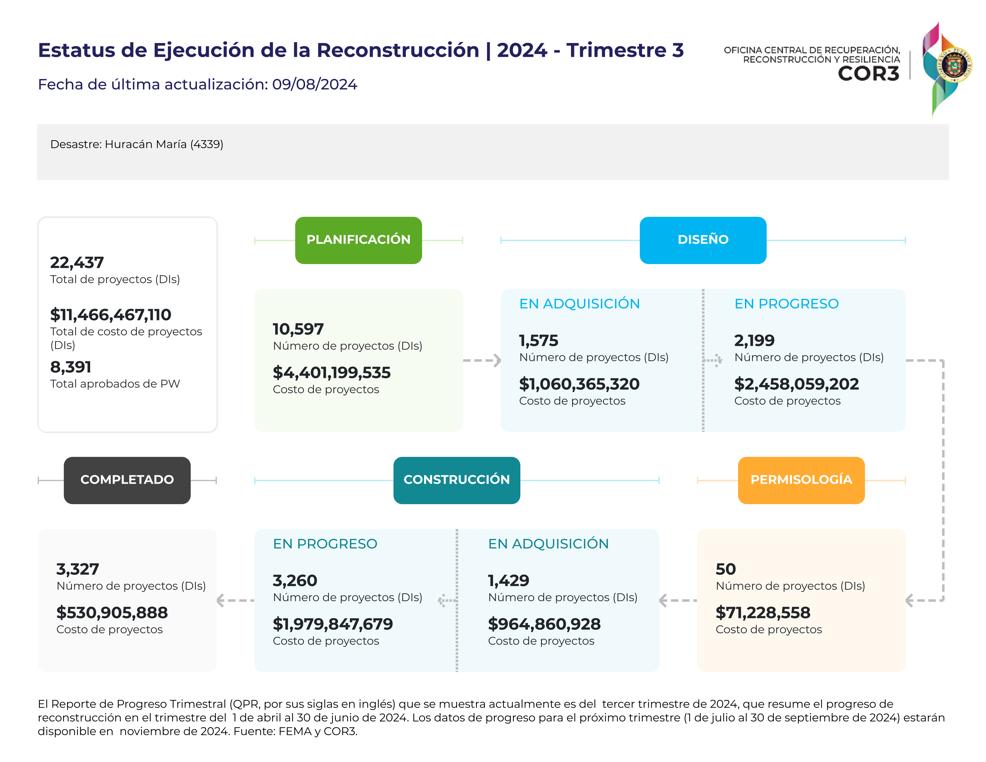 Según datos más recientes publicados en el Portal de Transparencia de la Oficina Central de Recuperación, Reconstrucción y Resiliencia (“COR3”) y los informes trimestrales correspondientes al tercer trimestre de 2024 relacionados al huracán María, los proyectos de obras permanentes financiados por FEMA Public Assistance en Puerto Rico alcanzan un total de $11,466 millones Esto incluyendo todos los tipos de solicitantes, municipios, agencias y entidades sin fines de lucro. Sin embargo, de esta suma, solo $530 millones han sido reportados como “completados”, lo que representa apenas el 4.6% del total. Adicionalmente, $2,510 millones corresponden a proyectos que están completados o en proceso de construcción, lo que equivale a solo un 21.9%. Estos datos reflejan una brecha sustancial en el avance de la reconstrucción de la isla.