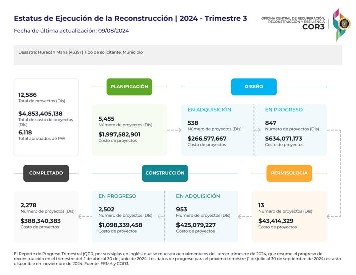 Este análisis está directamente relacionado con el Programa de Asistencia Pública de FEMA, el cual financia la mayor parte de los proyectos de recuperación en la isla. La información utilizada para calcular el IRE4339 Q3 fue actualizada en mes de agosto de 2024 por la Oficina Central de Recuperación (COR3), proporcionando una fotografía precisa y actualizada del estado de los proyectos en este momento. Cualquier esfuerzo adicional o progreso en la ejecución de los mismos se reflejará en el próximo informe trimestral, que será publicado en noviembre de 2024, lo que permitirá una evaluación continua y actualizada del avance hacia la recuperación total de Puerto Rico.