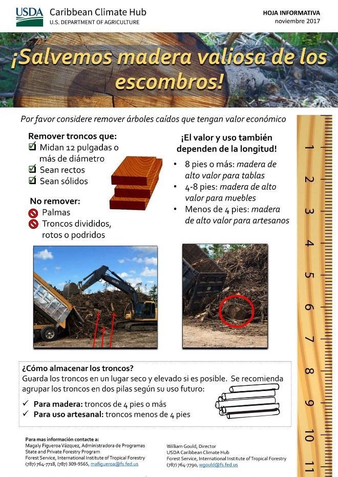 El Centro Climático del Caribe del USDA y el Instituto Internacional de Dasonomía Tropical del Servicio Forestal (IITF) están colaborando para promover el rescate de árboles caídos para utilizar su madera y educar sobre el potencial que hay en Puerto Rico para la producción sostenible de madera Esta colaboración también busca promover proyectos comunitarios de silvicultura.