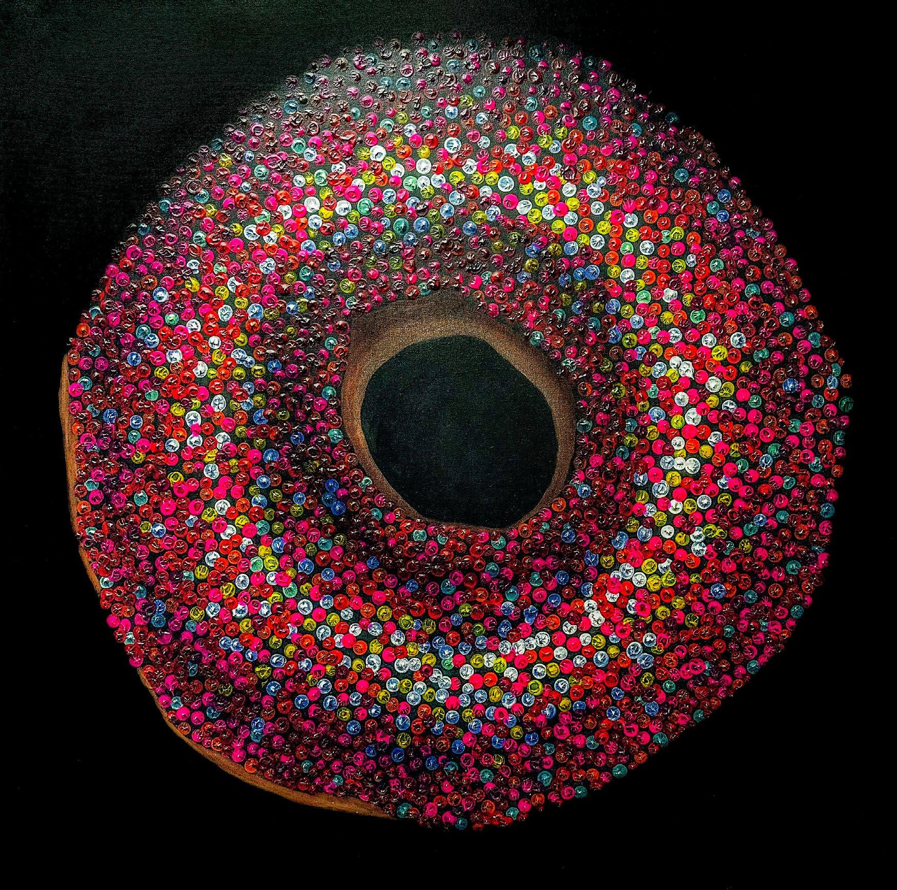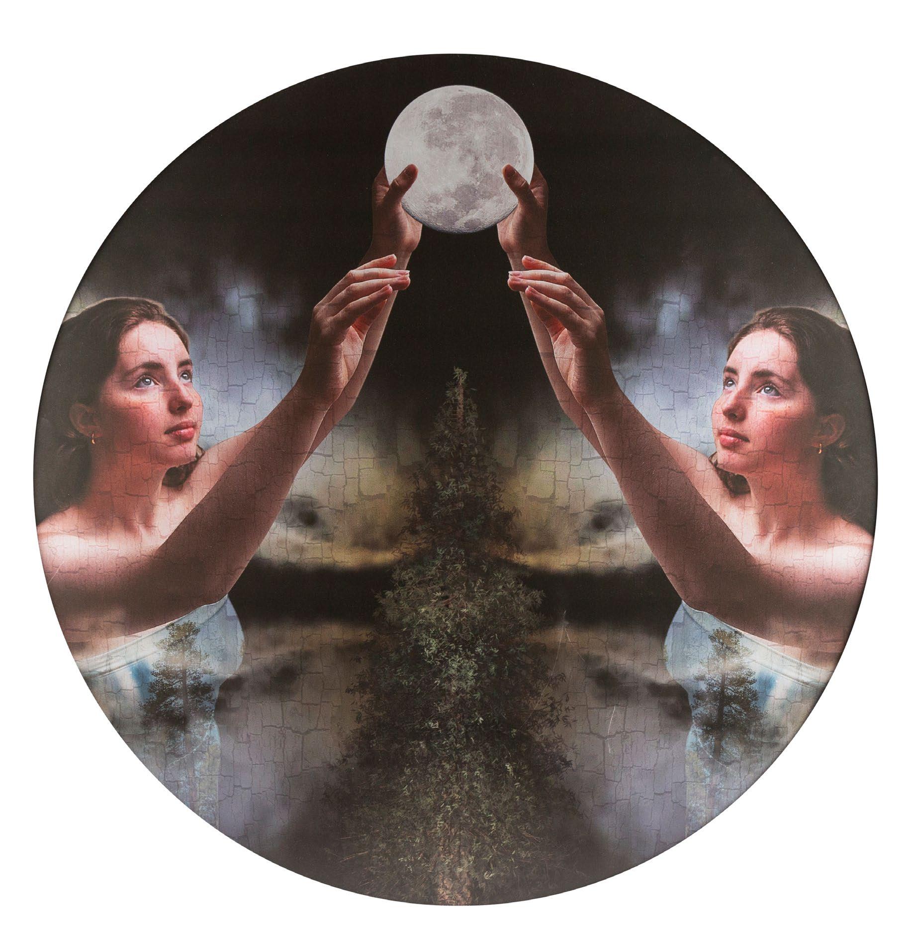 Fotografía, intervenida, collage digital, pintura automotriz sobre madera diámetro 110 cm | 2024