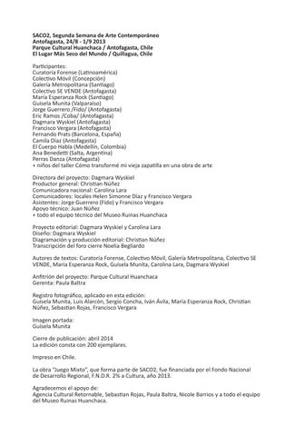 SACO2, Segunda Semana de Arte Contemporáneo Antofagasta, 24/8 - 1/9 2013 Parque Cultural Huanchaca / Antofagasta, Chile El Lugar Más Seco del Mundo / Quillagua, Chile Participantes: Curatoría Forense (Latinoamérica) Colectivo Móvil (Concepción) Galería Metropolitana (Santiago) Colectivo SE VENDE (Antofagasta) María Esperanza Rock (Santiago) Guisela Munita (Valparaíso) Jorge Guerrero /Fido/ (Antofagasta) Eric Ramos /Coba/ (Antofagasta) Dagmara Wyskiel (Antofagasta) Francisco Vergara (Antofagasta) Fernando Prats (Barcelona, España) Camila Díaz (Antofagasta) El Cuerpo Habla (Medellín, Colombia) Ana Benedetti (Salta, Argentina) Perras Danza (Antofagasta) + niños del taller Cómo transformé mi vieja zapatilla en una obra de arte Directora del proyecto: Dagmara Wyskiel Productor general: Christian Núñez Comunicadora nacional: Carolina Lara Comunicadores: locales Helen Simonne Díaz y Francisco Vergara Asistentes: Jorge Guerrero (Fido) y Francisco Vergara Apoyo técnico: Juan Núñez + todo el equipo técnico del Museo Ruinas Huanchaca Proyecto editorial: Dagmara Wyskiel y Carolina Lara Diseño: Dagmara Wyskiel Diagramación y producción editorial: Christian Núñez Transcripción del foro cierre Noelia Begliardo Autores de textos: Curatoría Forense, Colectivo Móvil, Galería Metropolitana, Colectivo SE VENDE, María Esperanza Rock, Guísela Munita, Carolina Lara, Dagmara Wyskiel Anfitrión del proyecto: Parque Cultural Huanchaca Gerenta: Paula Baltra Registro fotográfico, aplicado en esta edición: Guísela Munita, Luis Alarcón, Sergio Concha, Iván Ávila, María Esperanza Rock, Christian Núñez, Sebastian Rojas, Francisco Vergara Imagen portada: Guísela Munita Cierre de publicación: abril 2014 La edición consta con 200 ejemplares. Impreso en Chile. La obra “Juego Mixto”, que forma parte de SACO2, fue financiada por el Fondo Nacional de Desarrollo Regional, F.N.D.R. 2% a Cultura, año 2013. Agradecemos el apoyo de: Agencia Cultural Retornable, Sebastian Rojas, Paula Baltra, Nicole Barrios y a todo el equipo del Museo Ruinas Huanchaca. 2