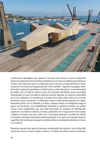 construcción ideológica que separa lo humano del animal, el amor tradicional expresa la represión de los instintos selváticos en pro de una nobleza que habita en la idea. Esta represión (que es constitutiva de la cultura), se expresaría de la mejor manera en la conciencia desgraciada del “amor sufrido”. Soportar los golpes, título de la obra, expresa la paradoja o el dilema de un amor basado en una exterioridad de poder: por un lado la cultura y por otro el poder del hábito como necesidad naturalizada. El amor de toda la vida de nuestros abuelos, la violencia escondida en él, los maltratos y la resistencia a cambiar de rumbo sobre todo en el mundo femenino, viene a ponernos a reflexionar sobre si todo tiempo pasado fue mejor. Haciendo guiños con la filosofía y la física, Jackson realiza un inteligente juego al poner en circulación una multiplicidad, situando la resistencia desde una esfera crítica, como negatividad, por otro lado poniendo en suspenso la filosofía del sujeto de una manera cuántica, es decir, acabando con la separación entre sujeto y objeto al montar una obra sobre una “naturaleza alterada” (mueble de metal) y la piedra montada (naturaleza deshumanizada). Si el peso de la piedra altera la superficie del metal que la soporta, también altera la realidad del tiempo en honor a su materia. Pareciera hoy por hoy, que los intereses combinados de creación, son el ethos del momento como un nuevo sujeto creativo. El trabajo de artista visual venezolano 94