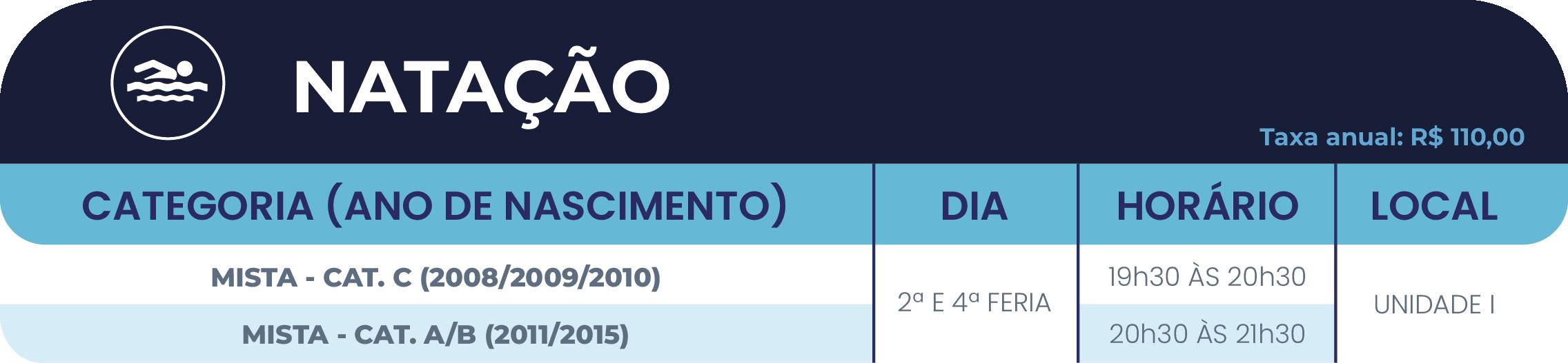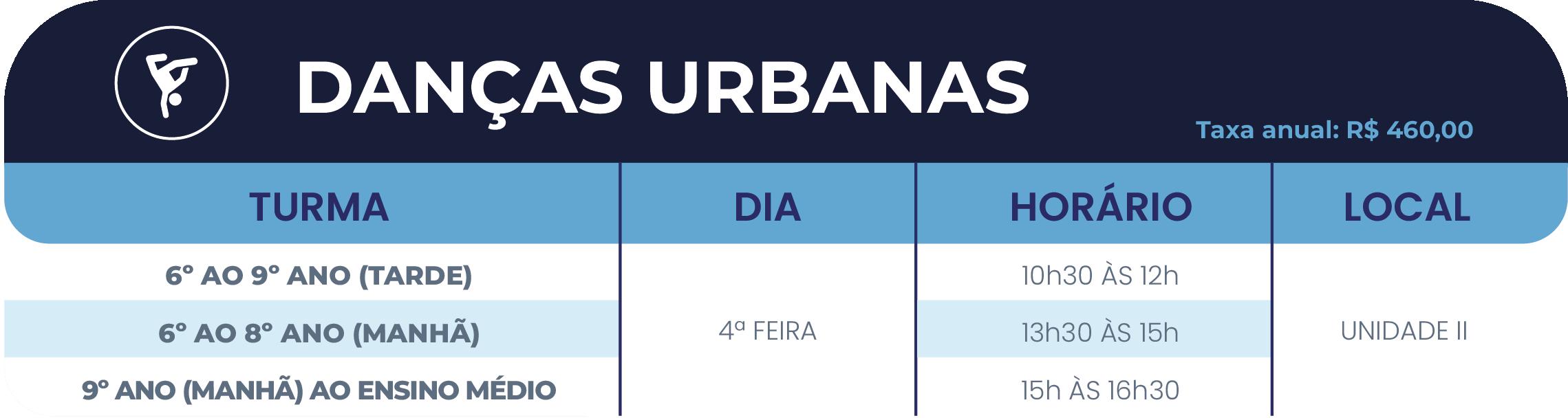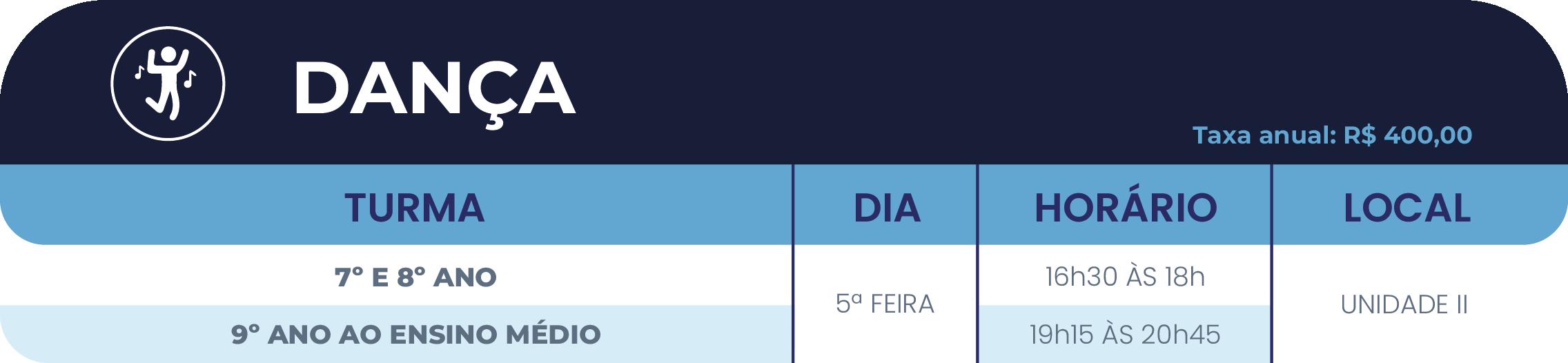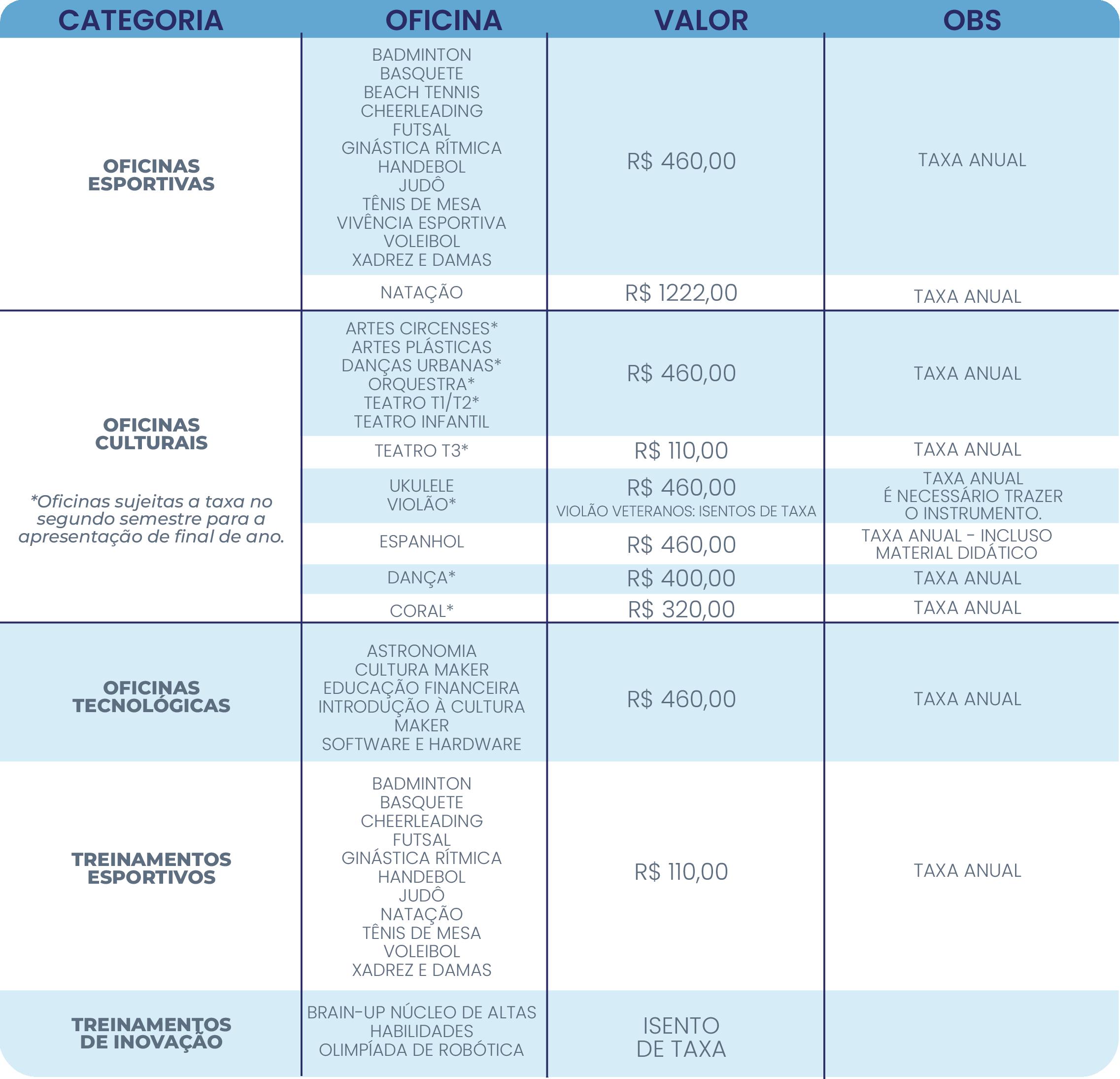 • 2º ano do Ensino Fundamental ao Ensino Médio: até 05(cinco) atividades, sendo, no máximo, 02(duas) esportivas (se uma delas for a natação) e 03(três) nas demais áreas de atuação (cultural e/ou inovação).