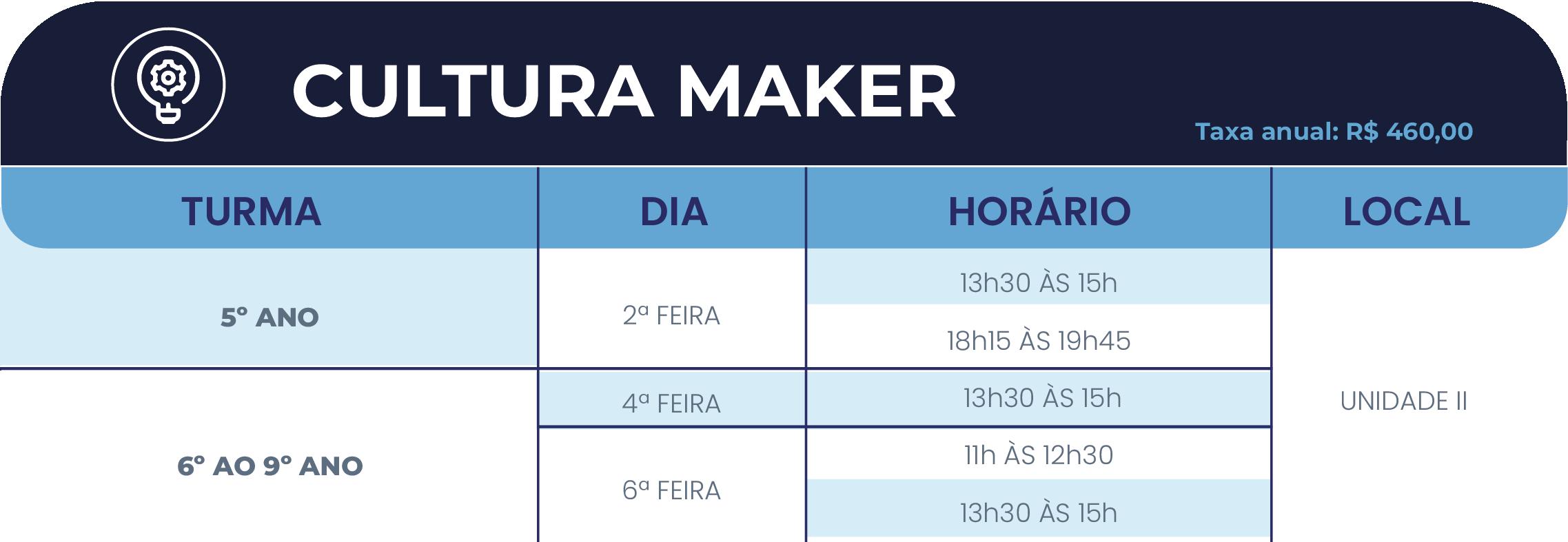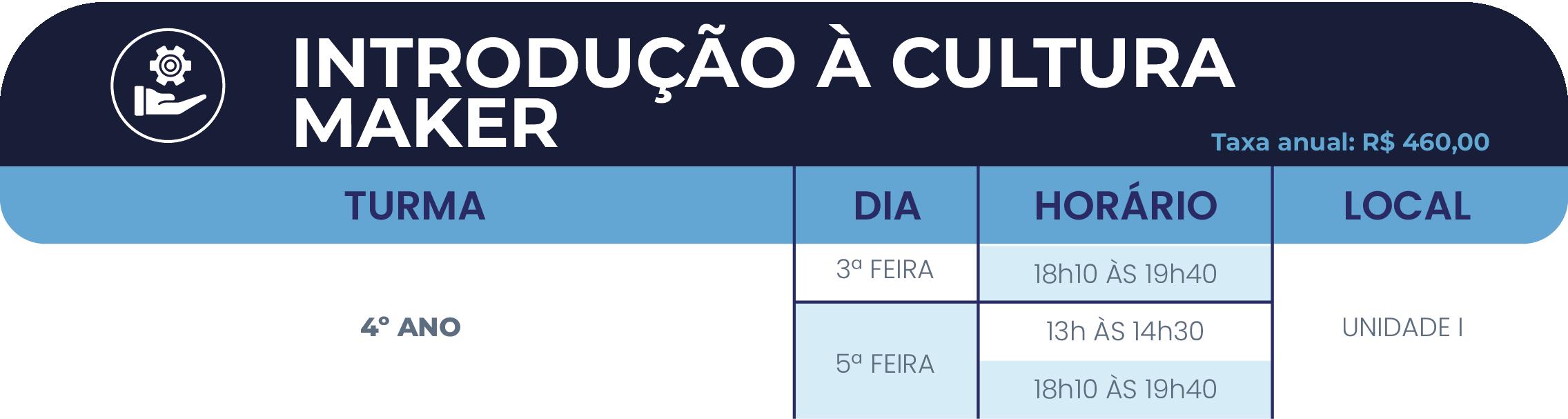 Na Introdução à Cultura Maker, os estudantes são desafiados em atividades envolvendo construção e programação de robôs. Sempre com muita interatividade e diversão, as atividades oferecem uma base para que o aluno possa ingressar na Oficina de Cultura Maker, oferecida na Unidade II.