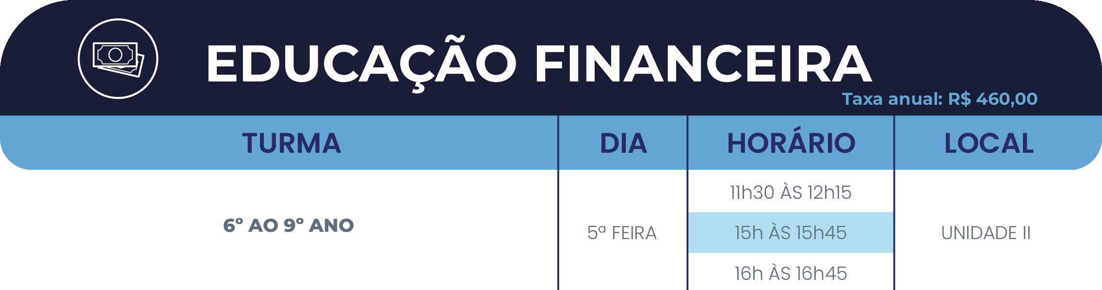 A Oficina de Educação Financeira tem como objetivo conceituar o valor do dinheiro no tempo, oferecendo ferramentas para que os estudantes tomem atitudes conscientes em relação ao próprio dinheiro; tornando-os capazes de resolver problemas e criar soluções inovadoras para questões de natureza financeira, por meio do uso de formulações matemáticas, calculadoras entre outras ferramentas tecnológicas.
