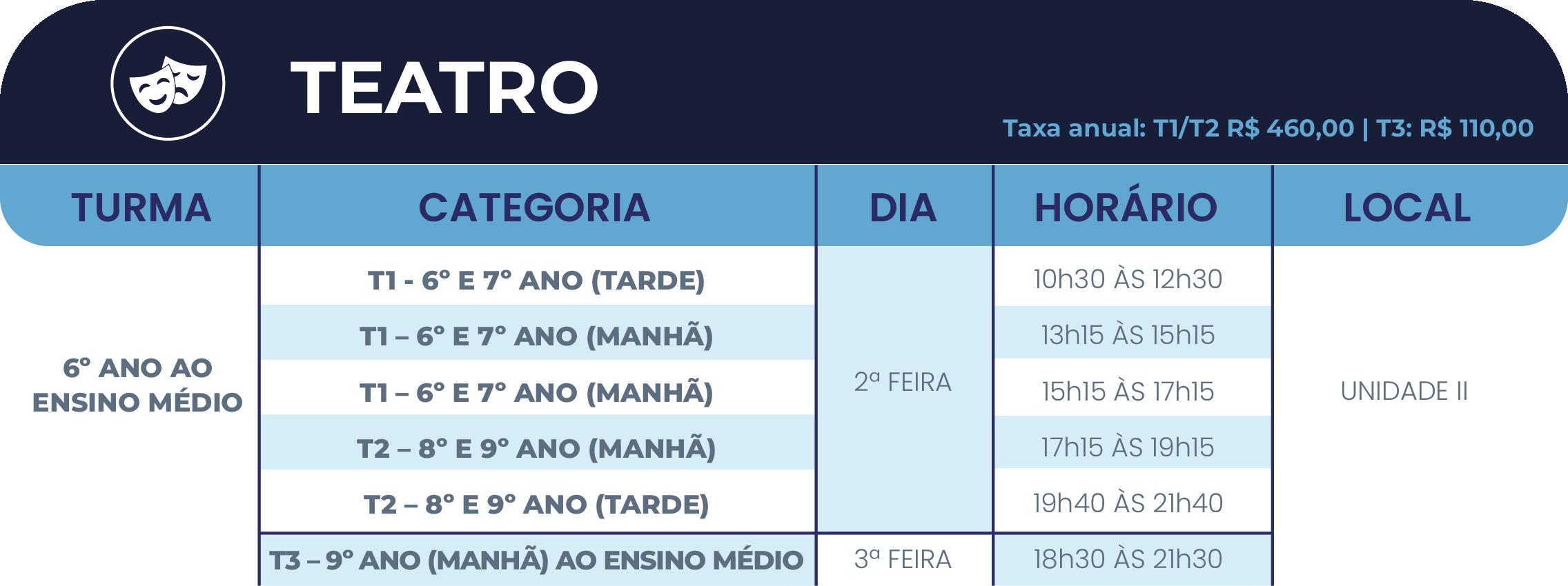 • As oficinas de Teatro terão uma cota de 08 vagas (por turma) para alunos que já cursaram o nível anterior.