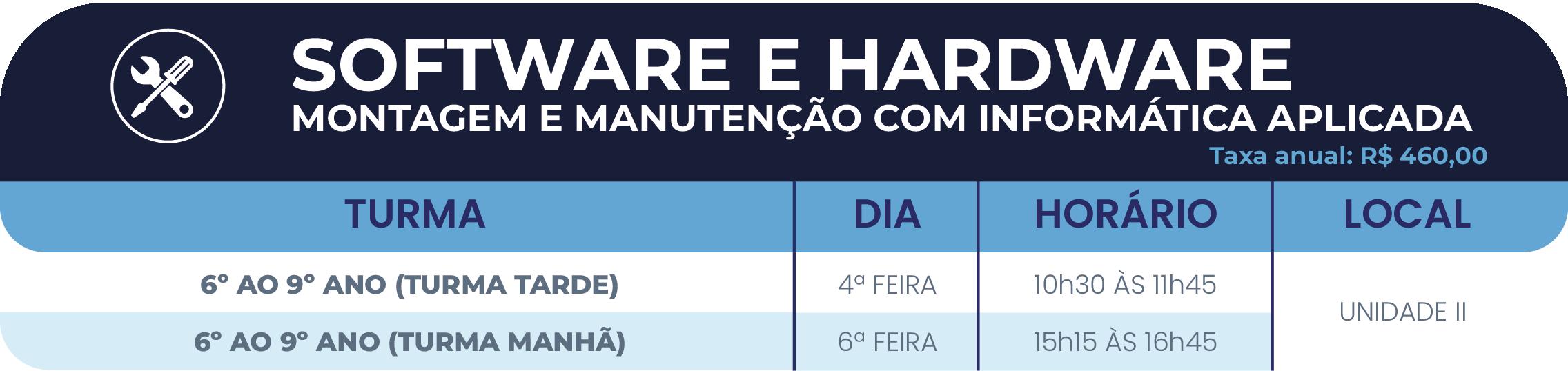 De maneira prática e lúdica, os estudantes vivenciam situações de montagem, manutenção e desmontagem de computadores, instalação de sistemas operacionais e aplicativos, bem como recebem noções de arquitetura de rede, conectividade e dispositivos de impressão e armazenamento de dados. O curso também apresenta os principais aplicativos do pacote Office (Word, Excel e PowerPoint), instrumentalizando os estudantes na elaboração de planilhas, gráficos, cartazes, trabalhos escolares (com índices e capítulos), mala direta, textos com hiperlinks, entre outros.