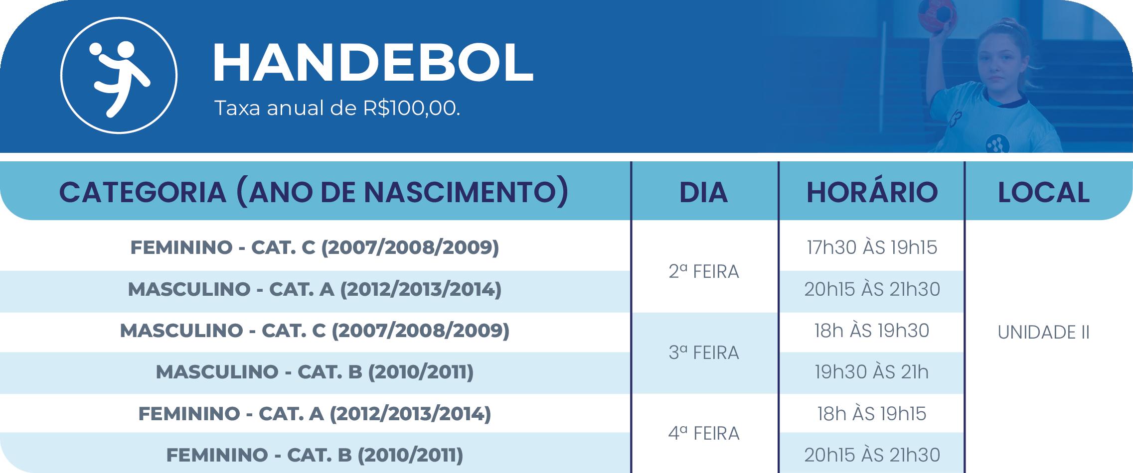 • 2º ano do Ensino Fundamental ao Ensino Médio: em até 04 (quatro) atividades, sendo, no máximo, 2(duas) esportivas (se uma delas for a natação).