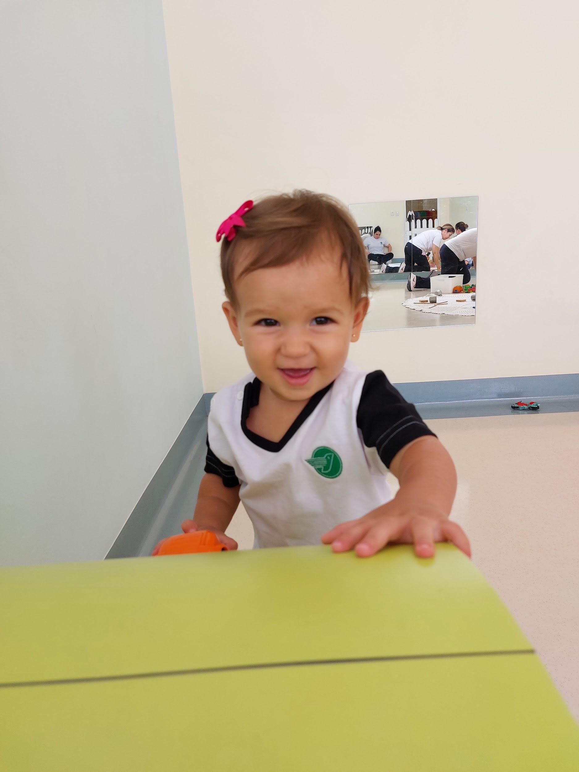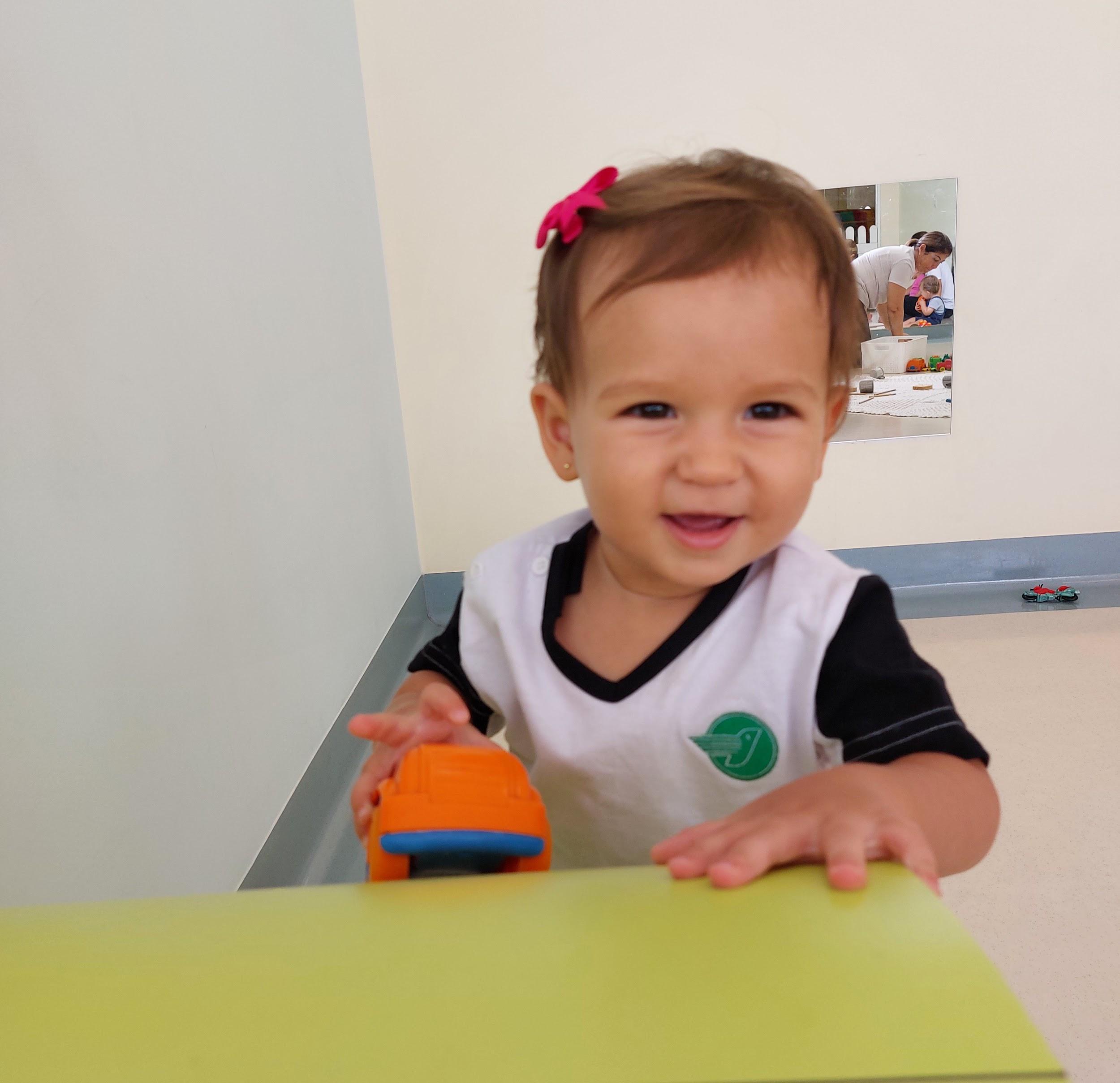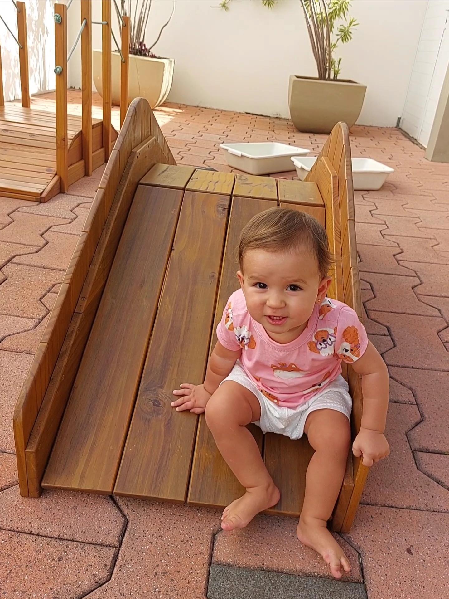 Ana se encanta com a rampa, onde brinca com um carrinho e uma moto. Seu sorriso aberto revela a alegria que nasce dos sons produzidos pelo carrinho, sobretudo quando um adulto o impulsiona. Ela acompanha cada movimento com atenção, deixando escapar risos que celebram o instante.