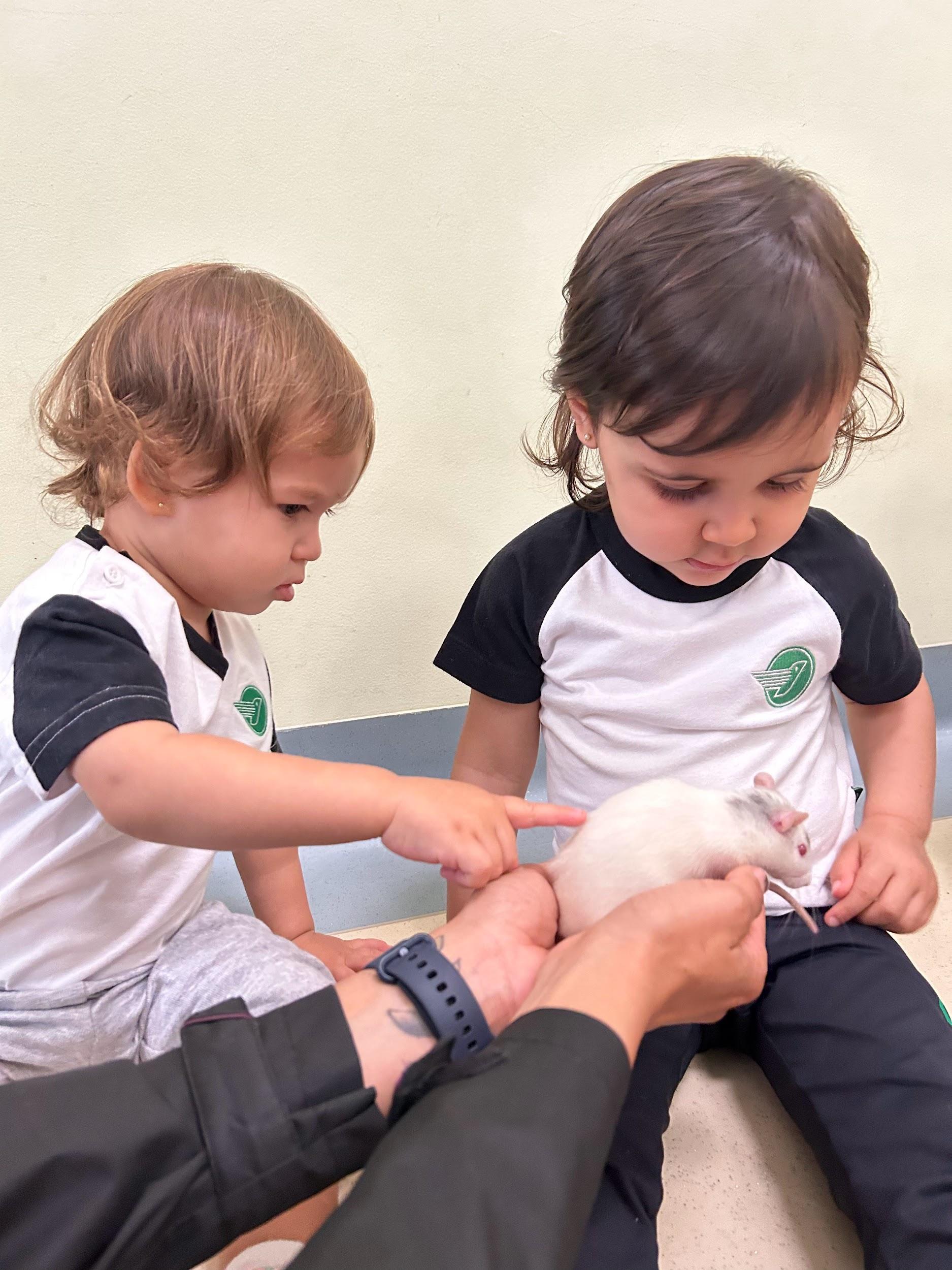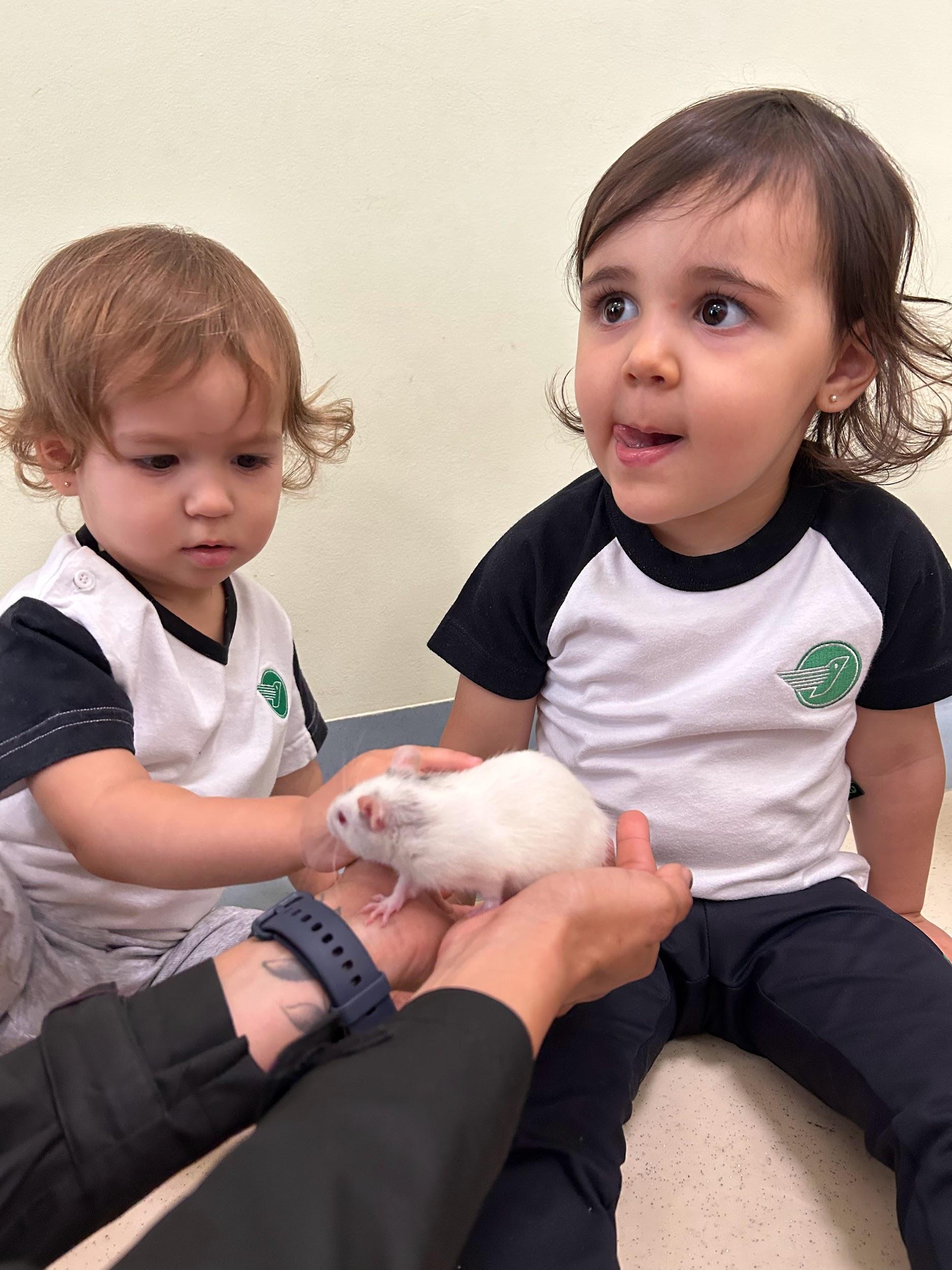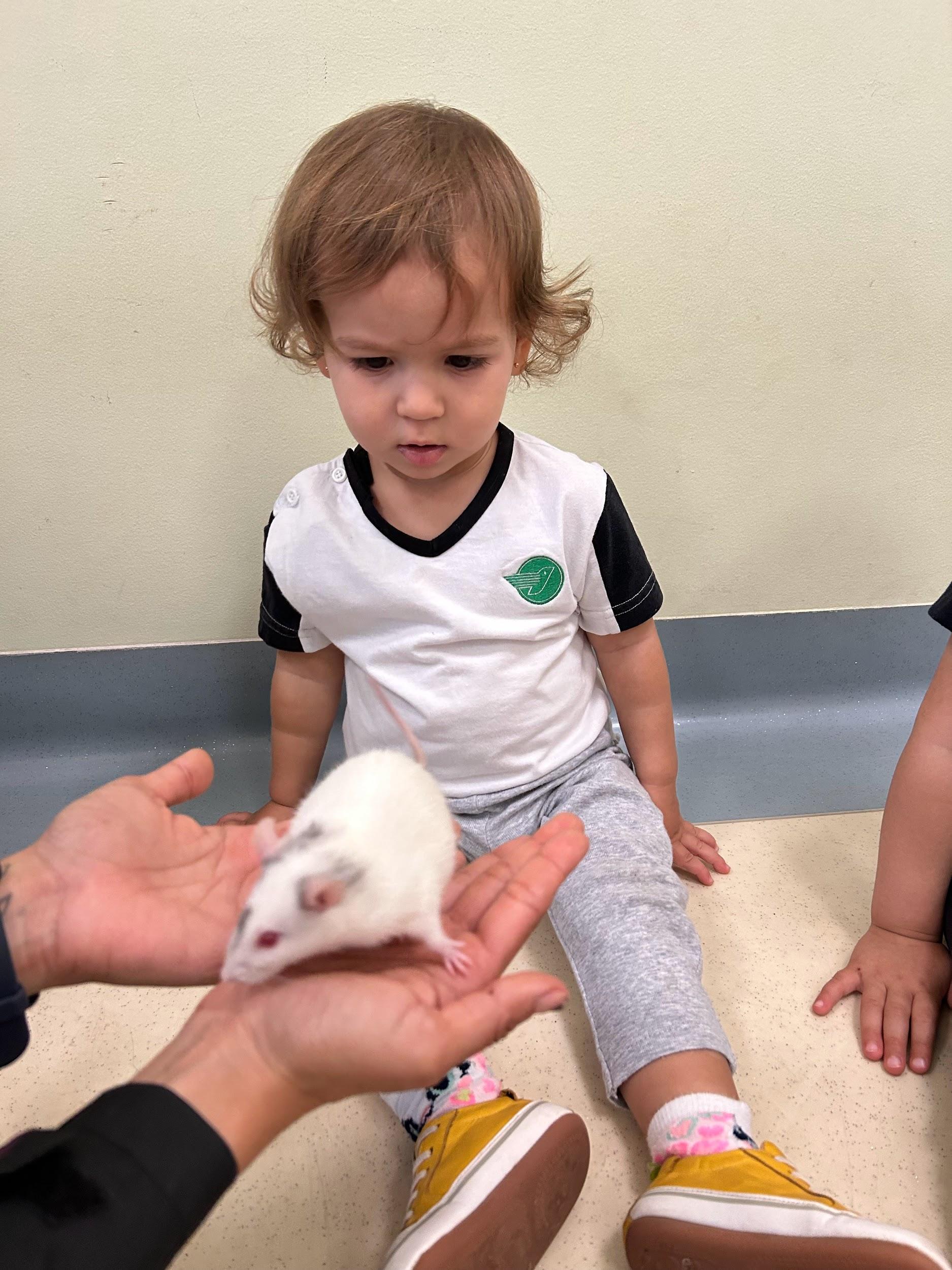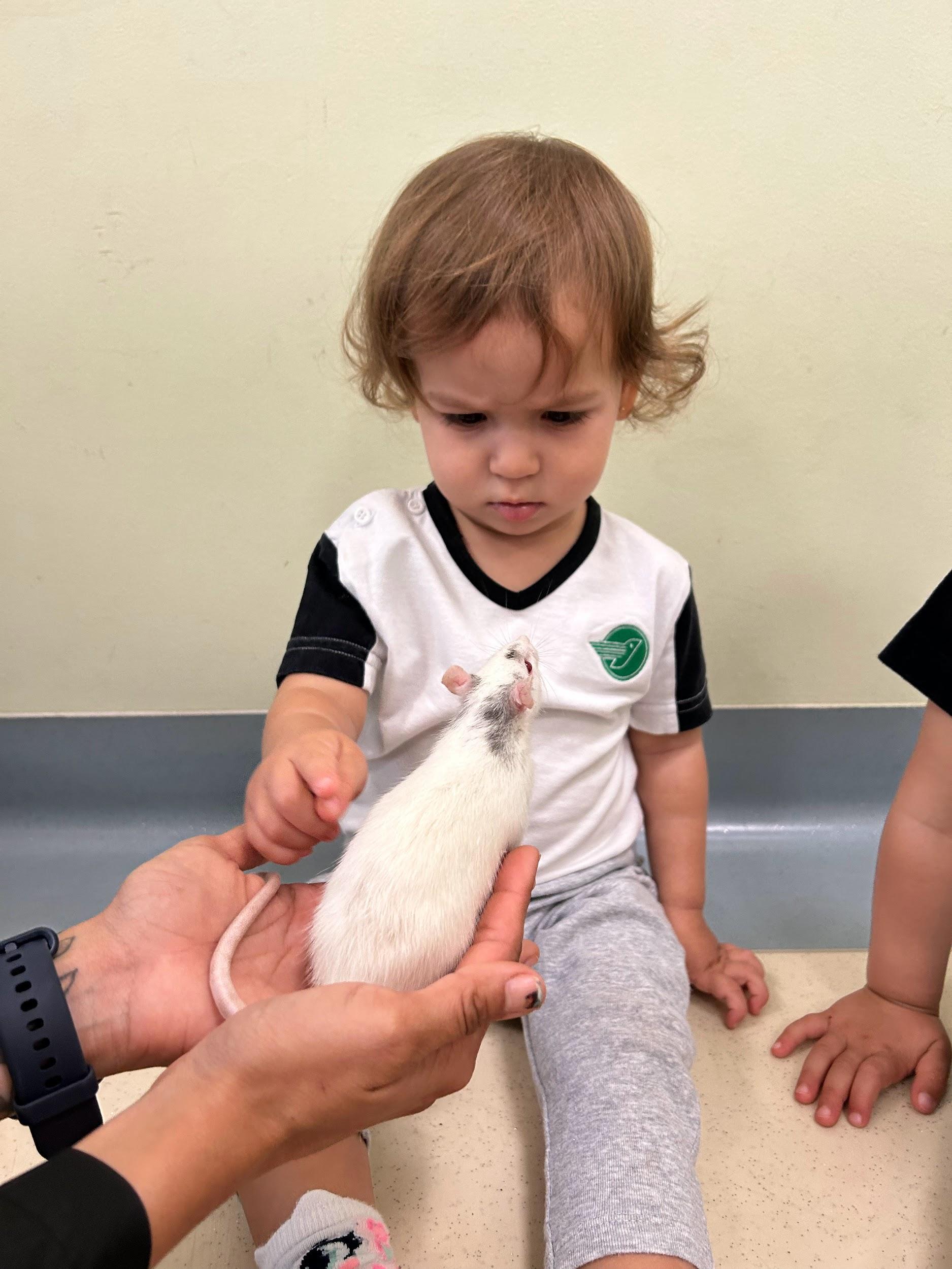 A ratinha repousa nas mãos do adulto, tranquila, enquanto Ana observa atentamente o pequeno animal. Seu rosto desconfiado e curioso acompanha cada gesto e movimento. Depois, com dedos delicados e cuidadosos, Ana se aproxima e toca suavemente as costas da ratinha, sentindo a maciez de seu pelo. Ana demonstra um grande carinho por animais, especialmente aqueles que vêm do quintal, acolhendo cada bichinho com muita atenção e ternura.