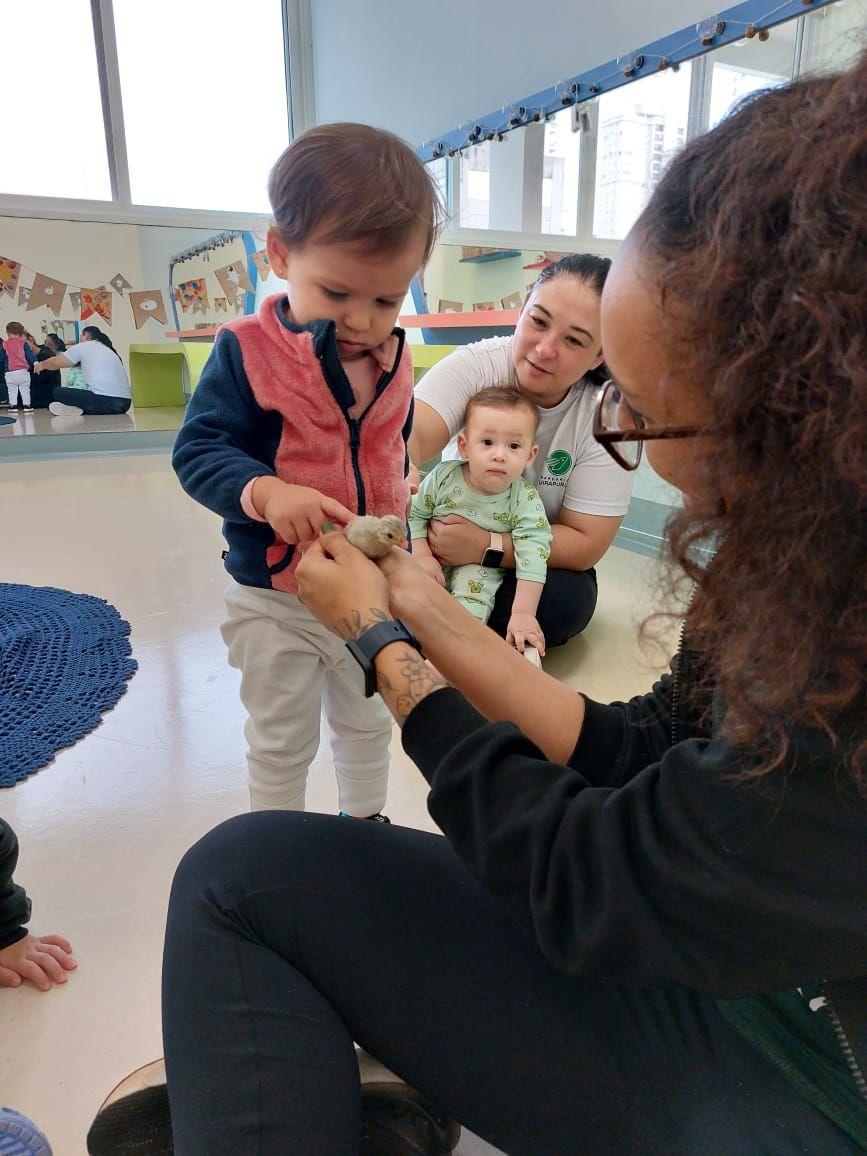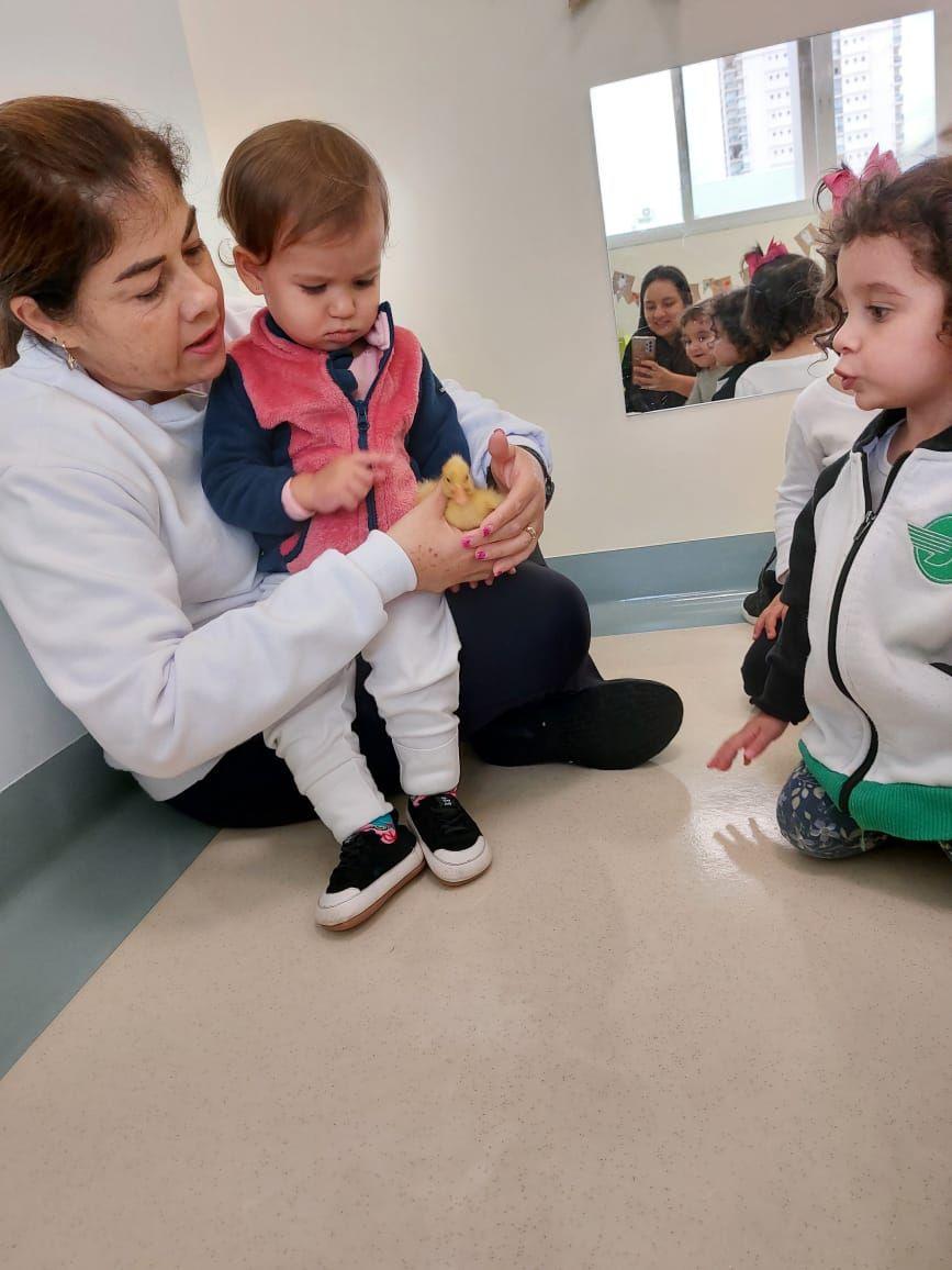 No colo do adulto, Ana está encantada enquanto toca delicadamente o patinho, estendendo o dedinho com cuidado. Em seguida, ela descobre um passarinho bem pequenino e fofinho, e novamente passa a mão sobre ele com atenção e ternura. Ana observa cada detalhe, absorvendo as curiosidades que o adulto compartilha sobre os animais. Esse momento é repleto de ternura e aprendizado, onde a curiosidade de Ana brilha enquanto ela se conecta com as pequenas criaturas ao seu redor.