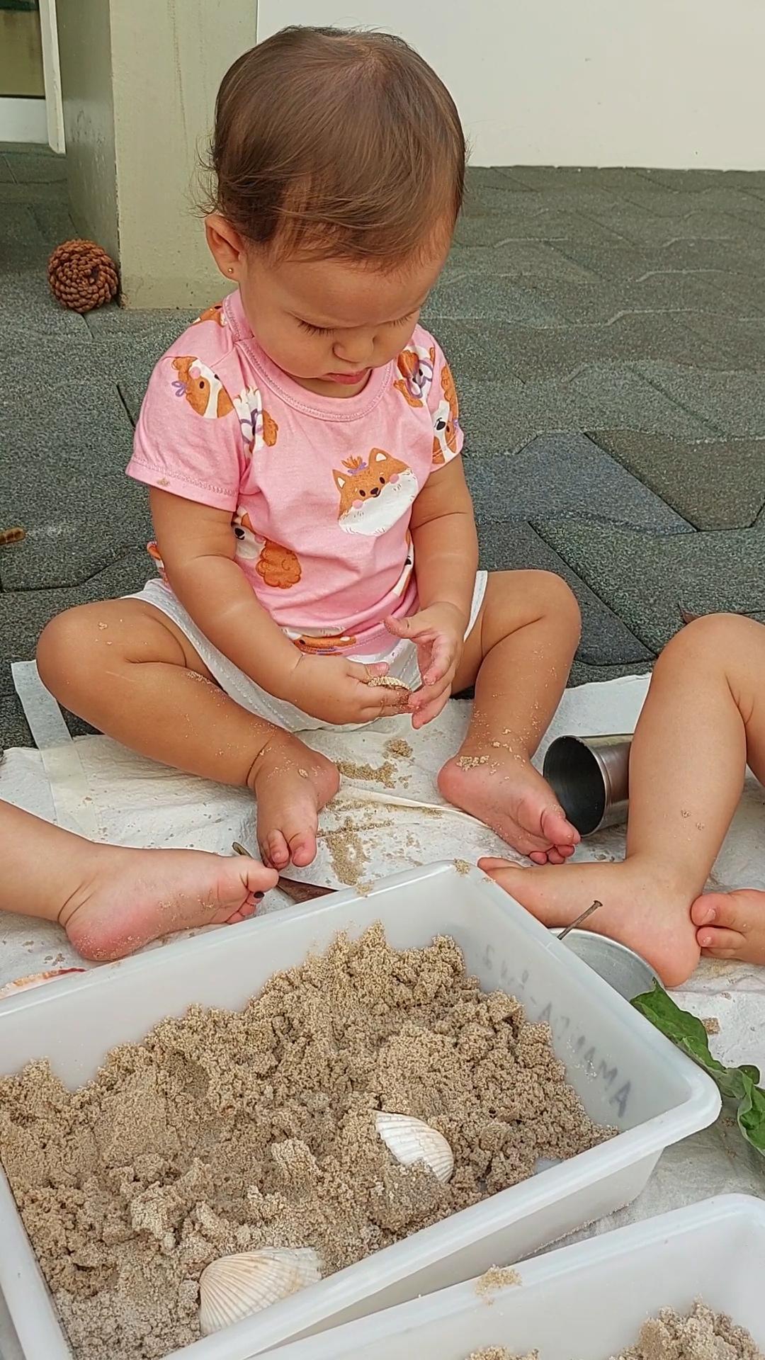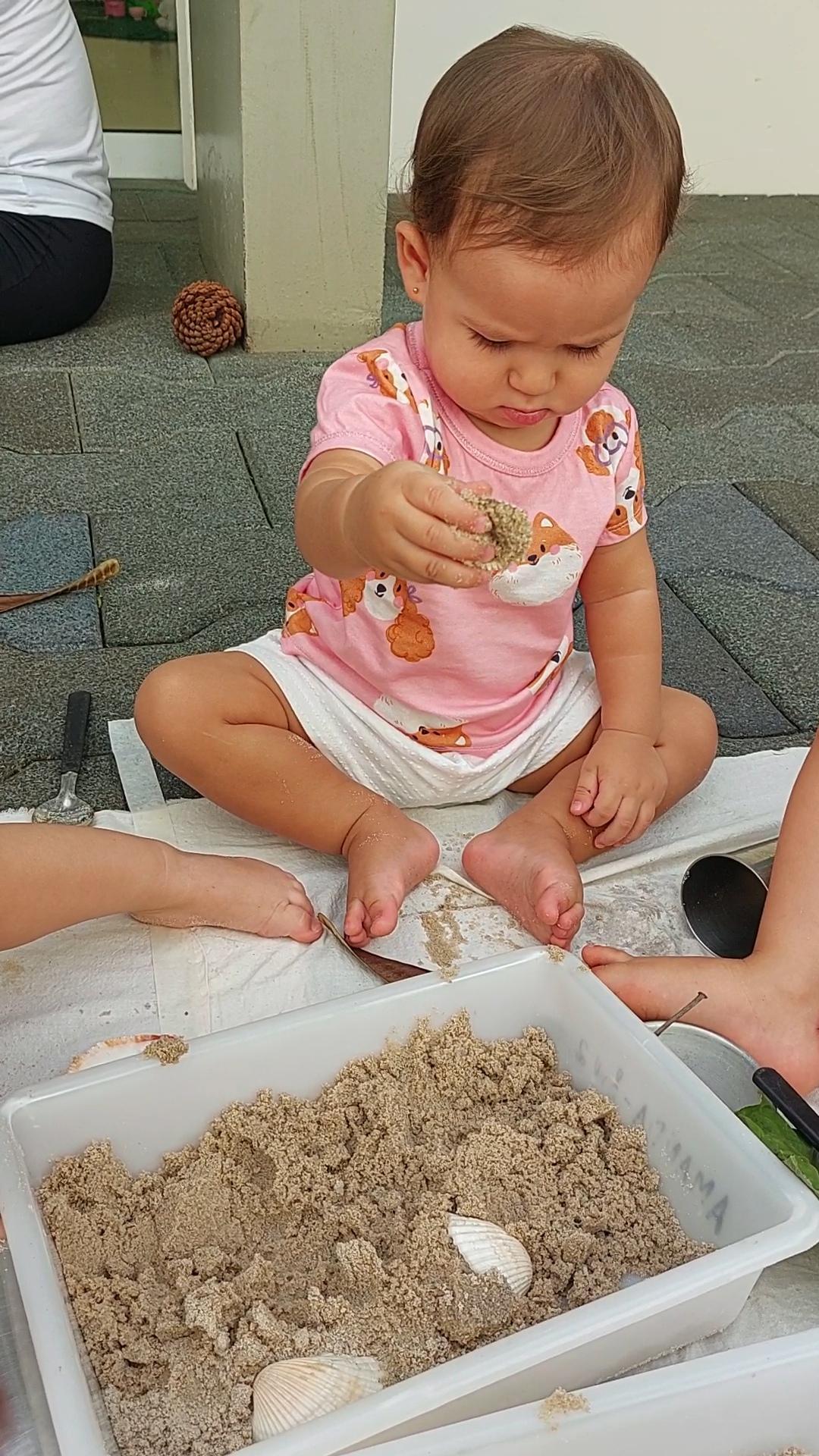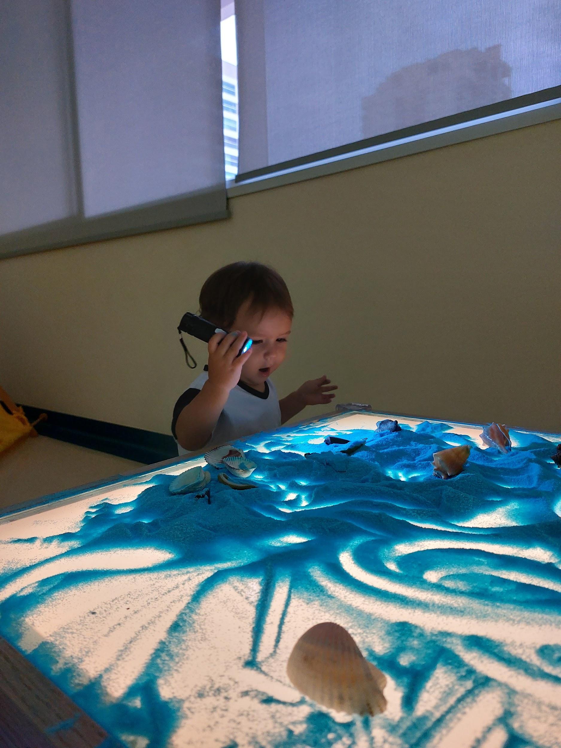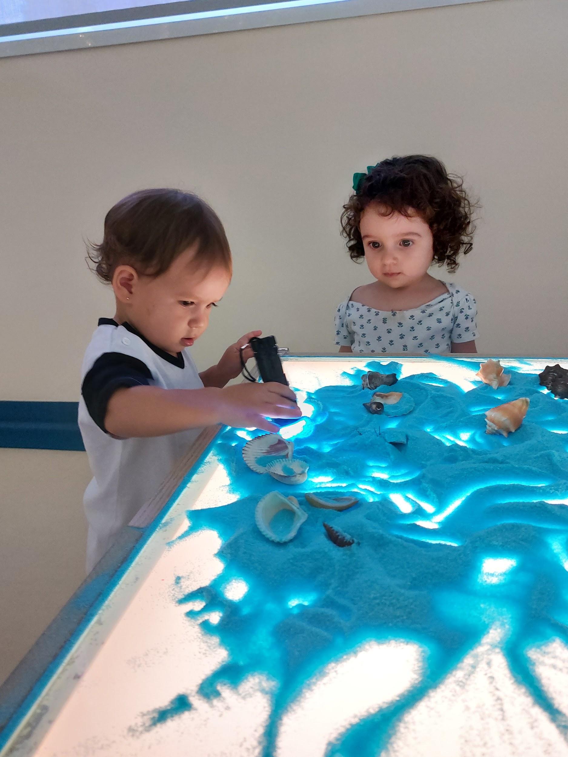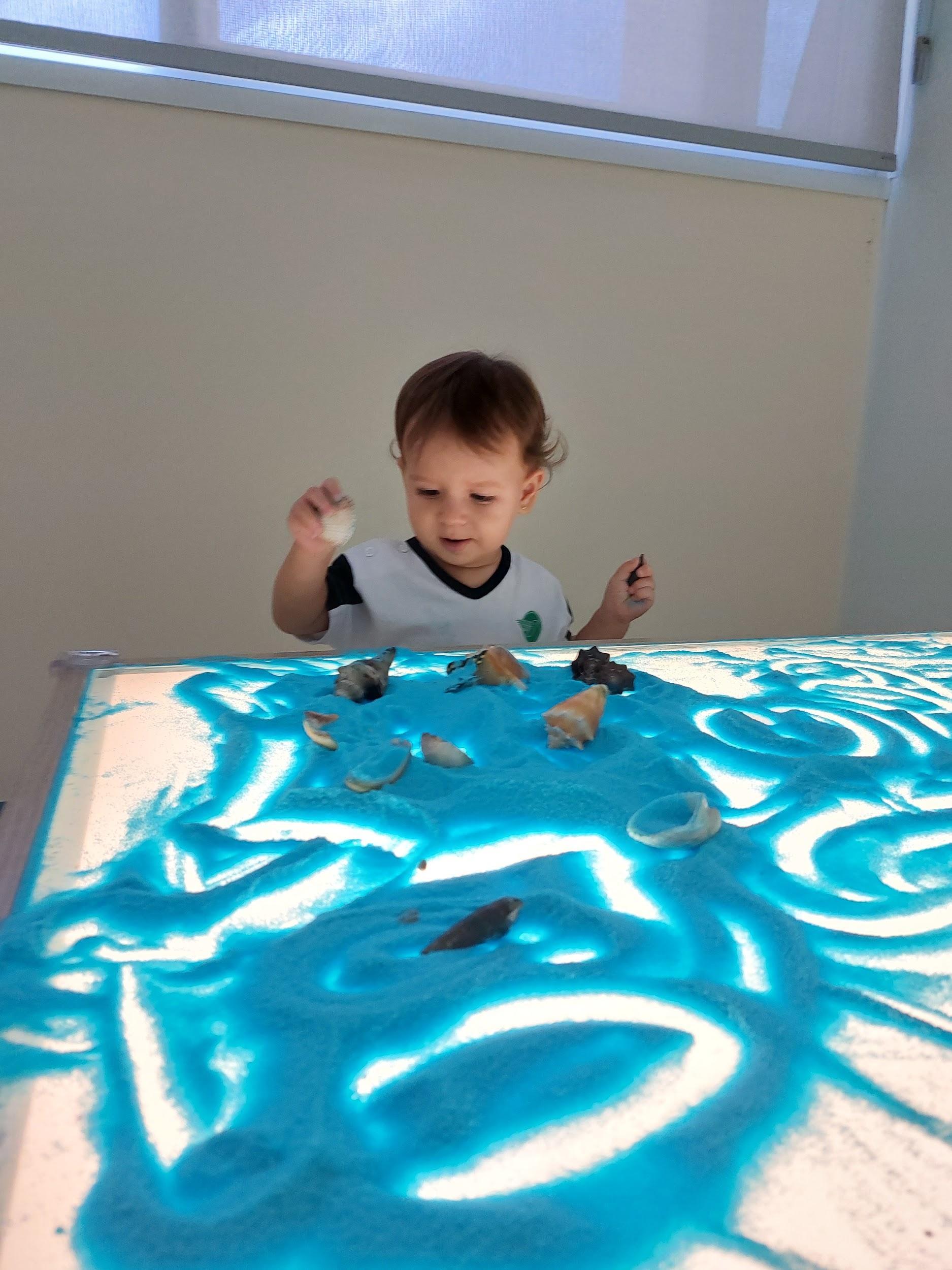 No parque, Ana se entrega a uma experiência sensorial em uma bandeja cheia de areia, como se por um instante estivesse à beira-mar. Entre os grãos, ela encontra conchas, pequenas memórias do oceano.