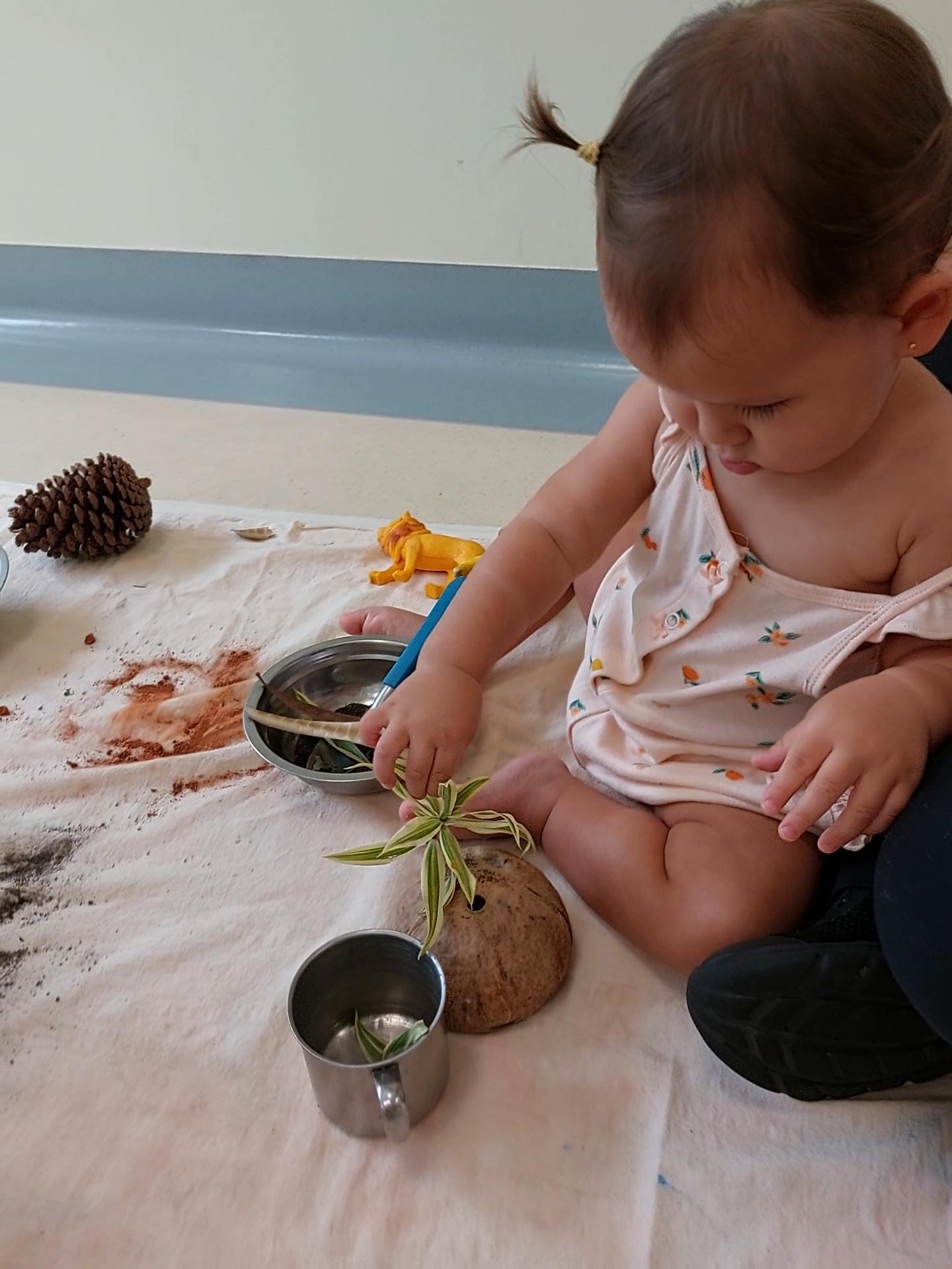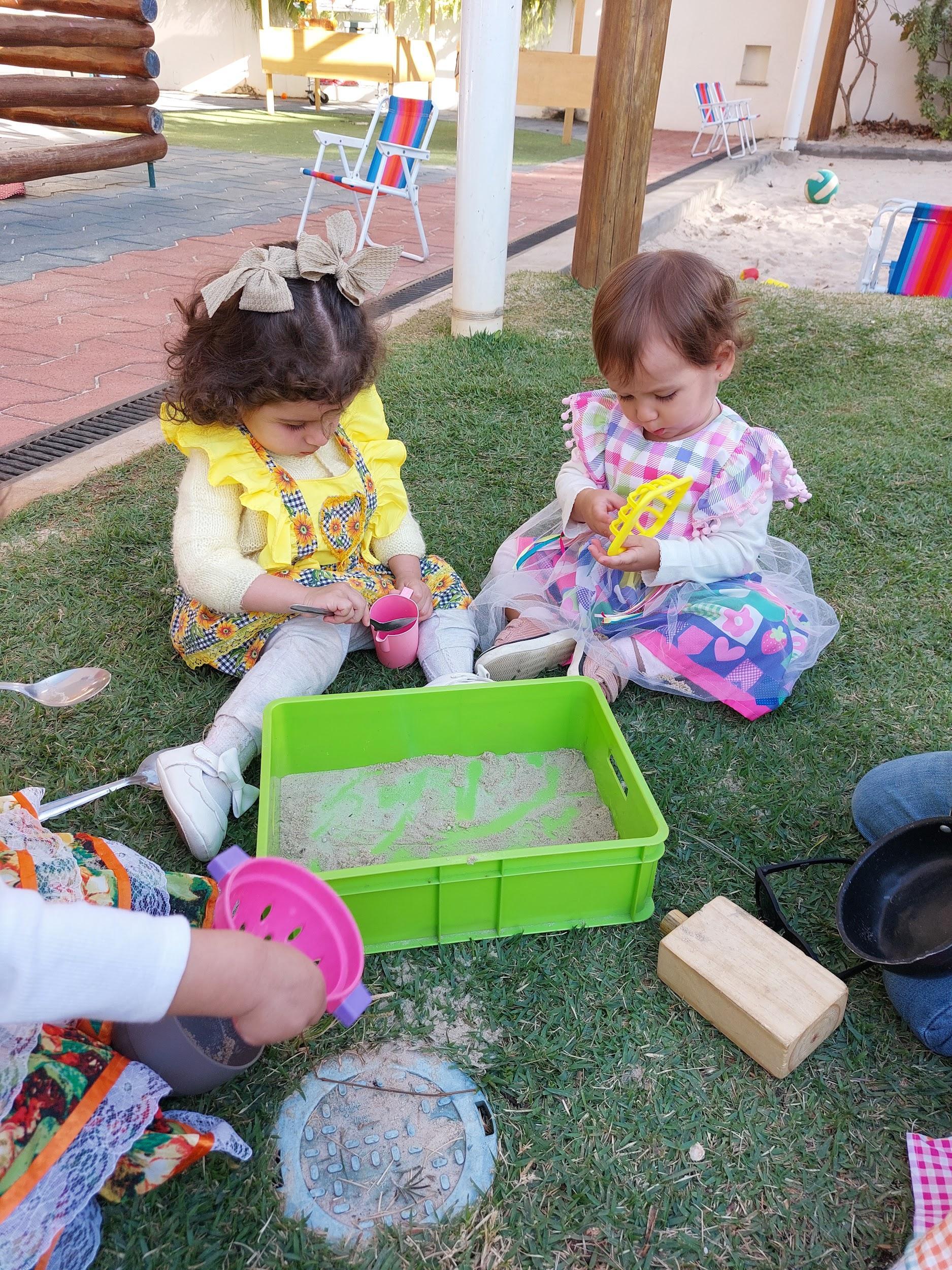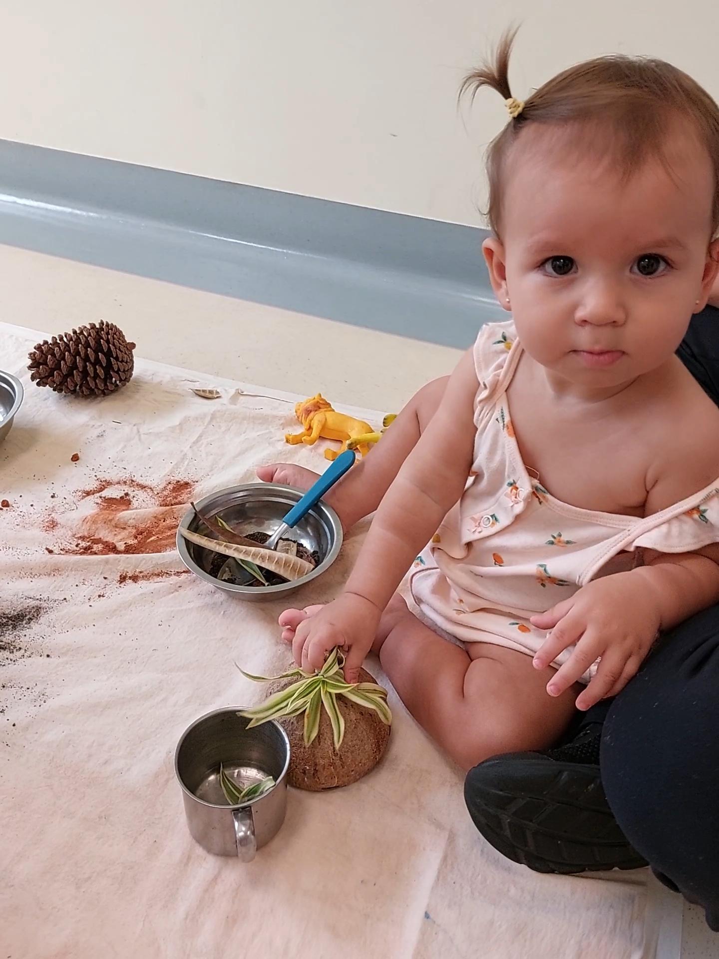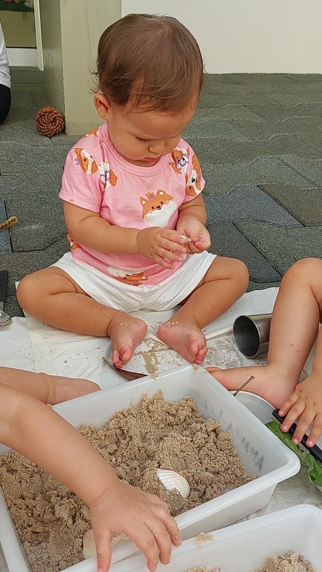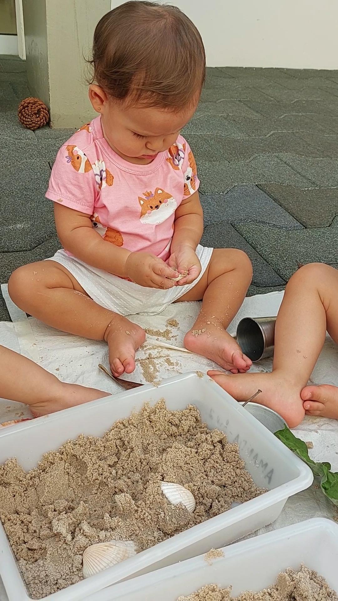 No parque, Ana se entrega a uma experiência sensorial em uma bandeja cheia de areia, como se por um instante estivesse à beira-mar. Entre os grãos, ela encontra conchas, pequenas memórias do oceano.