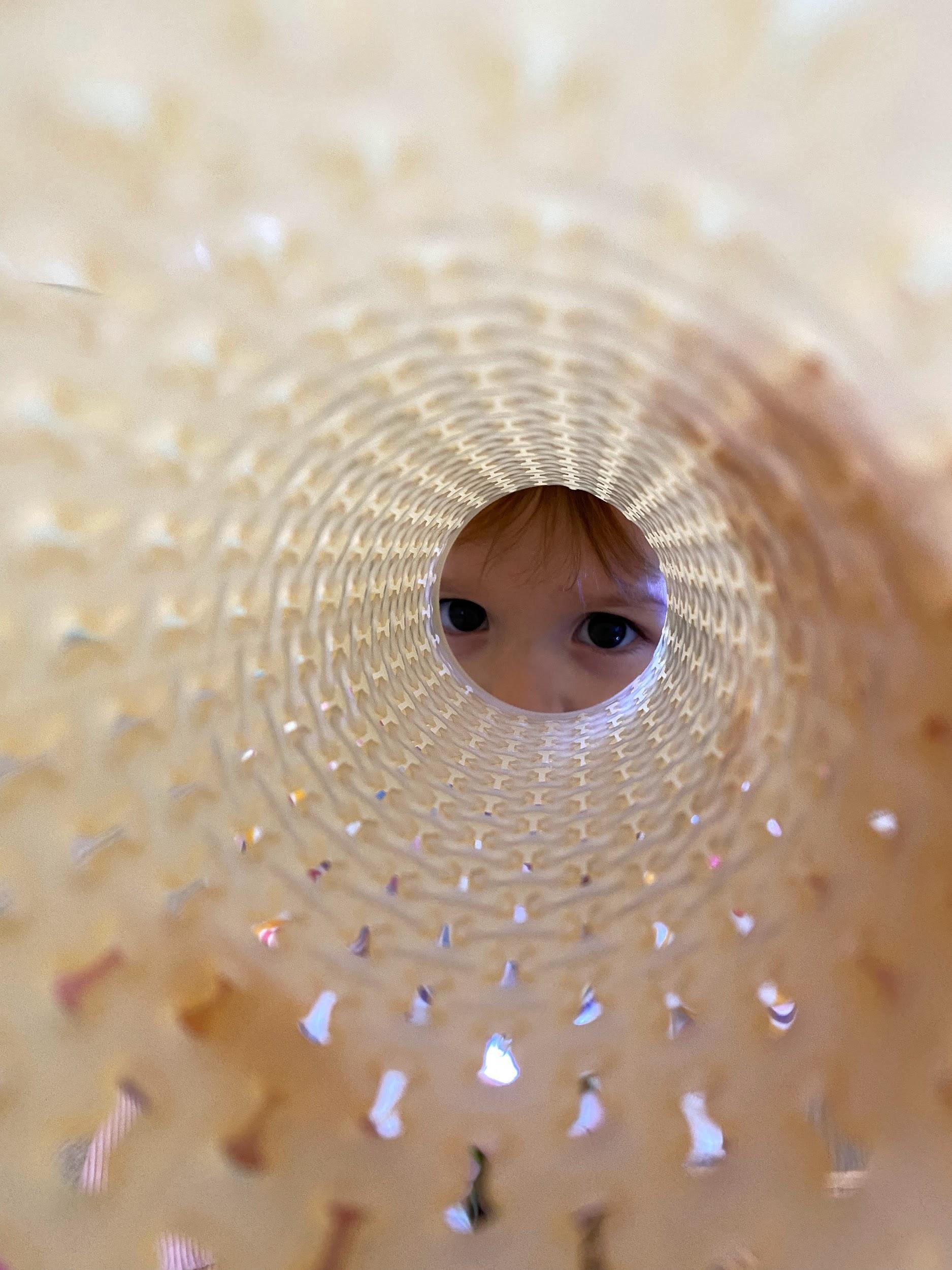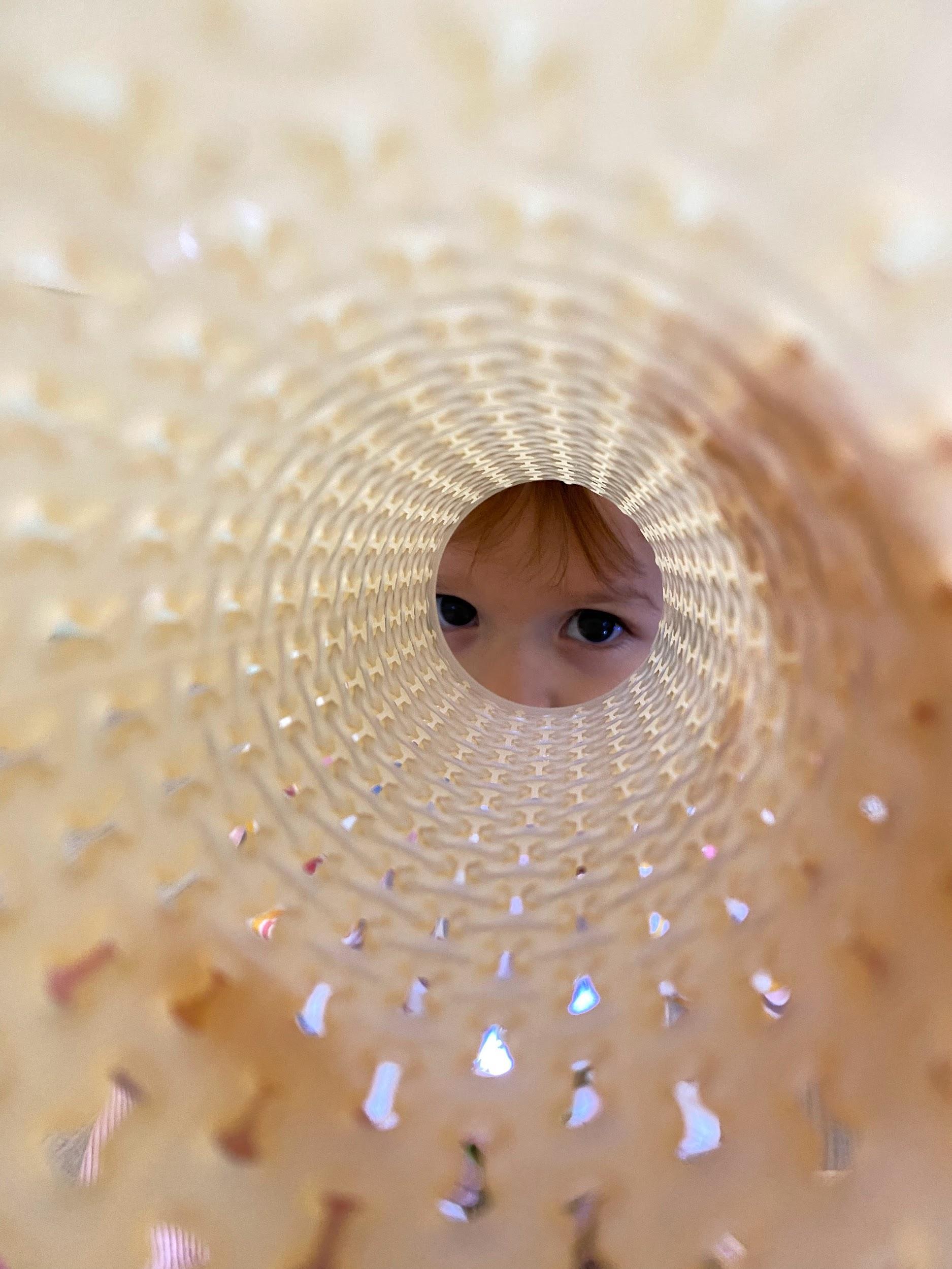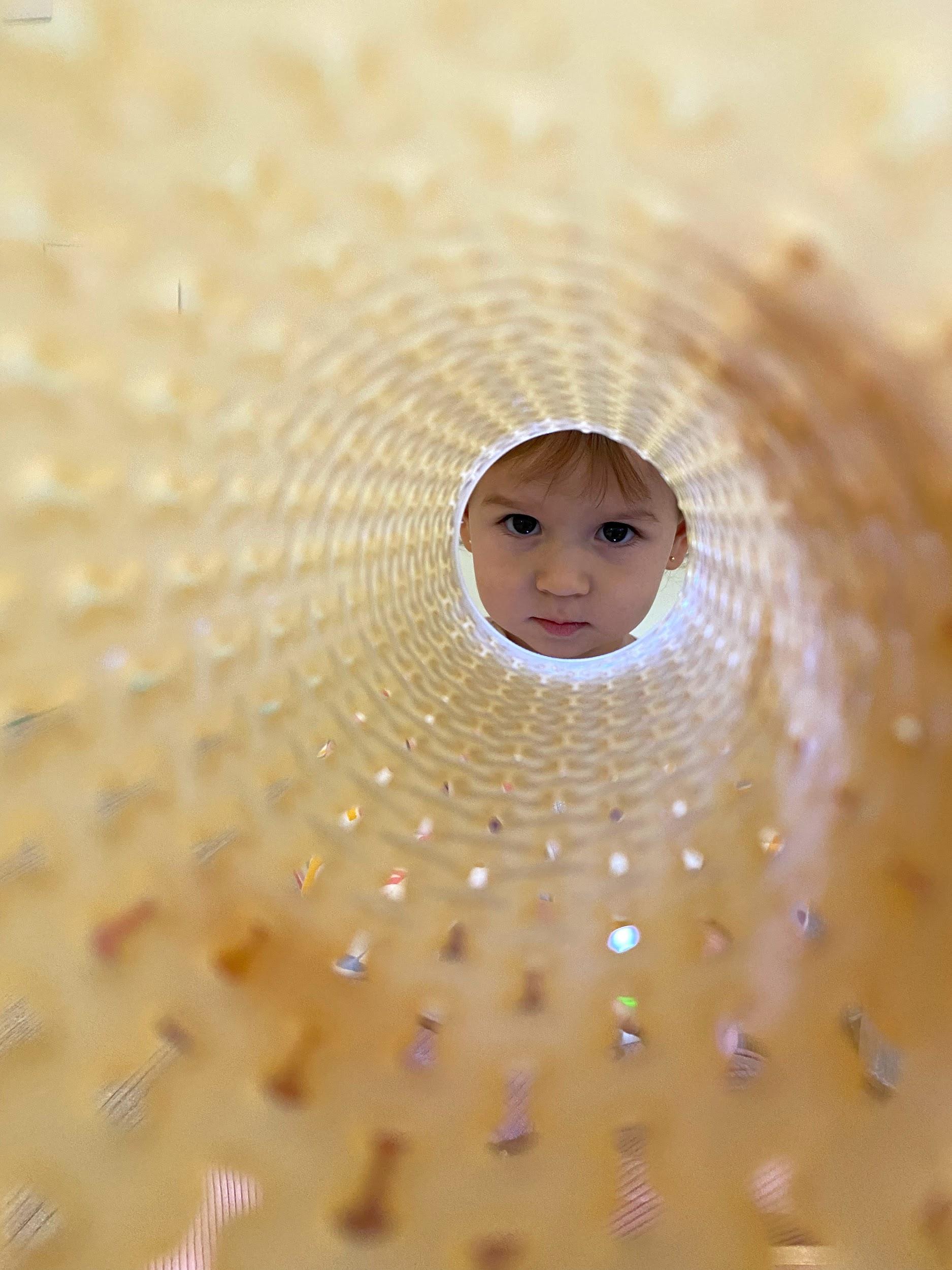 Ana explora um objeto que se assemelha a um pequeno cilindro, como um caleidoscópio, e o posiciona diante do rosto. Através dele, surge a imagem de seu rosto infantil, lindo e cheio de expressão, com um olhar fixo, sincero e genuíno. Esse olhar carrega curiosidade e ternura, refletindo a essência das qualidades que Ana sempre compartilha. É um instante de descoberta e encantamento, onde a beleza e a pureza de seu olhar se revelam, cativando quem observa e transformando a brincadeira em uma experiência de expressão pessoal.