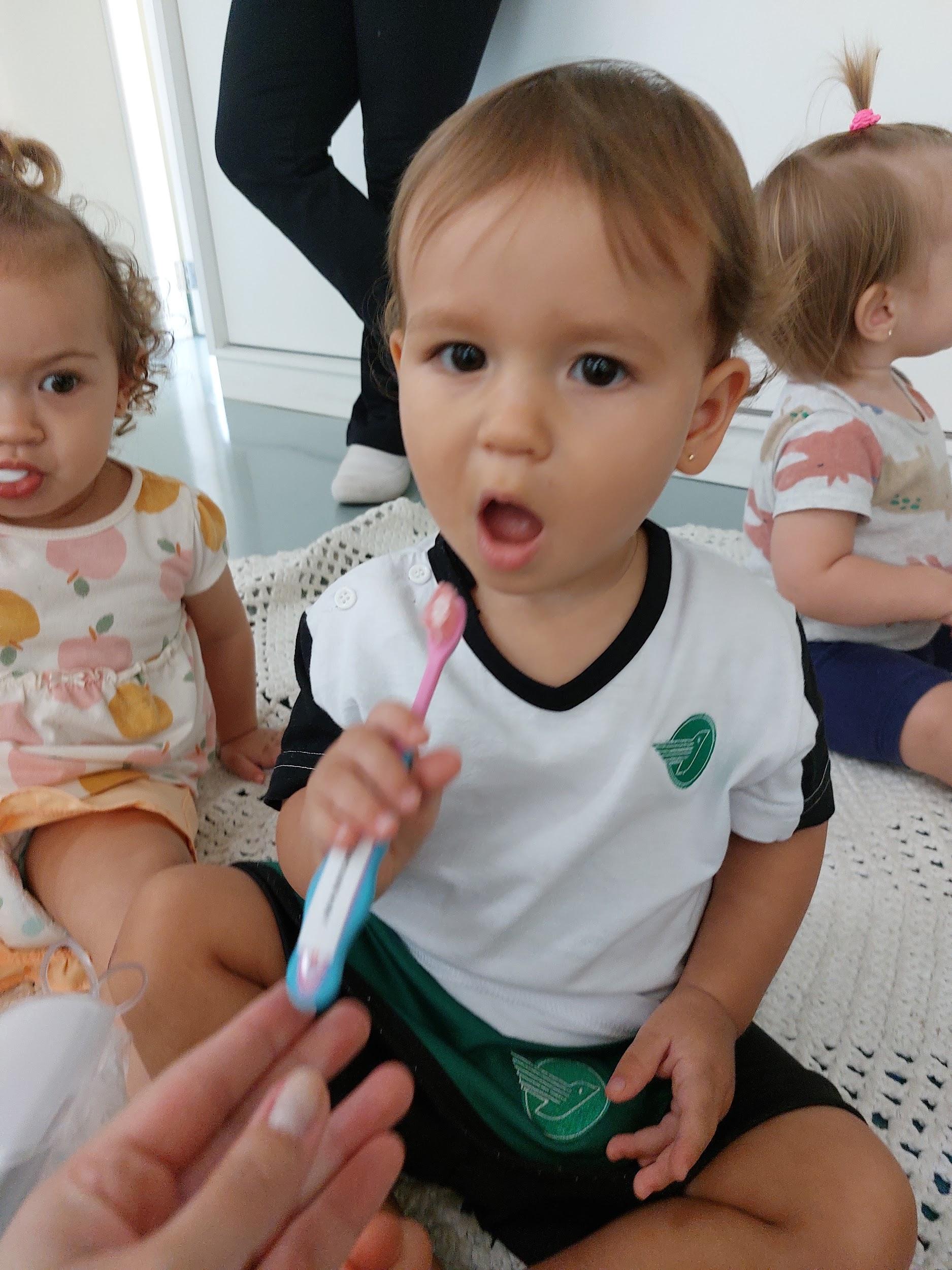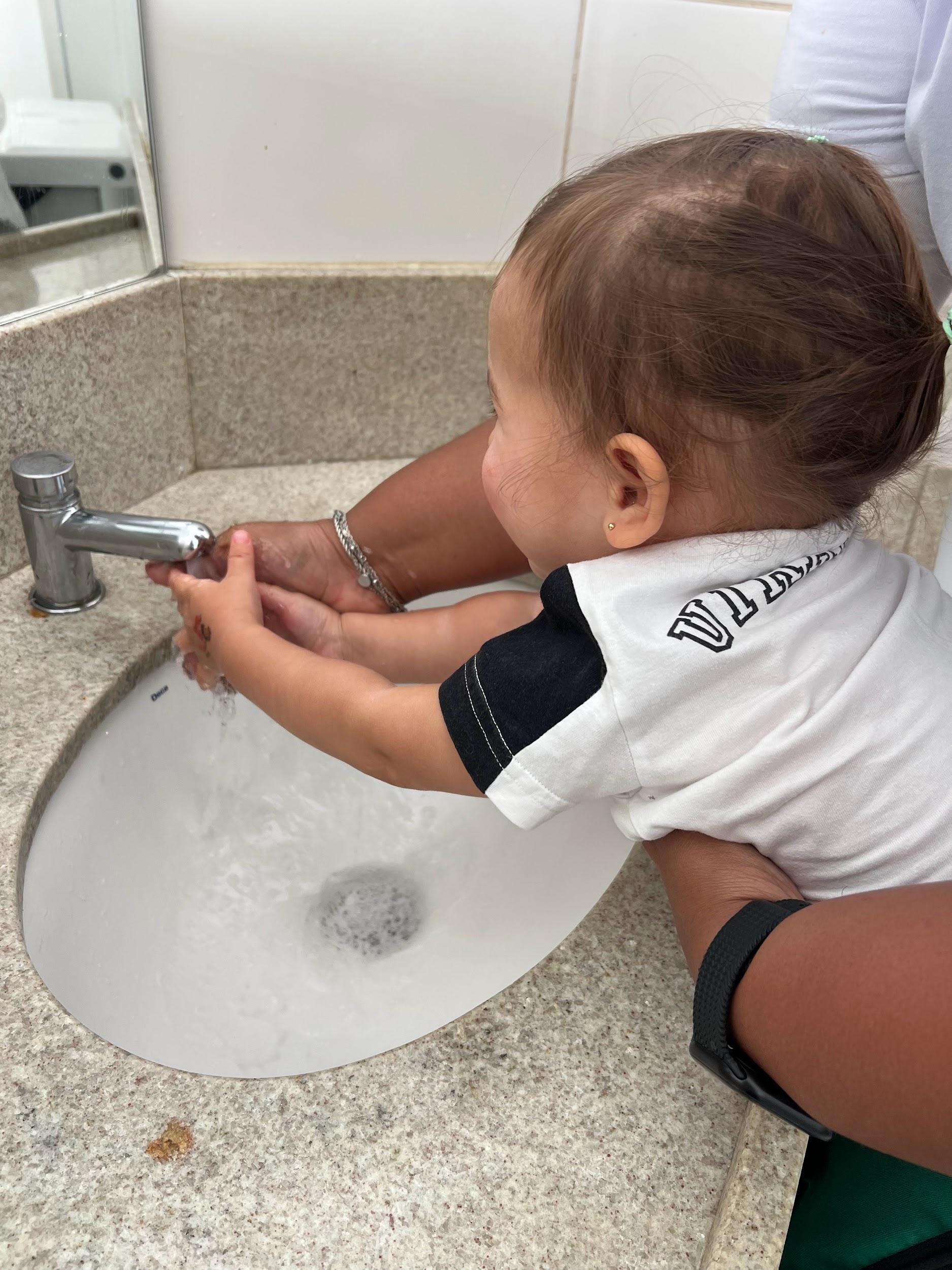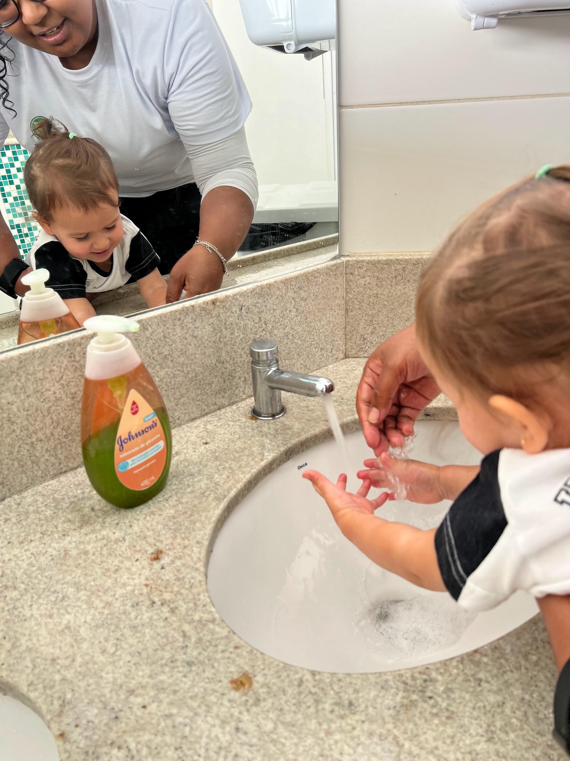 Ana revela autonomia na higiene com alegria e tranquilidade. Lava as mãos com cuidado, lançando sorrisos para o adulto que a acompanha. Ao escovar os dentes, observa atentamente os movimentos cantados pela educadora, descobrindo prazer e confiança em cuidar de si mesma.