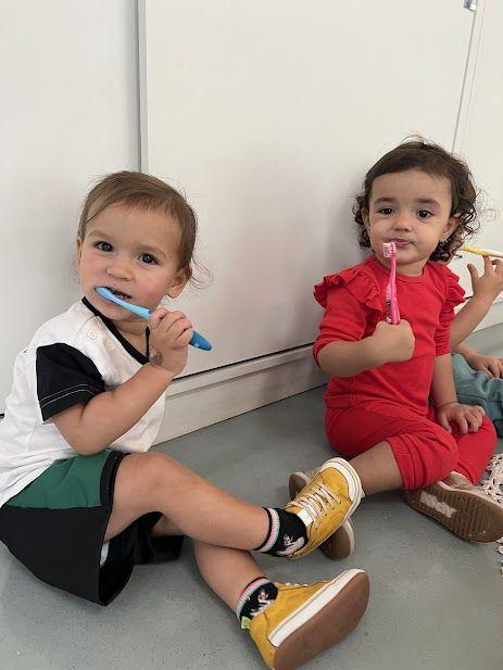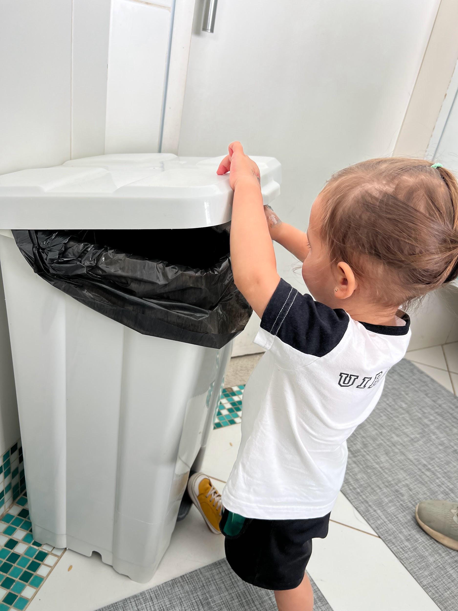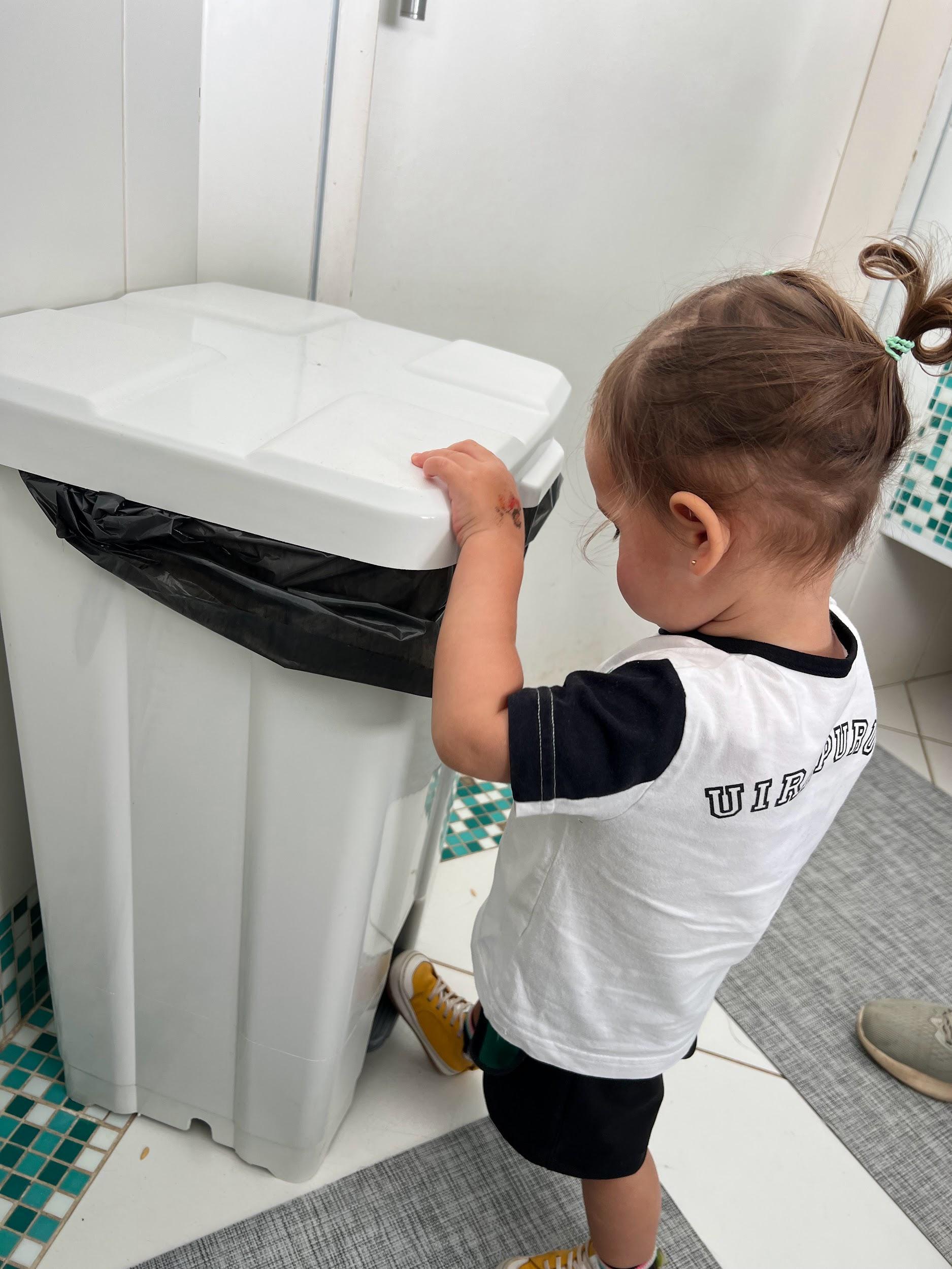 Ana revela autonomia na higiene com alegria e tranquilidade. Lava as mãos com cuidado, lançando sorrisos para o adulto que a acompanha. Ao escovar os dentes, observa atentamente os movimentos cantados pela educadora, descobrindo prazer e confiança em cuidar de si mesma.