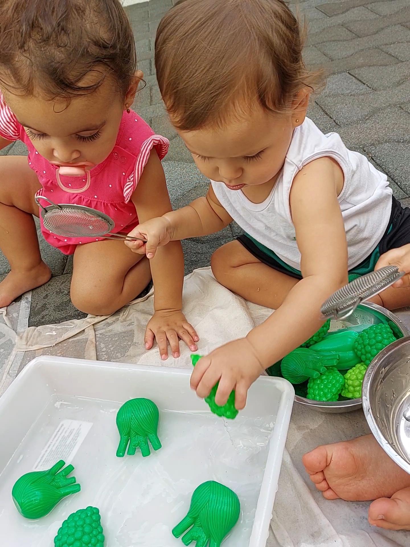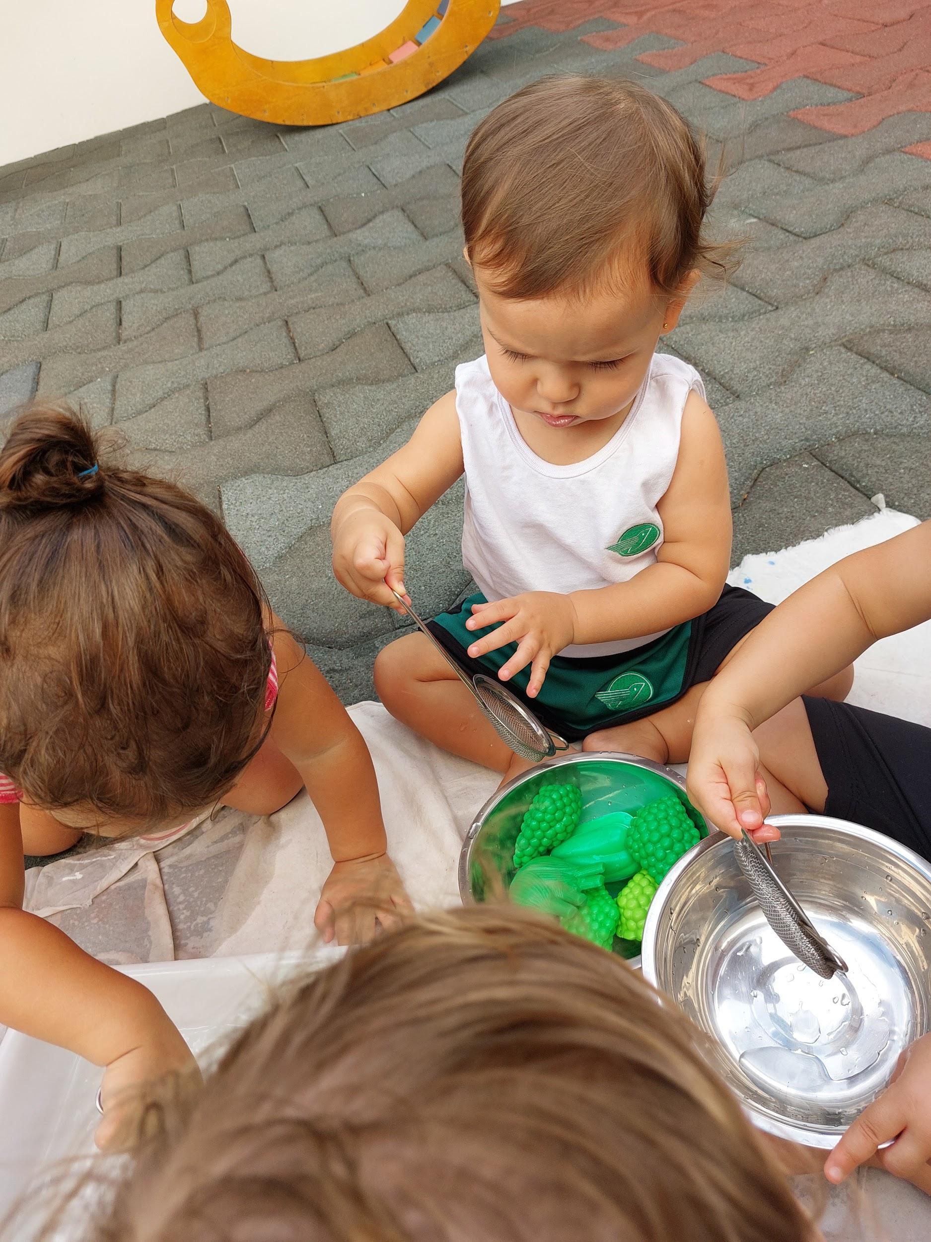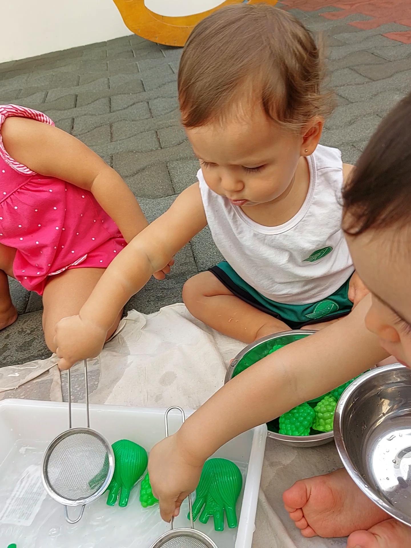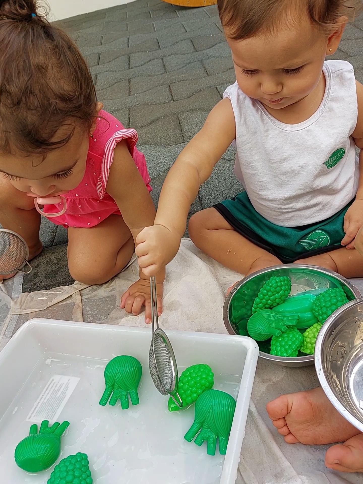 Na proposta de ‘pesca’ em uma bandeja com peneiras, recheada de alho-poró e ervilhas de plástico, Ana revela foco e determinação. Com a peneira em mãos, ela a aproxima da bandeja, buscando capturar uma ervilha.