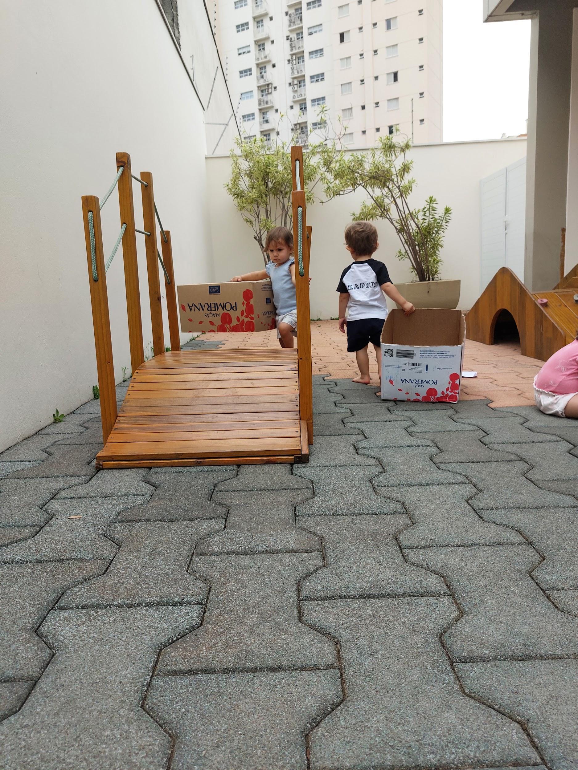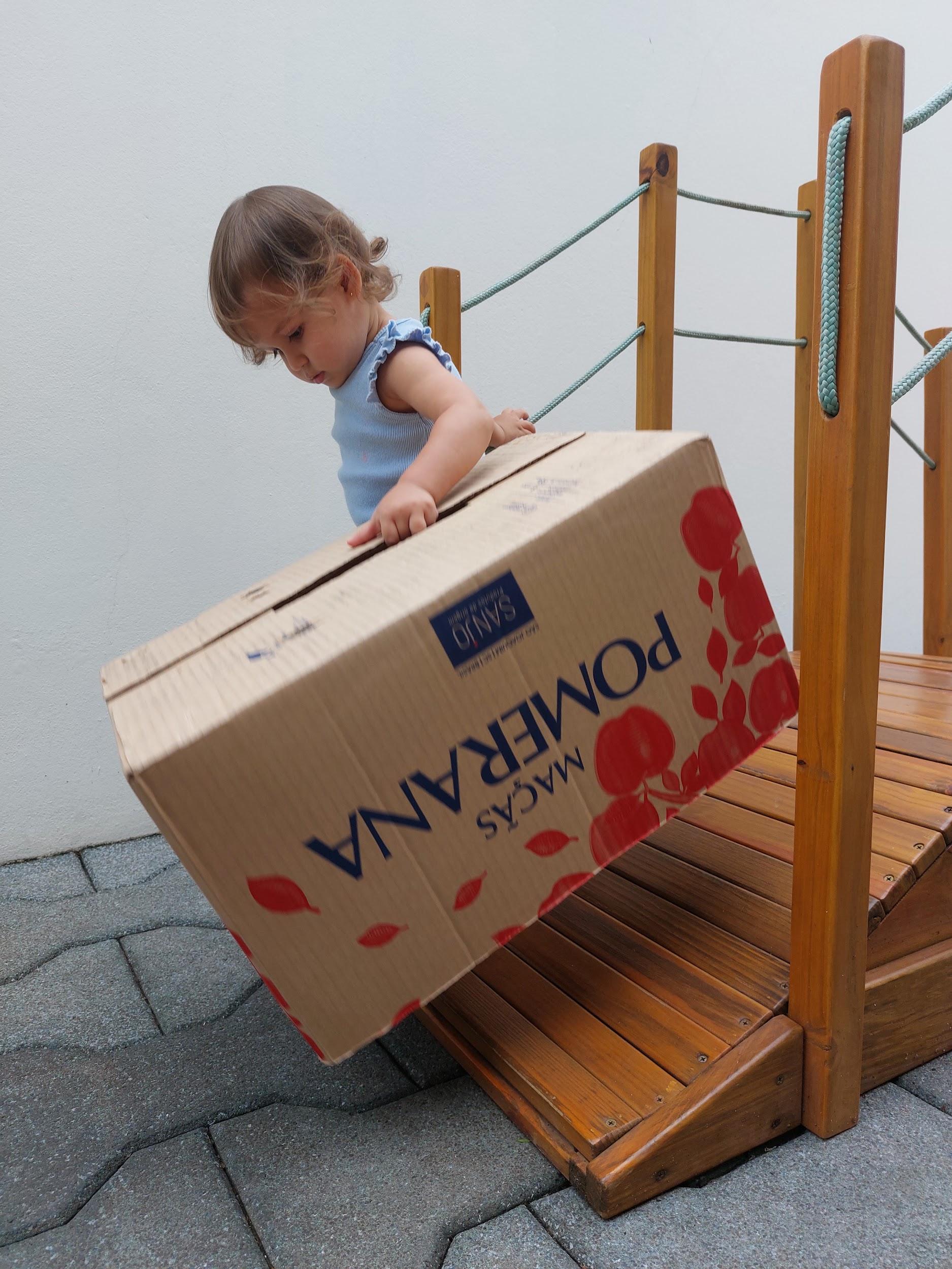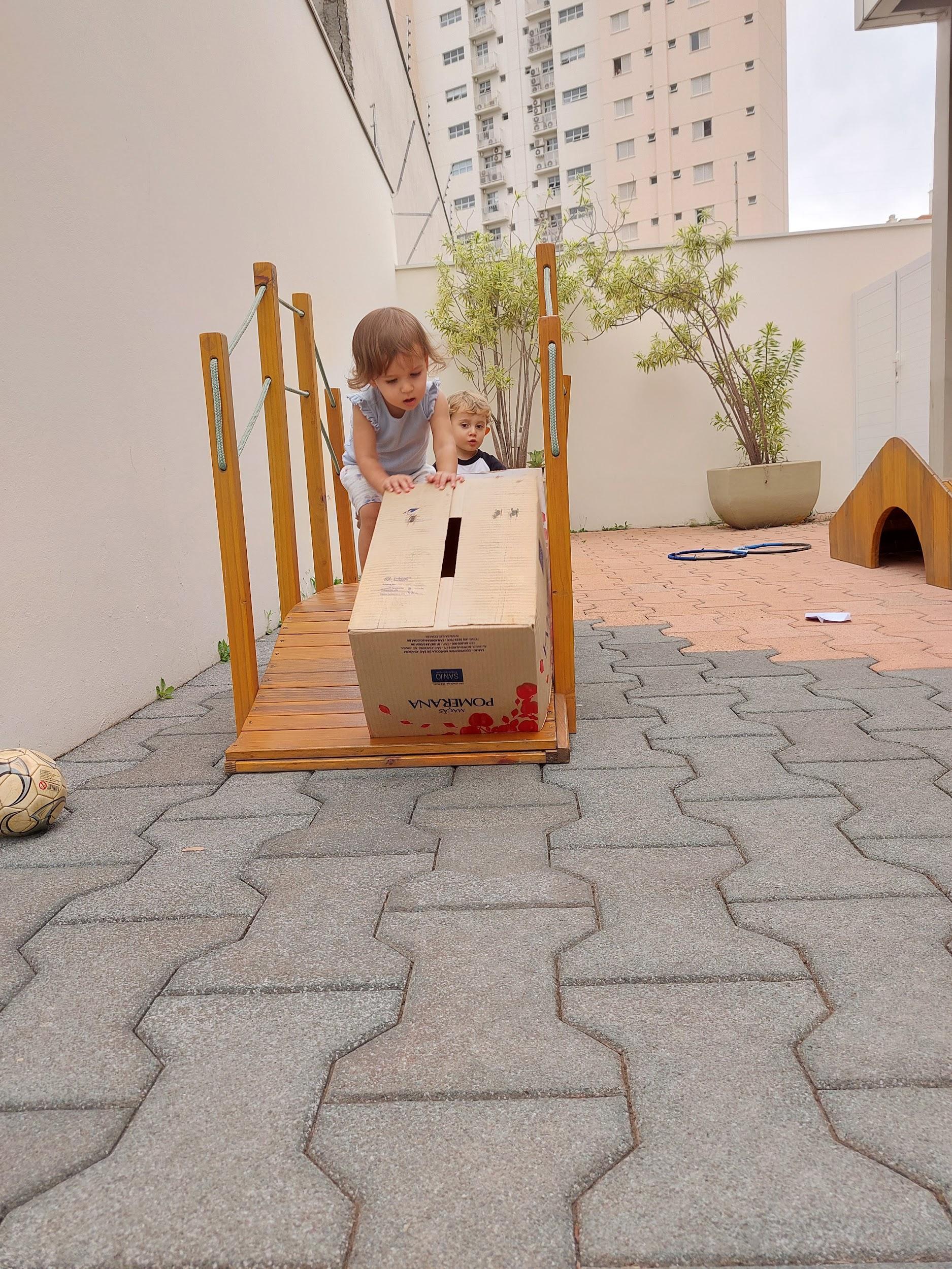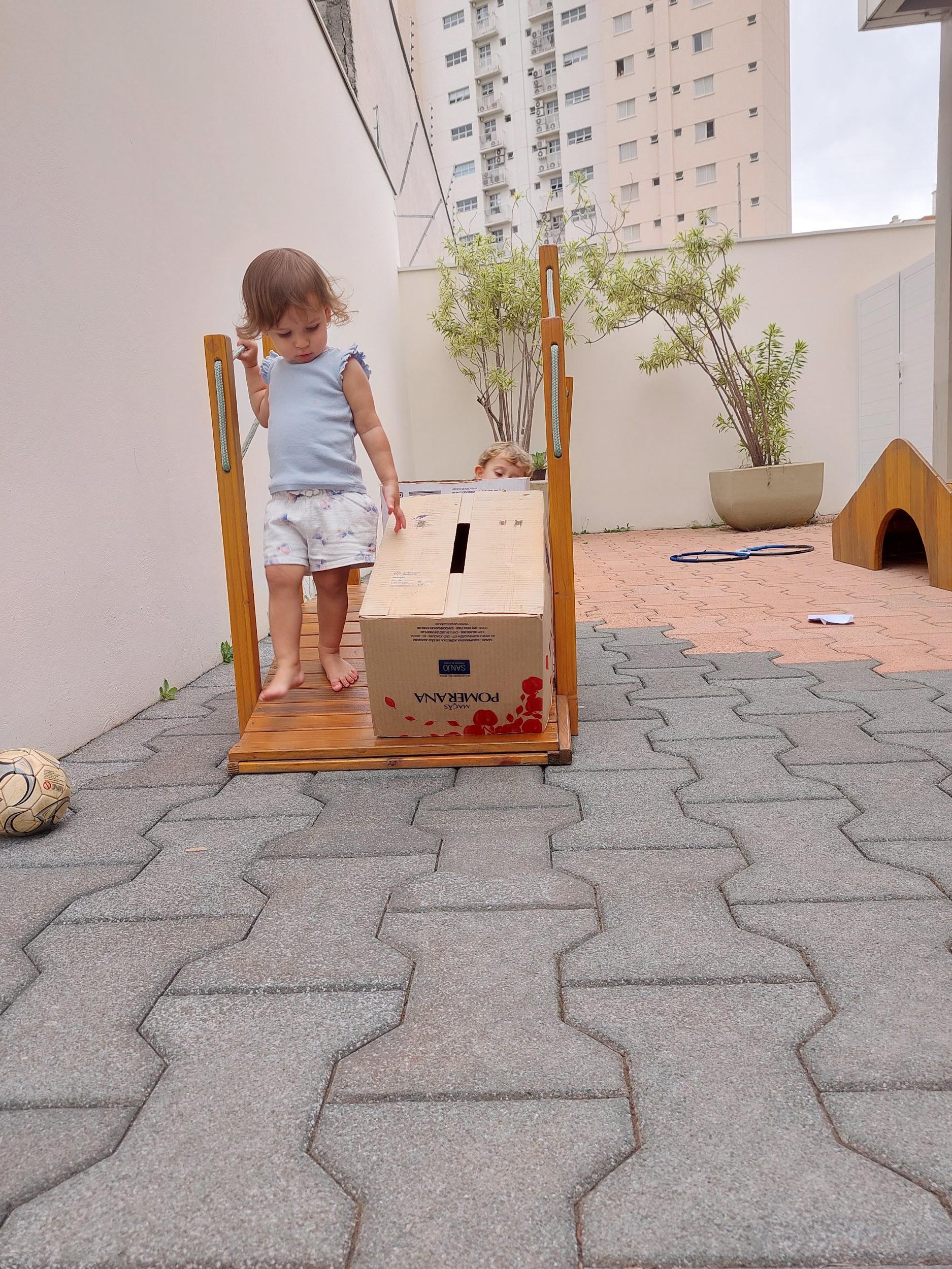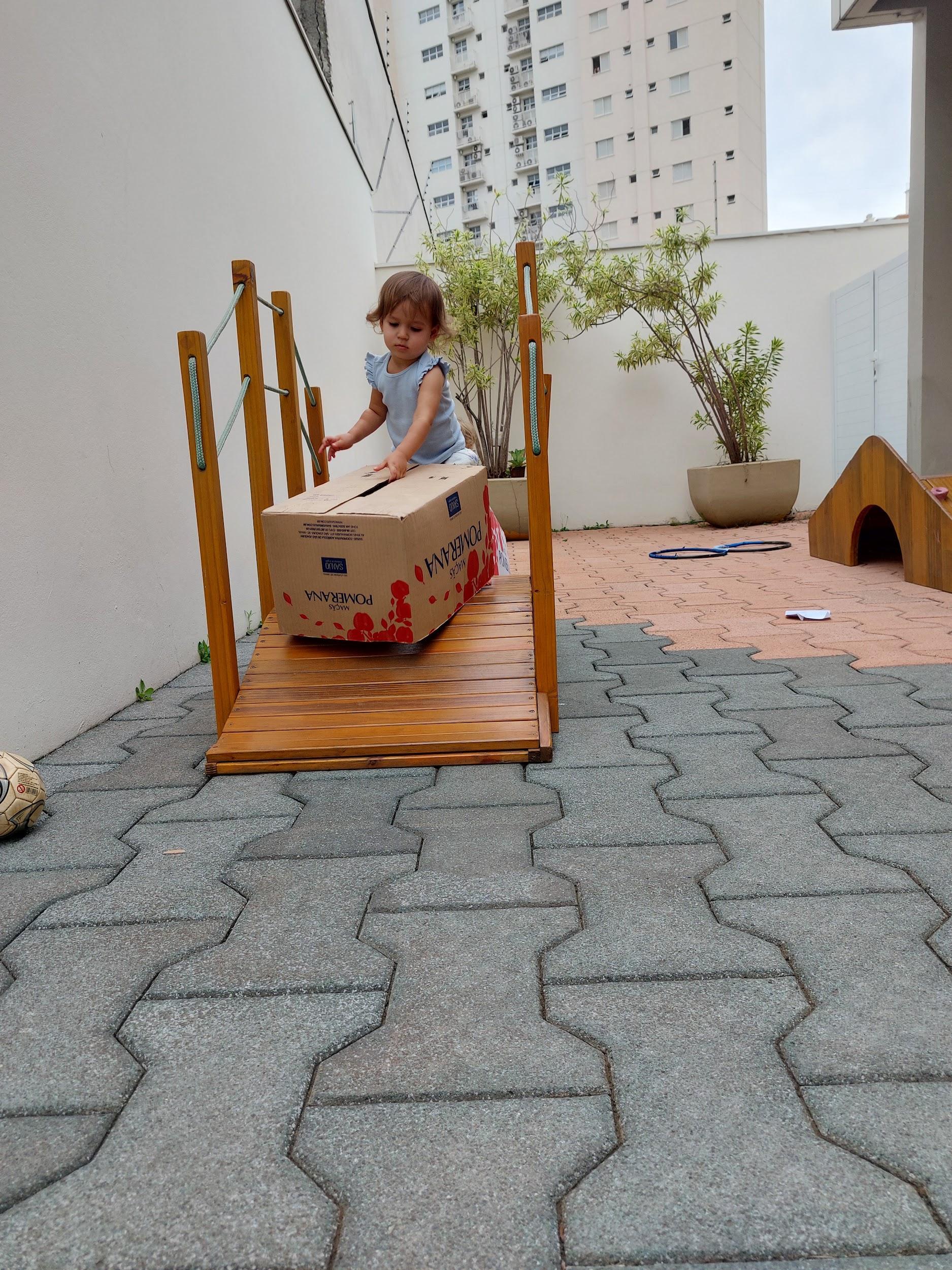 No parque, Ana se diverte imensamente com caixas, transformando cada uma em um convite à exploração. Com uma caixa grande em mãos, ela cria seu próprio desafio, arrasta-a pelo chão, contorna a ponte e tenta subir com cuidado. A caixa não encaixa perfeitamente na estrutura estreita, mas Ana, determinada, encontra uma forma de atravessá-la até o outro lado.