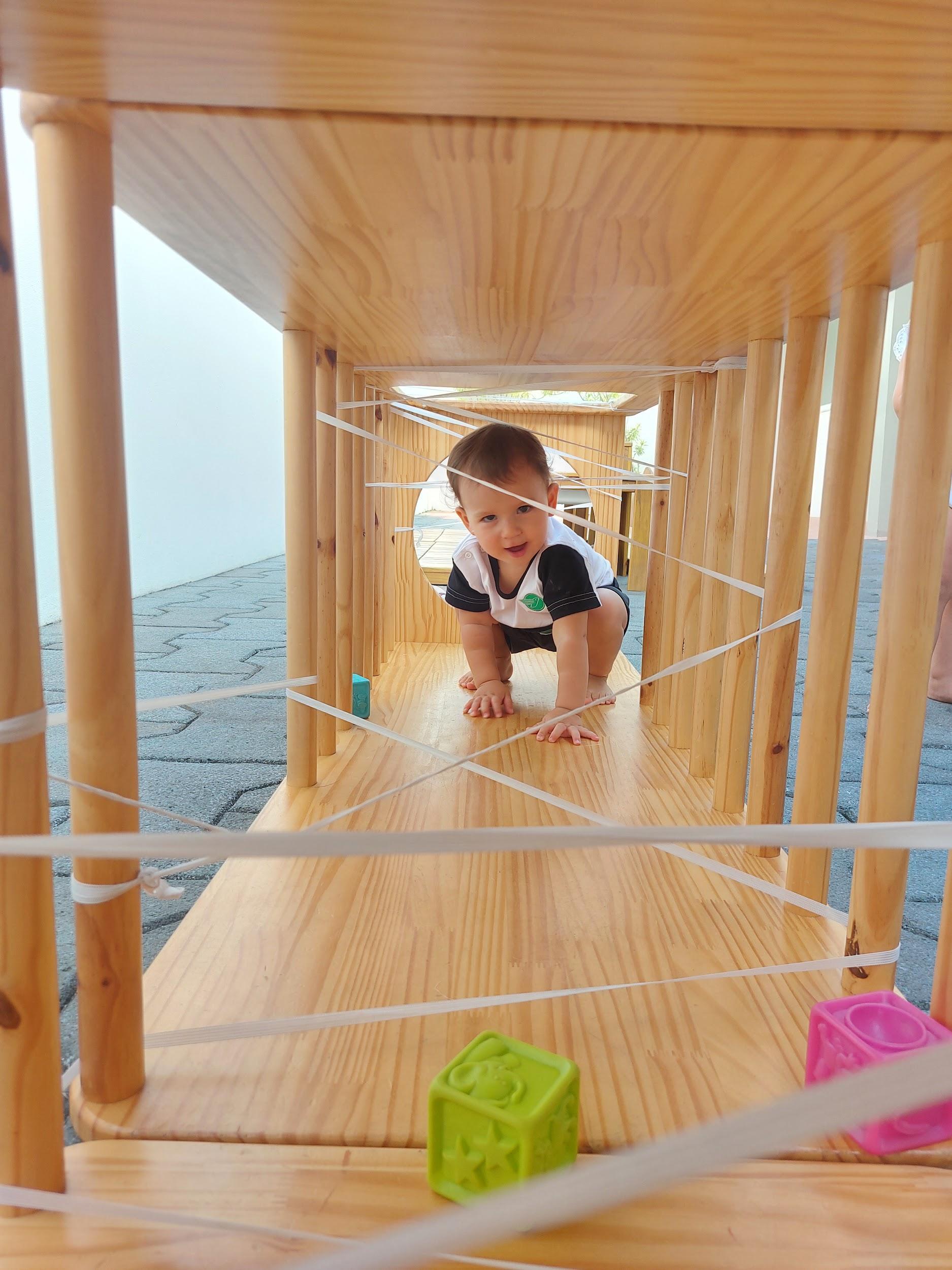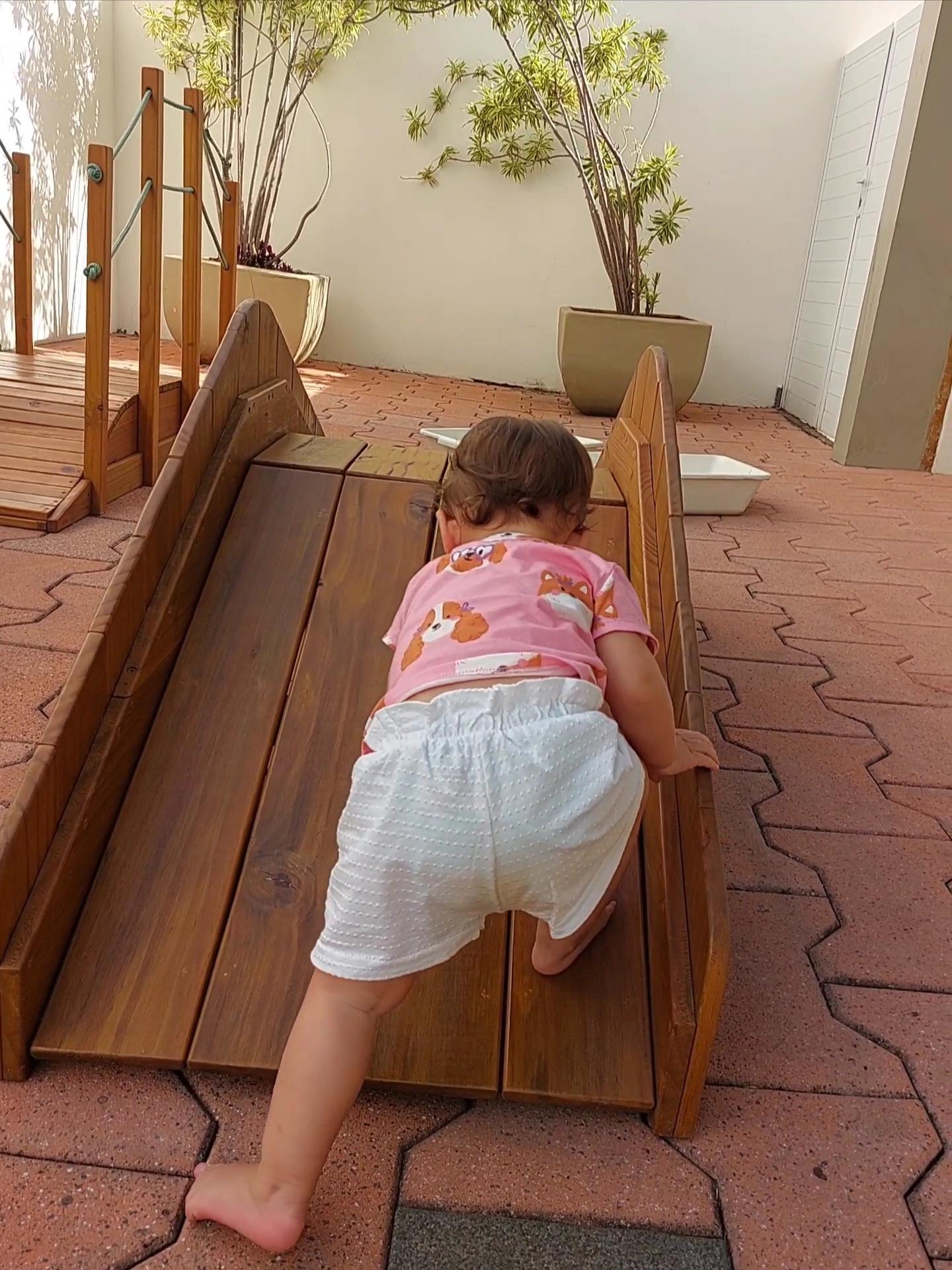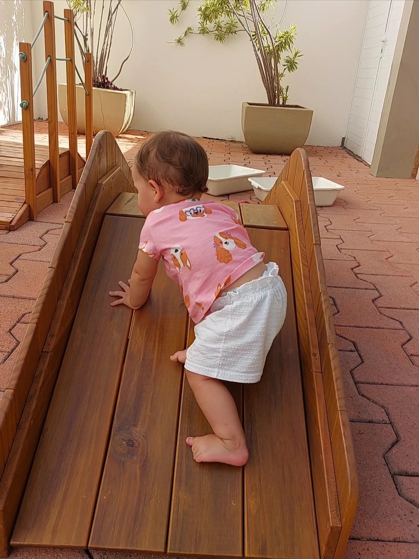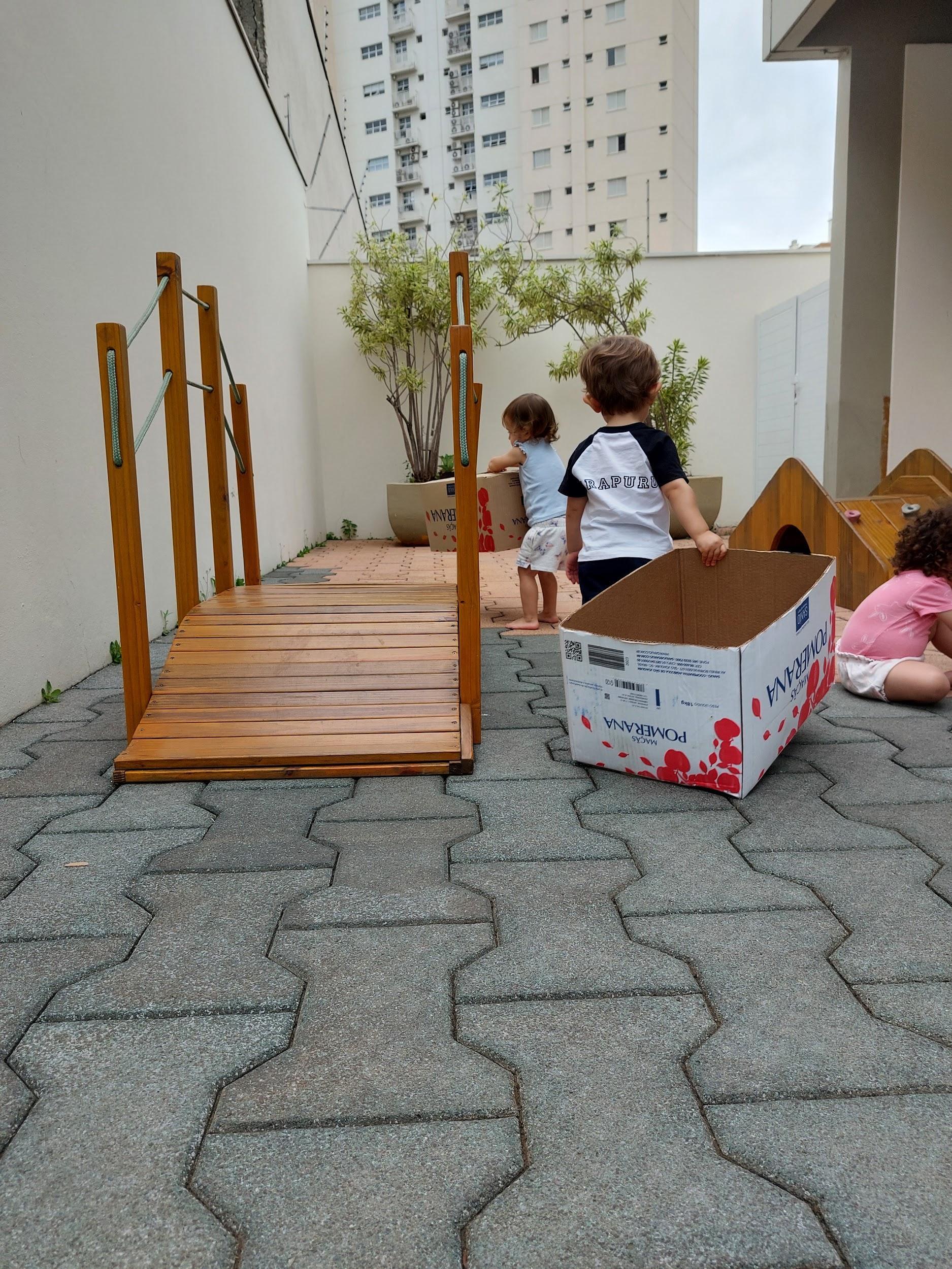 No parque, Ana se diverte imensamente com caixas, transformando cada uma em um convite à exploração. Com uma caixa grande em mãos, ela cria seu próprio desafio, arrasta-a pelo chão, contorna a ponte e tenta subir com cuidado. A caixa não encaixa perfeitamente na estrutura estreita, mas Ana, determinada, encontra uma forma de atravessá-la até o outro lado.