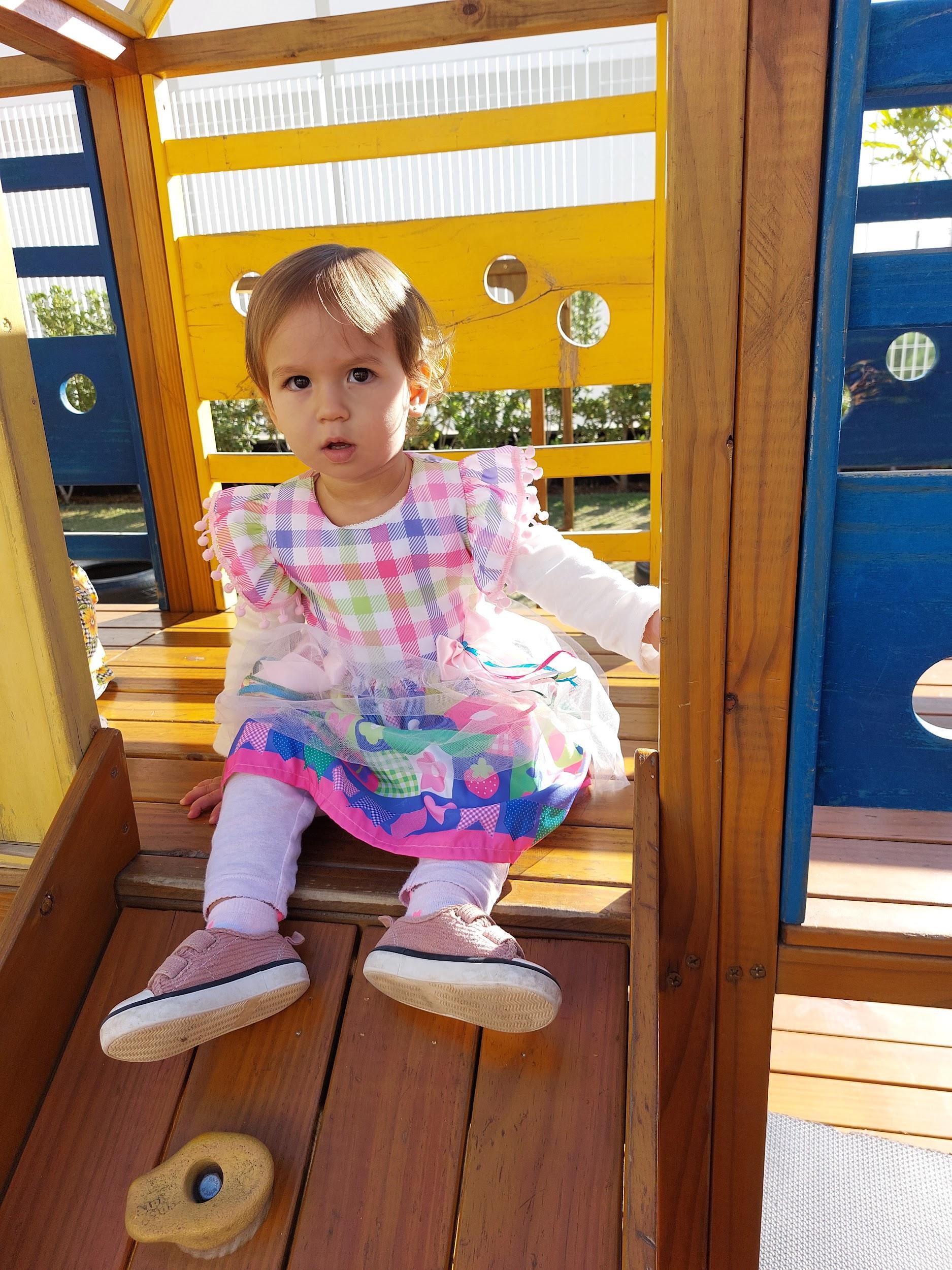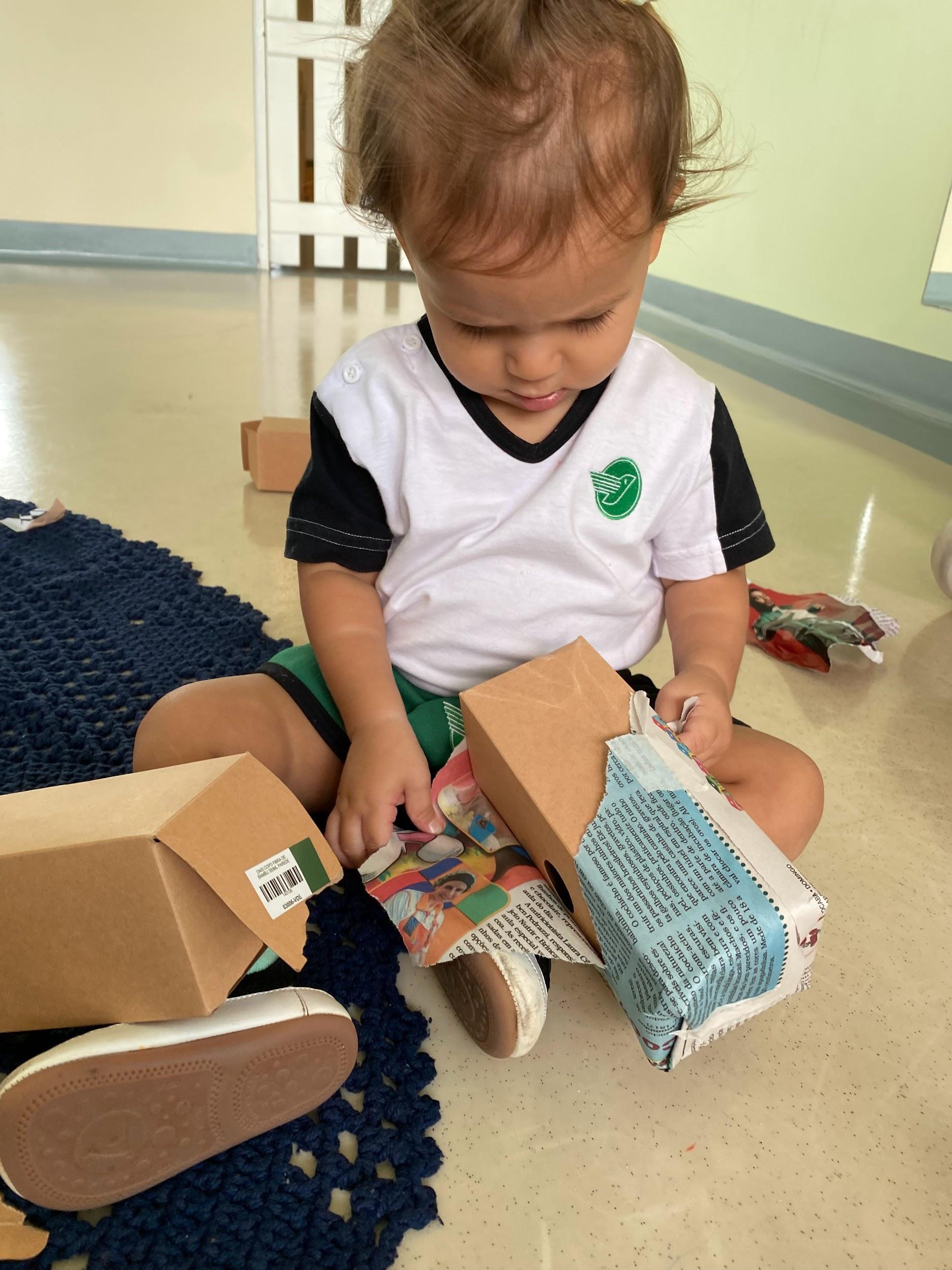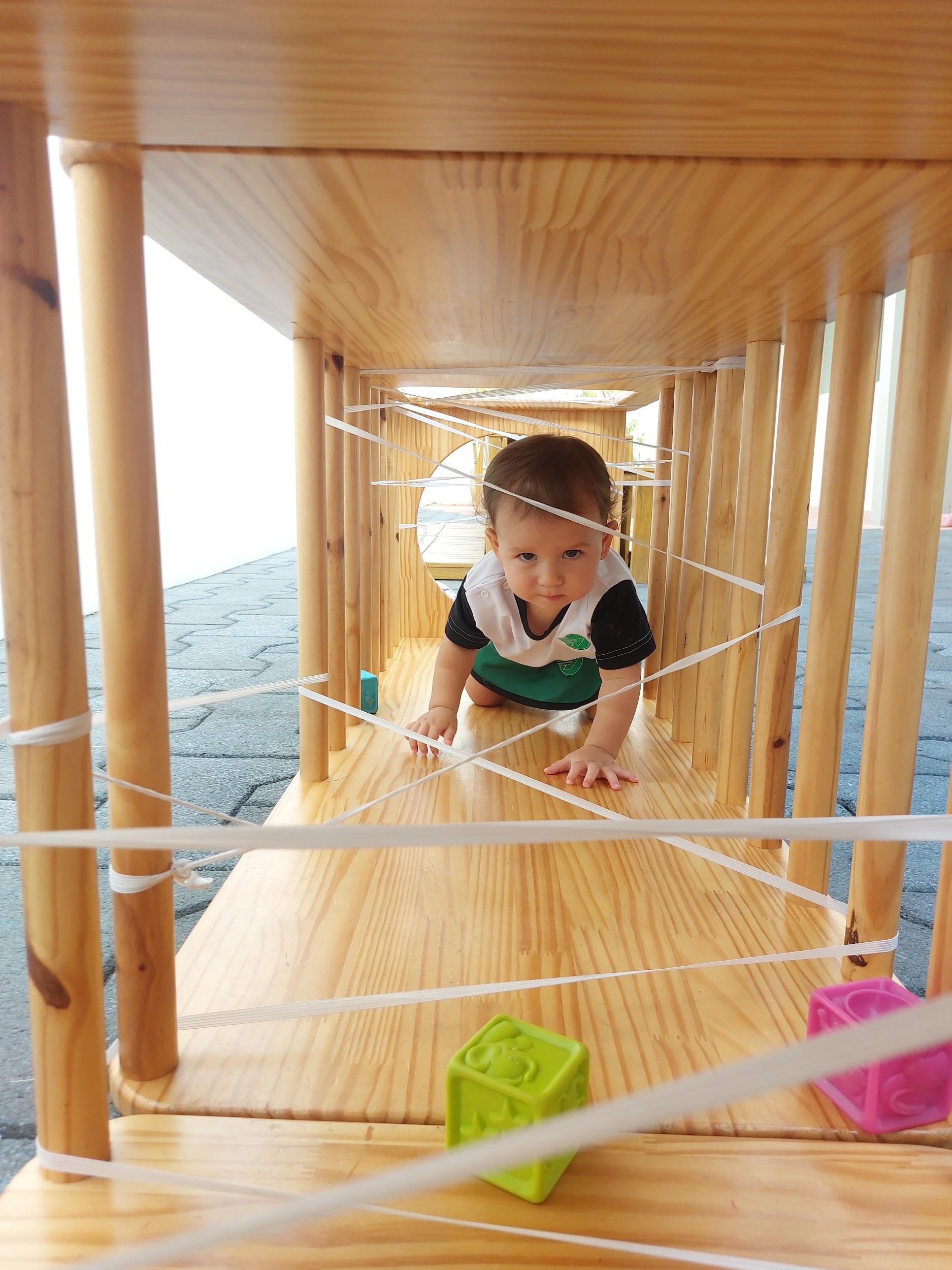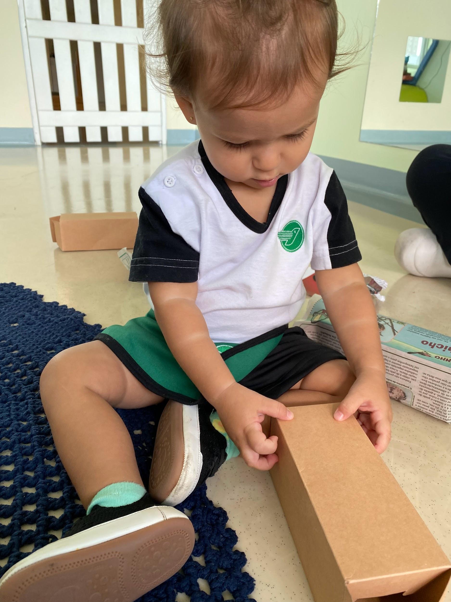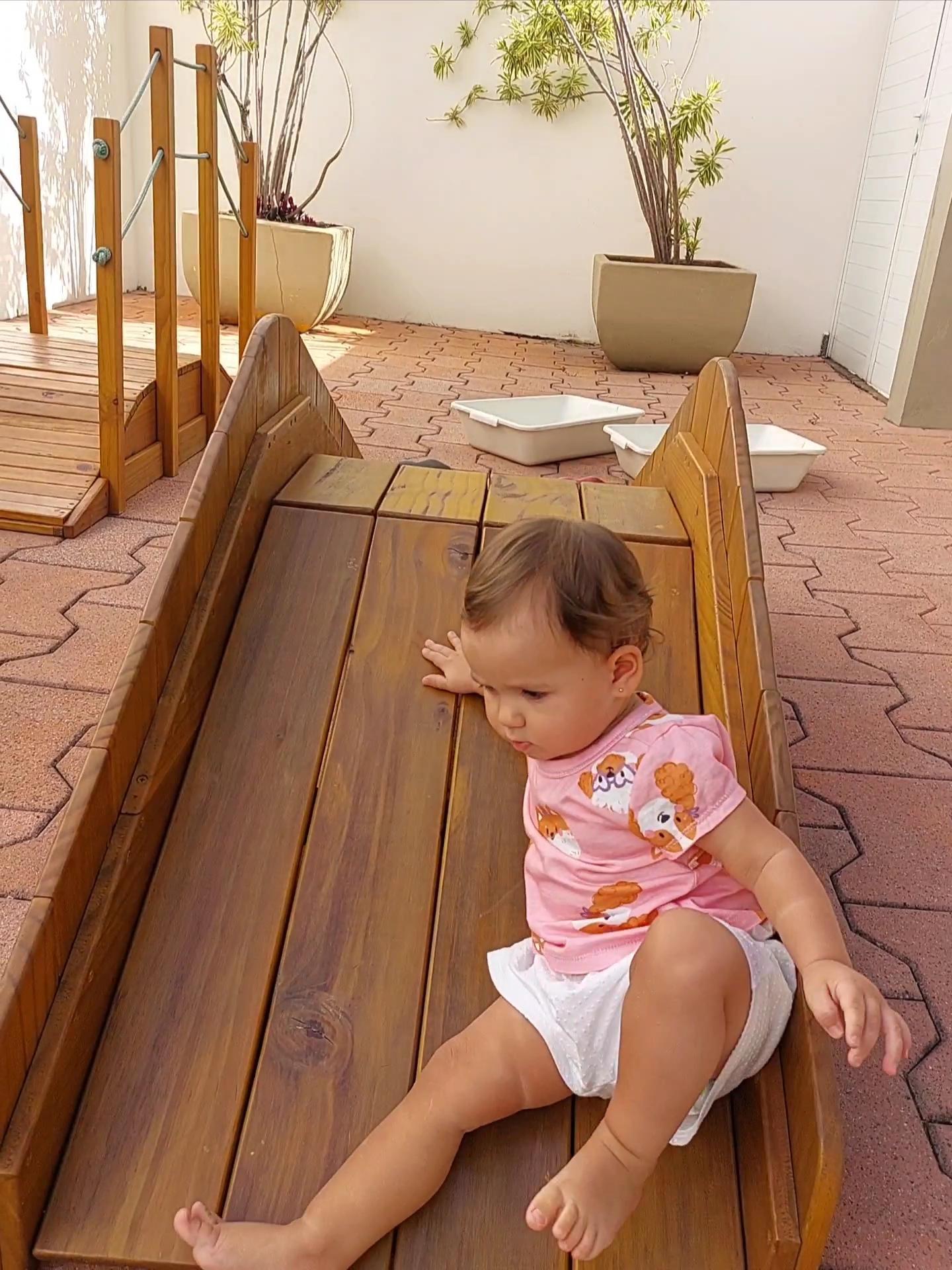 No parque, Ana se diverte imensamente com caixas, transformando cada uma em um convite à exploração. Com uma caixa grande em mãos, ela cria seu próprio desafio, arrasta-a pelo chão, contorna a ponte e tenta subir com cuidado. A caixa não encaixa perfeitamente na estrutura estreita, mas Ana, determinada, encontra uma forma de atravessá-la até o outro lado.