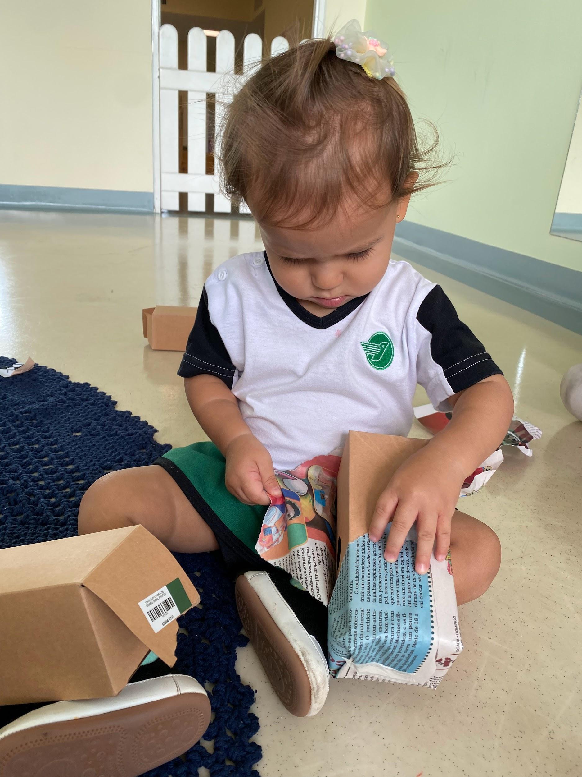 Ana se dedica à exploração de uma caixa envolta em camadas de jornal. Com curiosidade tranquila, ela começa a remover o papel, gesto por gesto, revelando o que estava oculto. Quando a embalagem se desfaz por completo, Ana vira a caixa entre as mãos, observando cada lado com cuidado. Segura-a com firmeza, como quem busca compreender o objeto em sua totalidade.