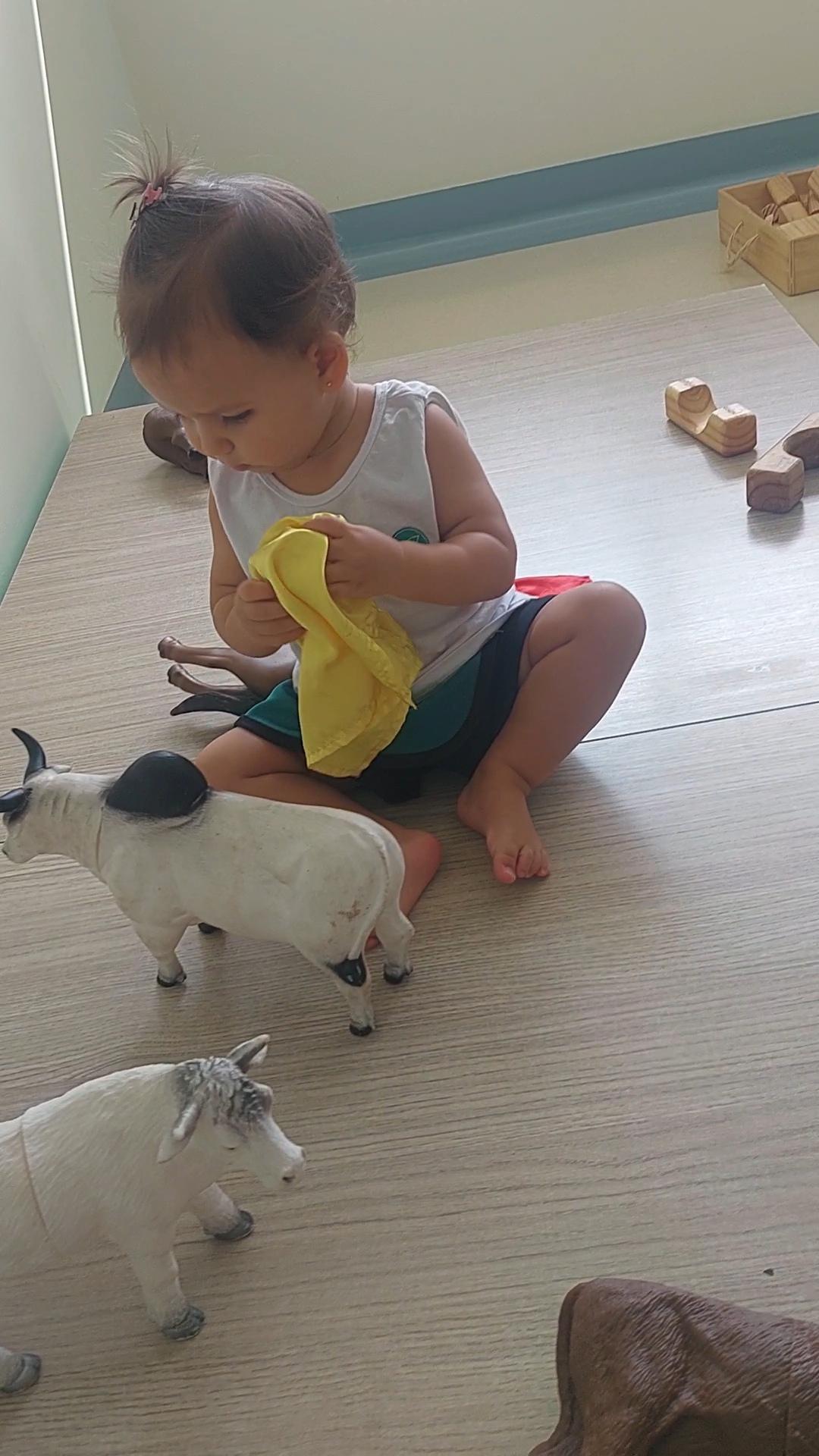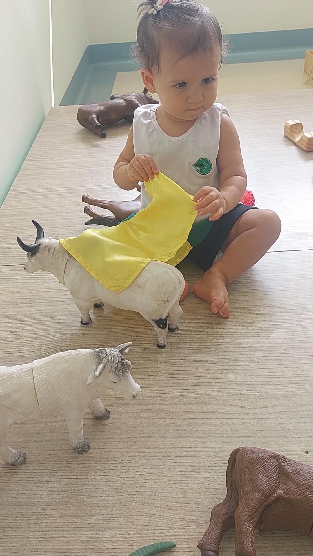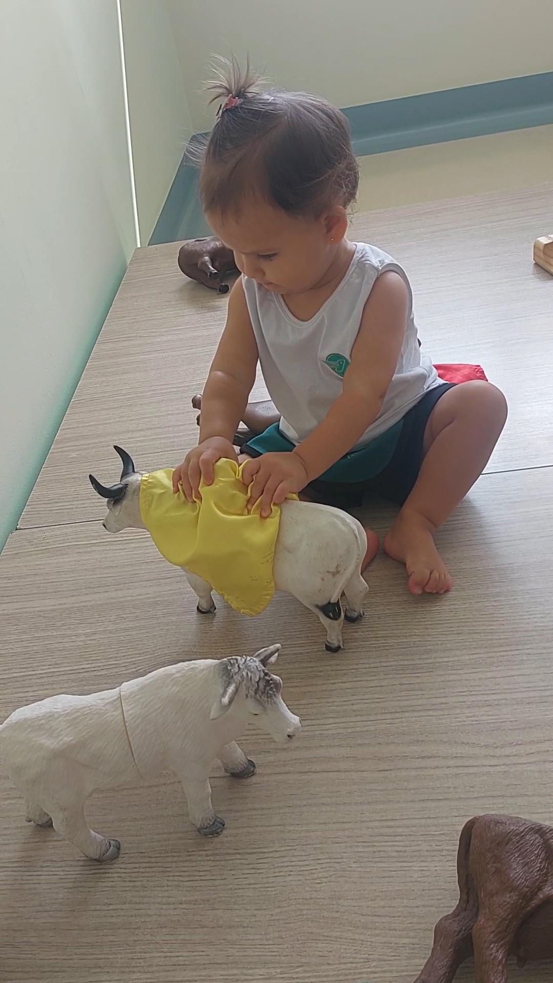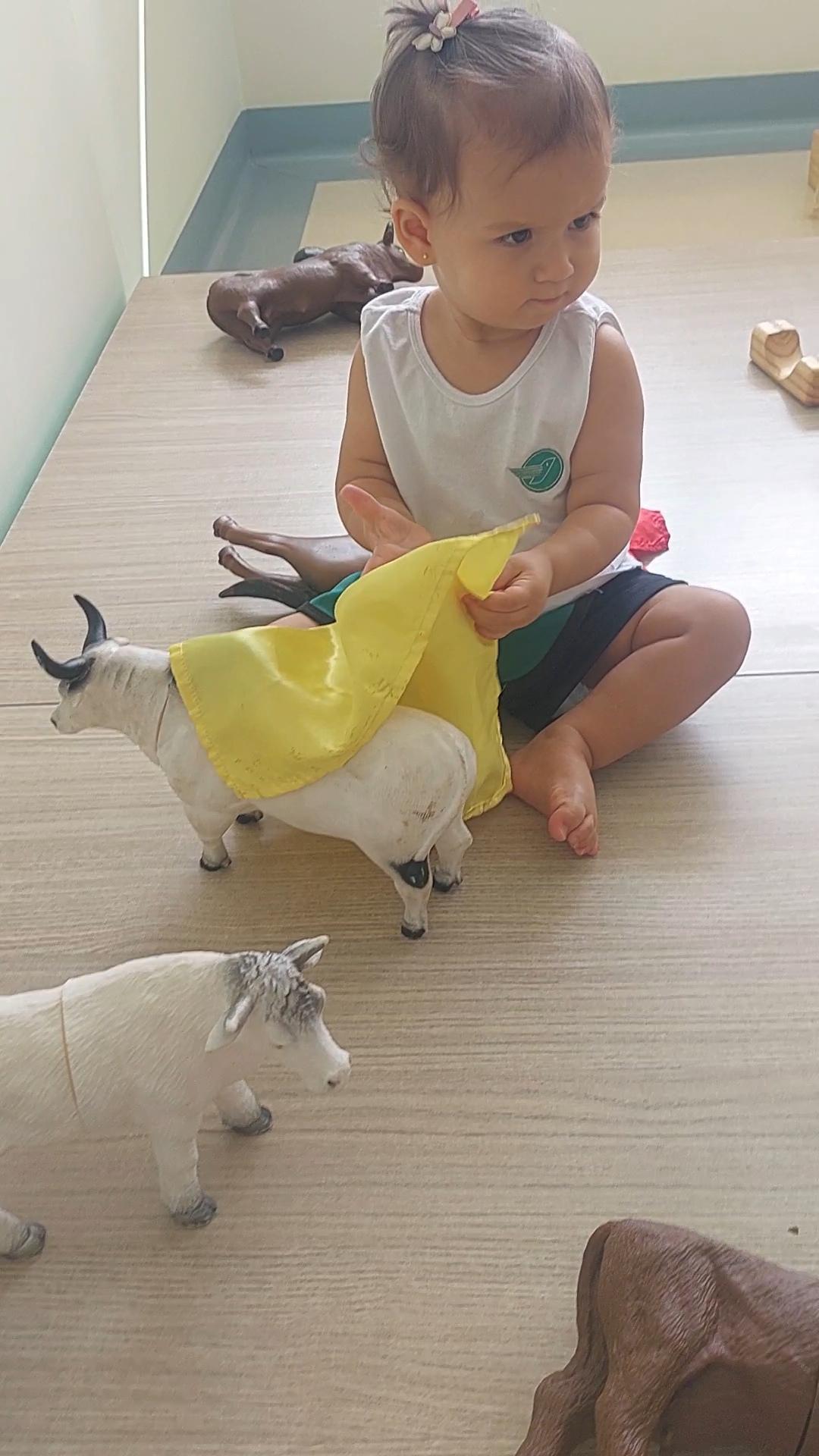 Sentada em meio ao faz de conta da fazenda, Ana encontra um boi. Com um gesto cheio de cuidado, decide cobri-lo com um pano, como se compreendesse que ele precisa de descanso.