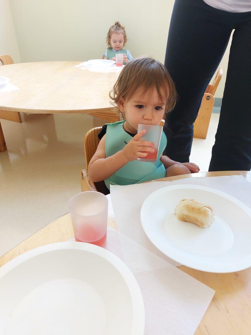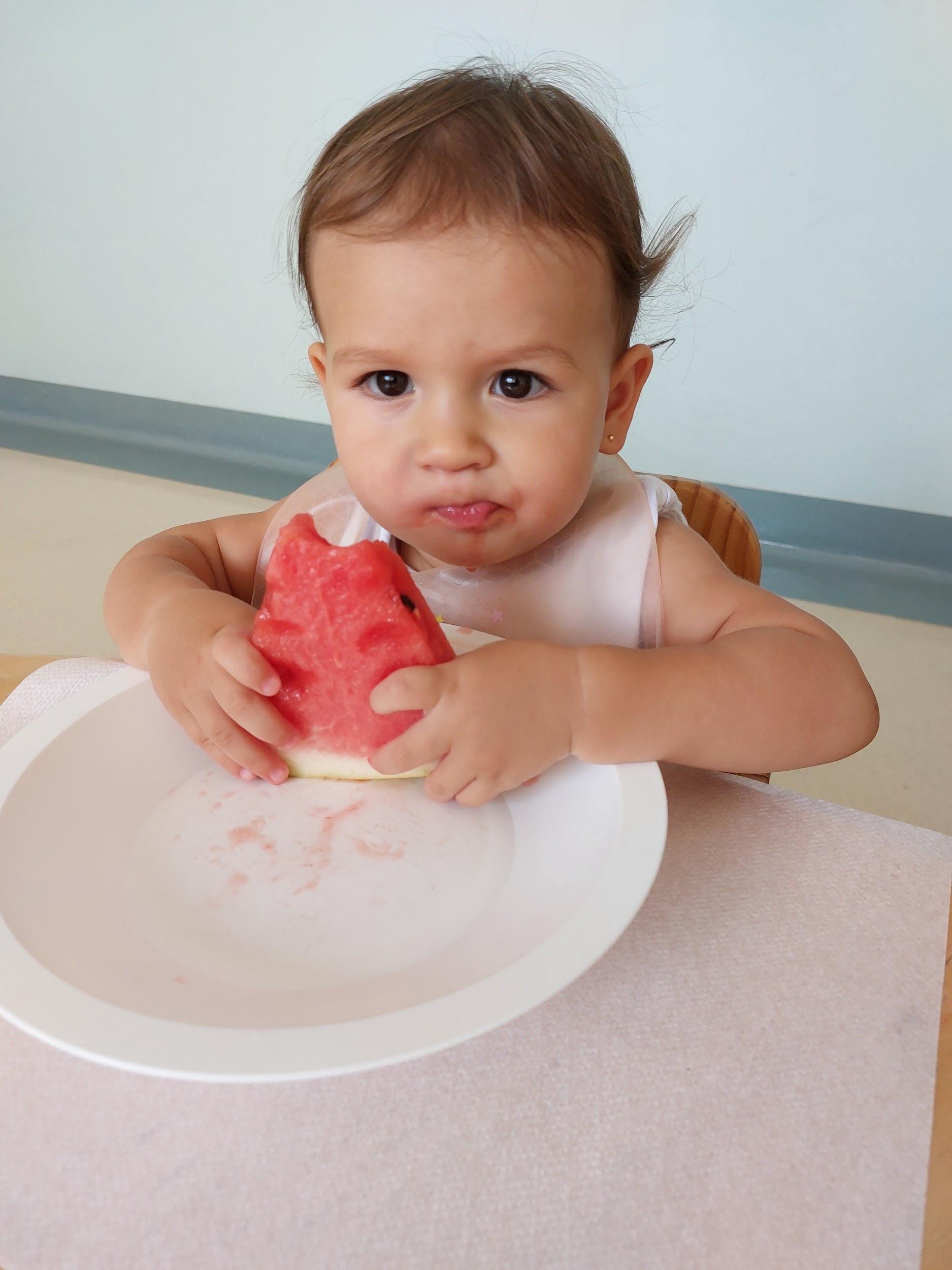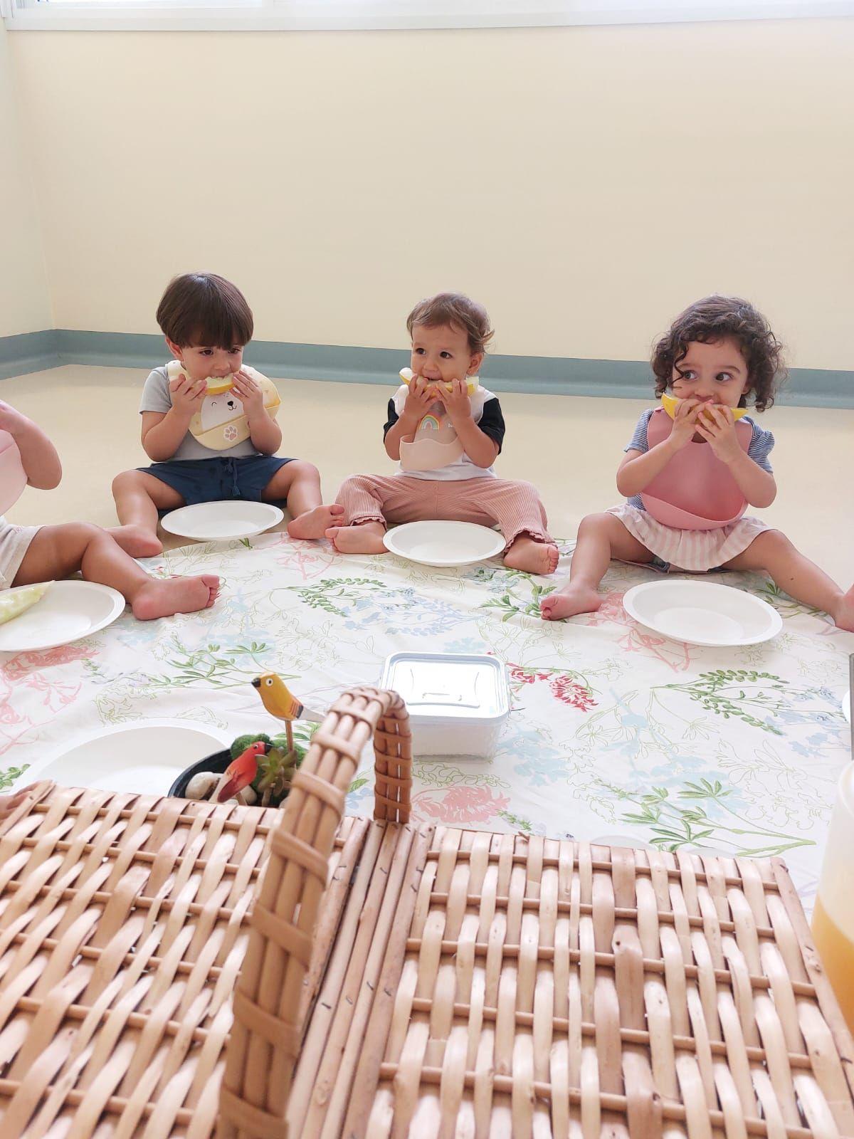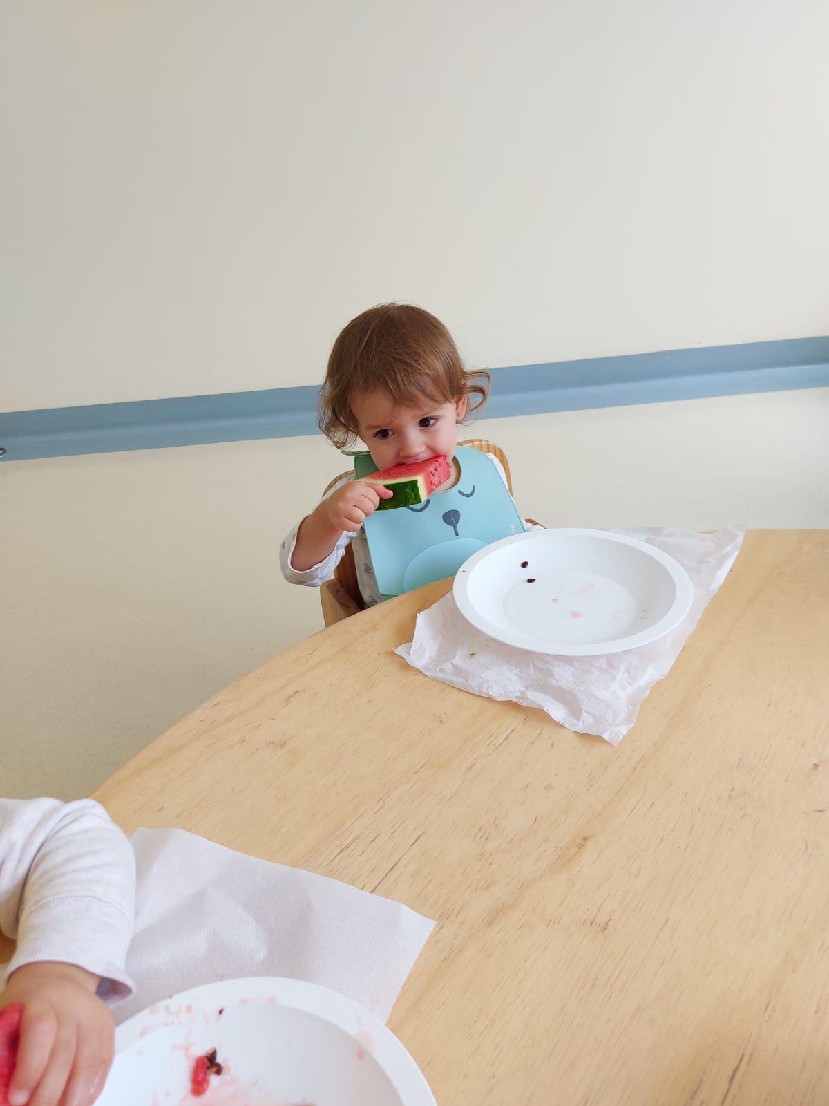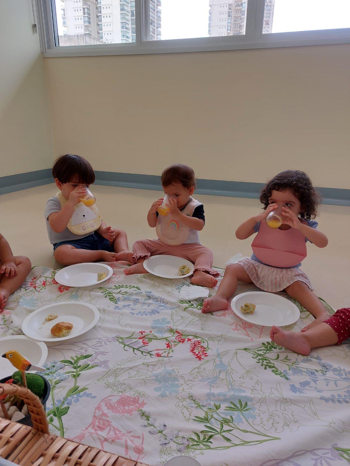 Sentados sobre o tapete, eles compartilham o lanche, começando pelo frescor do melão que ilumina a manhã. Depois, Ana experimenta o pão acompanhado de suco, saboreando tudo com calma.