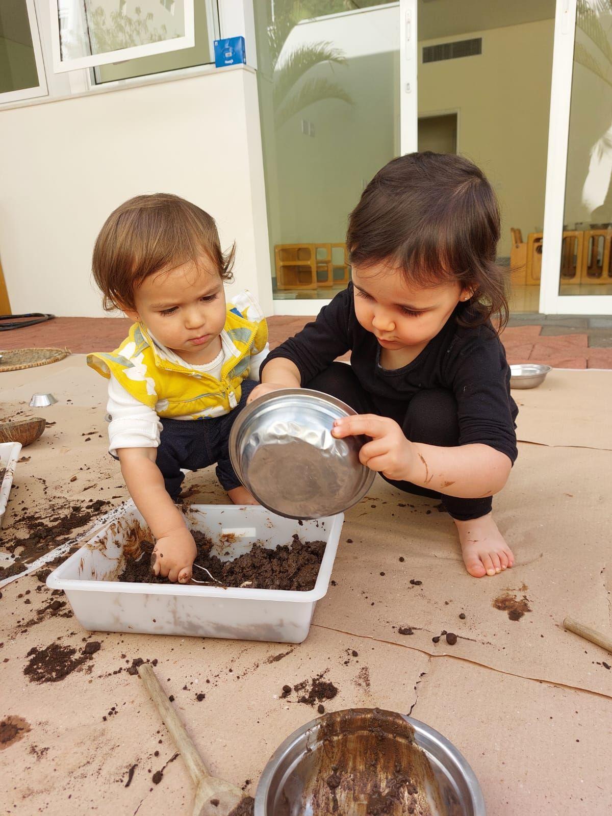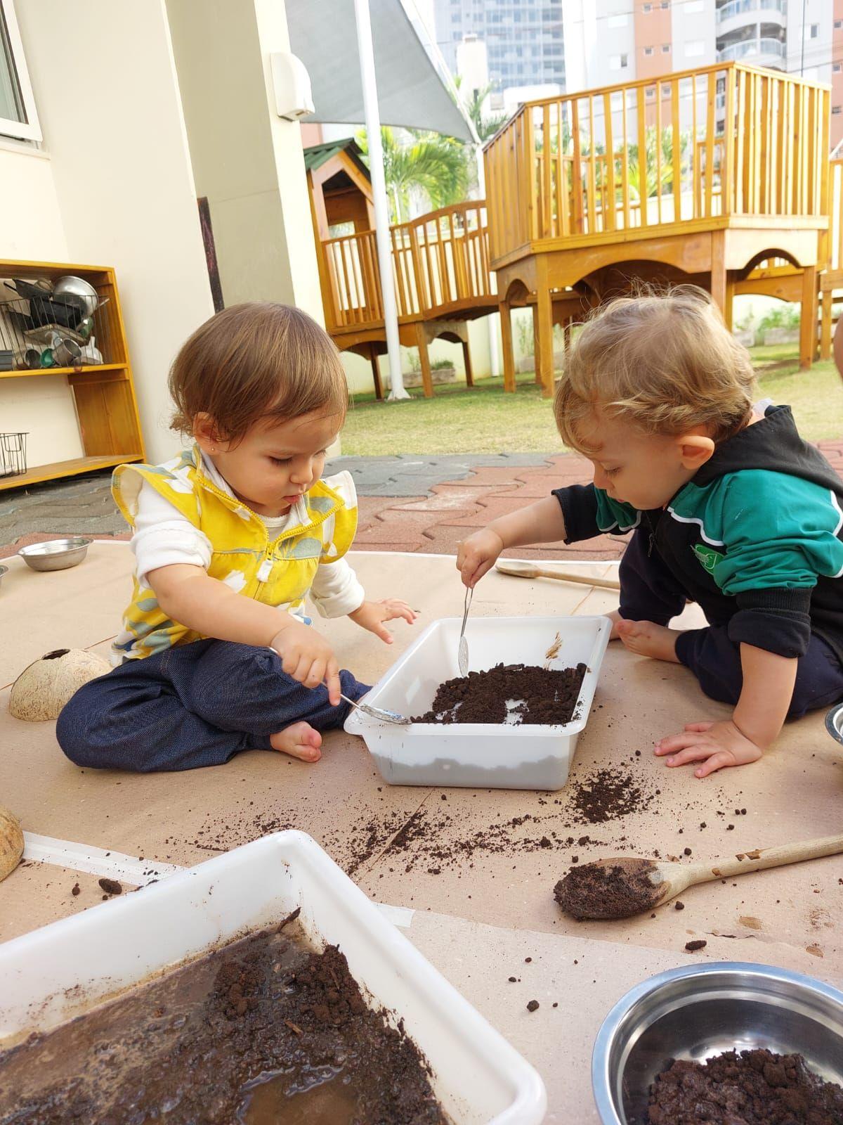 `Ana aproveita o dia no parque com os amigos, mergulhados na brincadeira com o barro. Ao lado de Helena, ela se dedica a criar um bolo, entregando-se à imaginação que nasce entre mãos e terra. A chegada de Gabriel amplia a parceria e a alegria do momento. Entusiasmada, Ana manipula colheres e panelas de alumínio, modelando o barro com intenção e criatividade. Em cada gesto, revela a imaginação que guia a brincadeira e transforma a matéria simples em algo carregado de sentido.