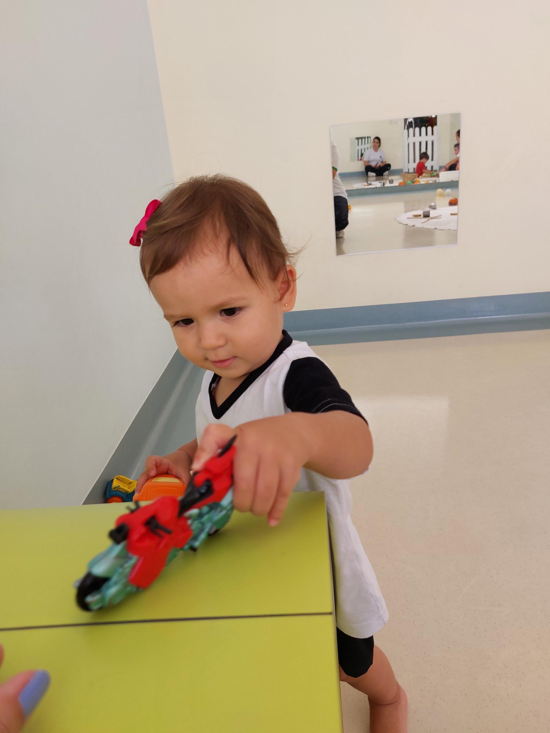 Cheia de energia e simpatia, Ana mergulha em suas descobertas. Com foco, segura a moto entre as mãos, observa-a por um momento e a coloca em movimento, entregando-se à brincadeira com concentração e alegria.