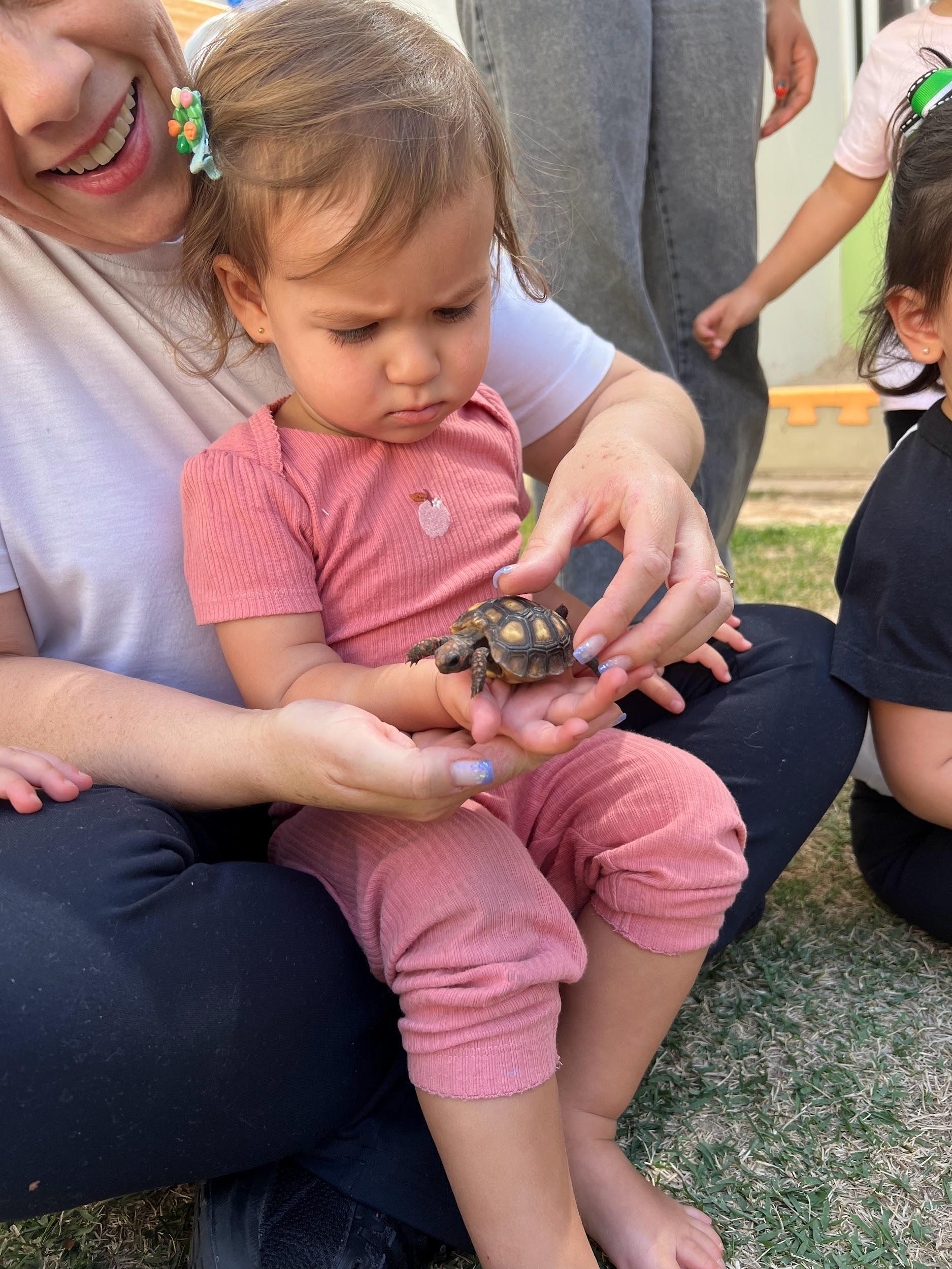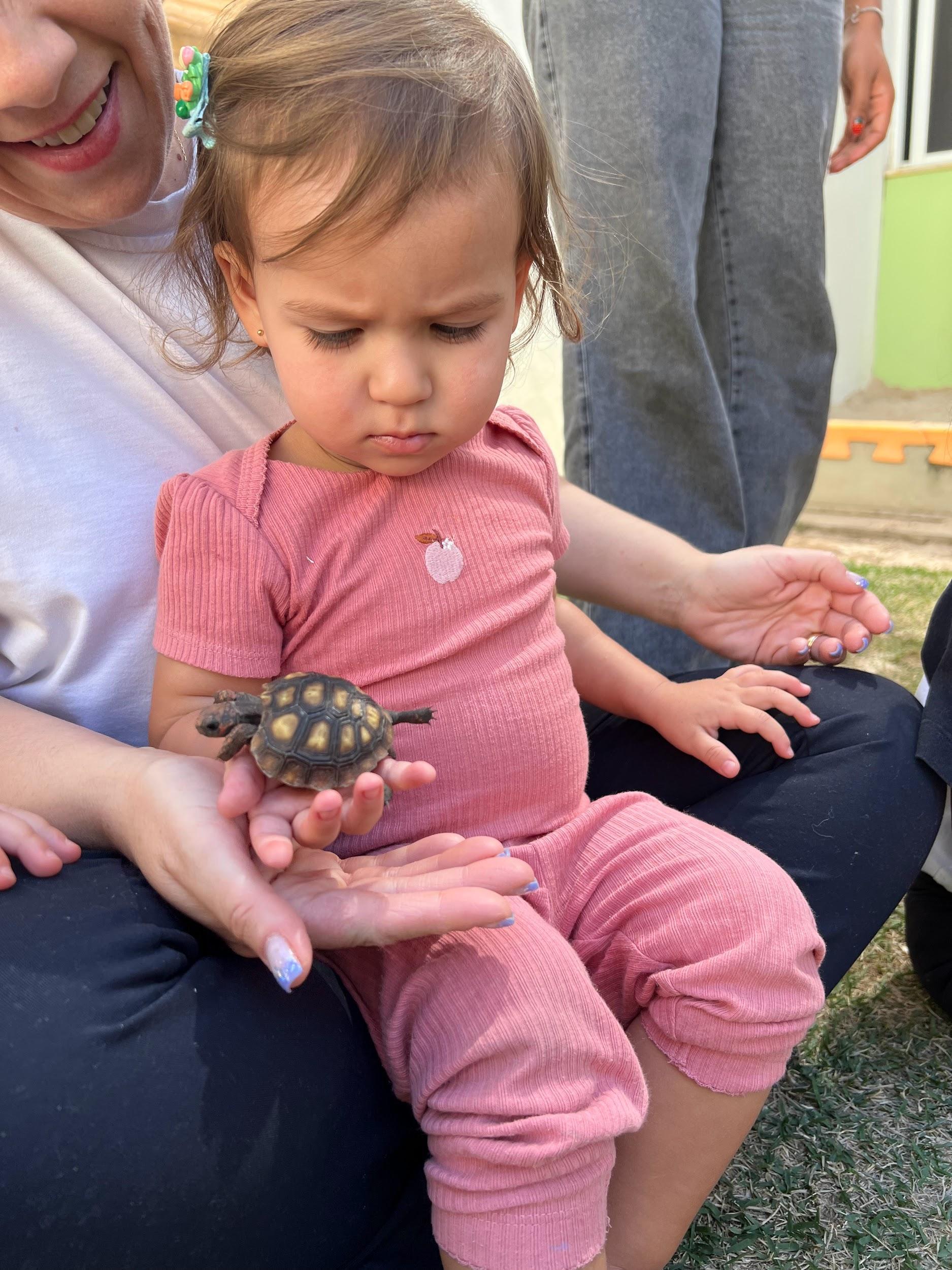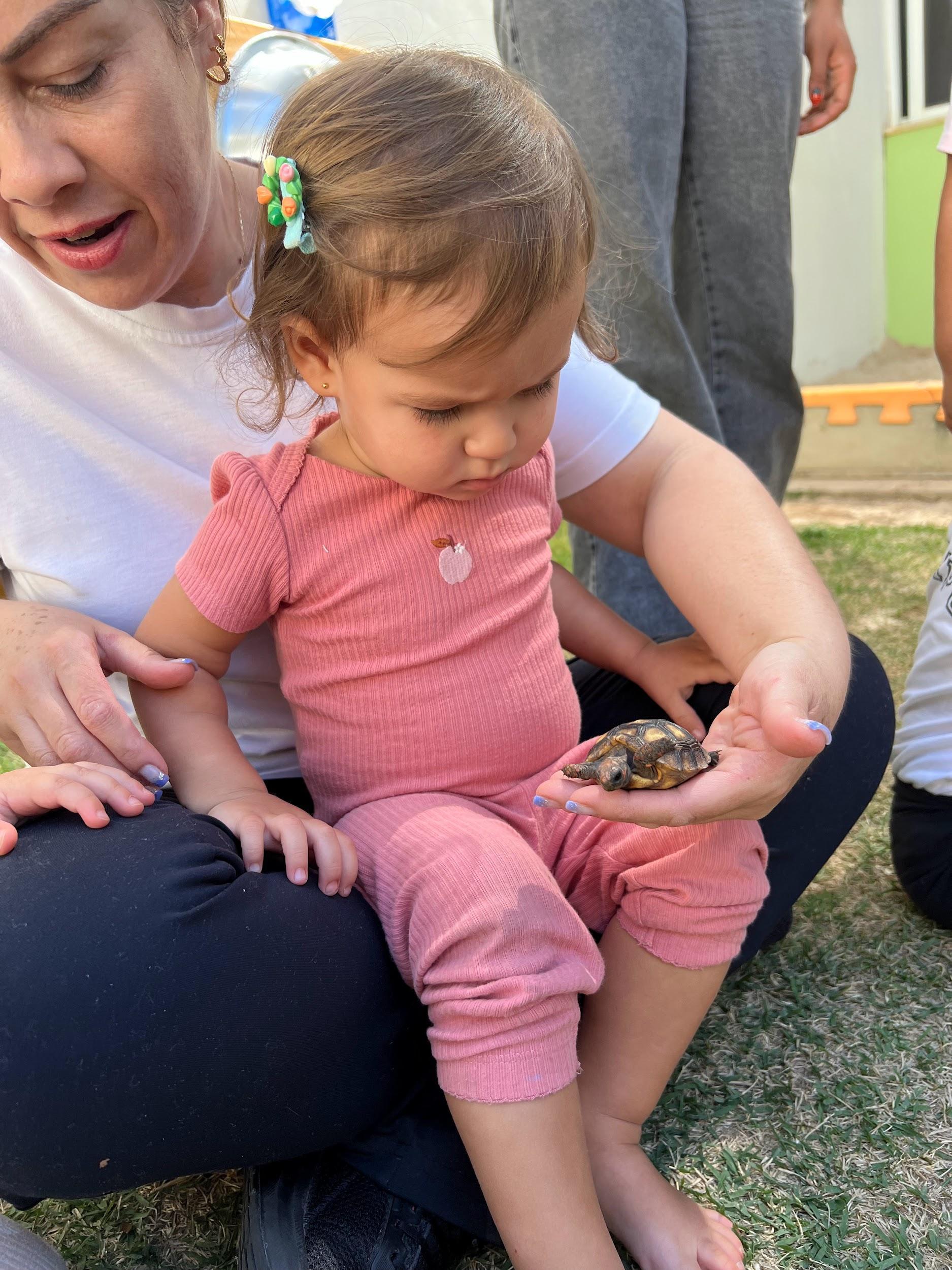 estende as mãos e segura o mini jabuti, sentindo sua textura e firmeza, enquanto continua a observá-lo atentamente. É mais um momento de descoberta e conexão com a natureza, onde a curiosidade e a delicadeza de Ana se manifestam em cada gesto.