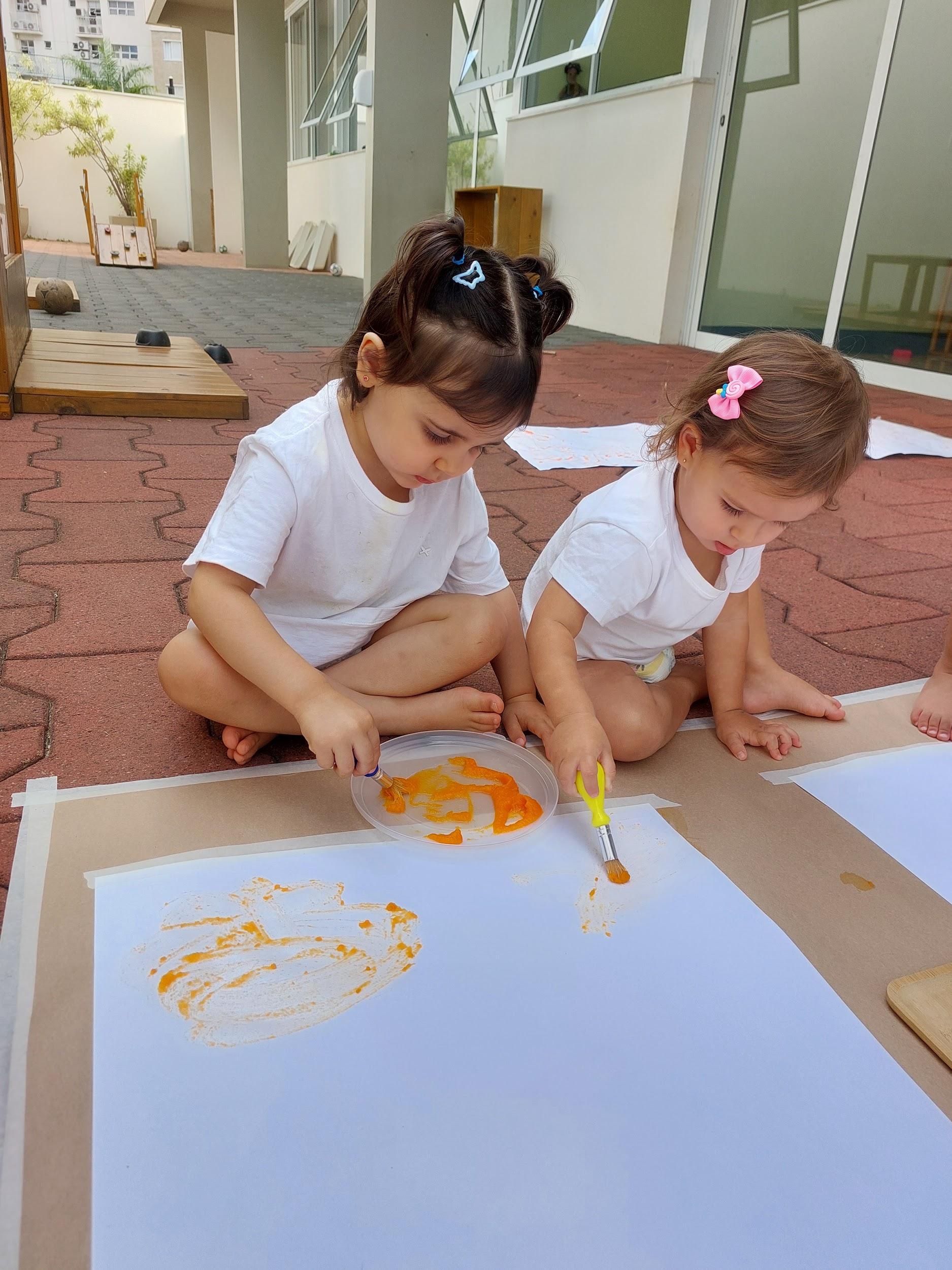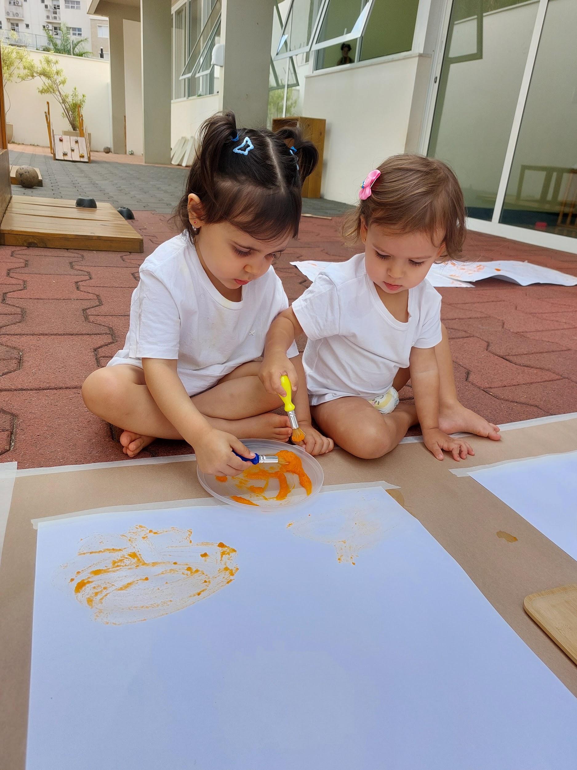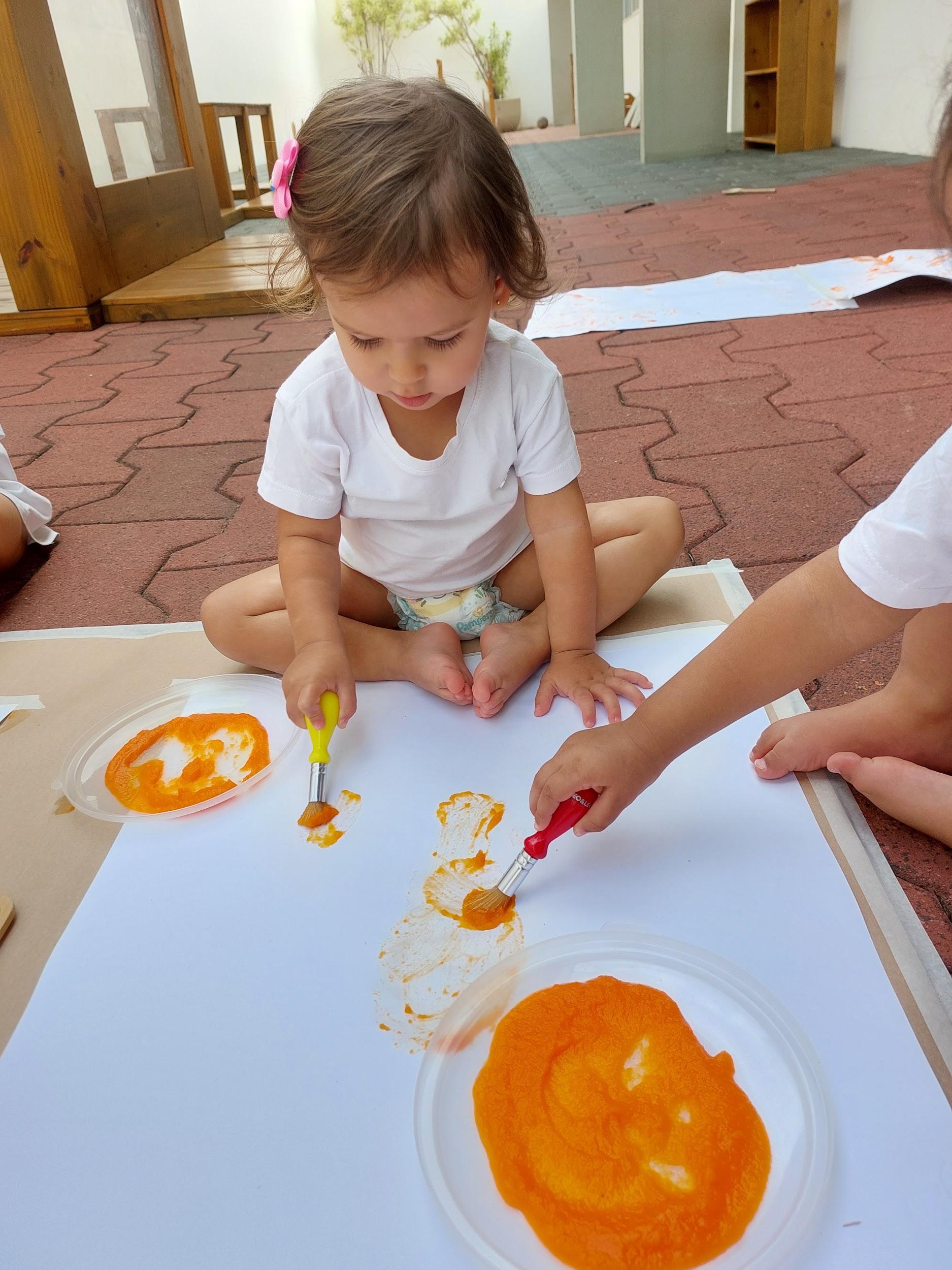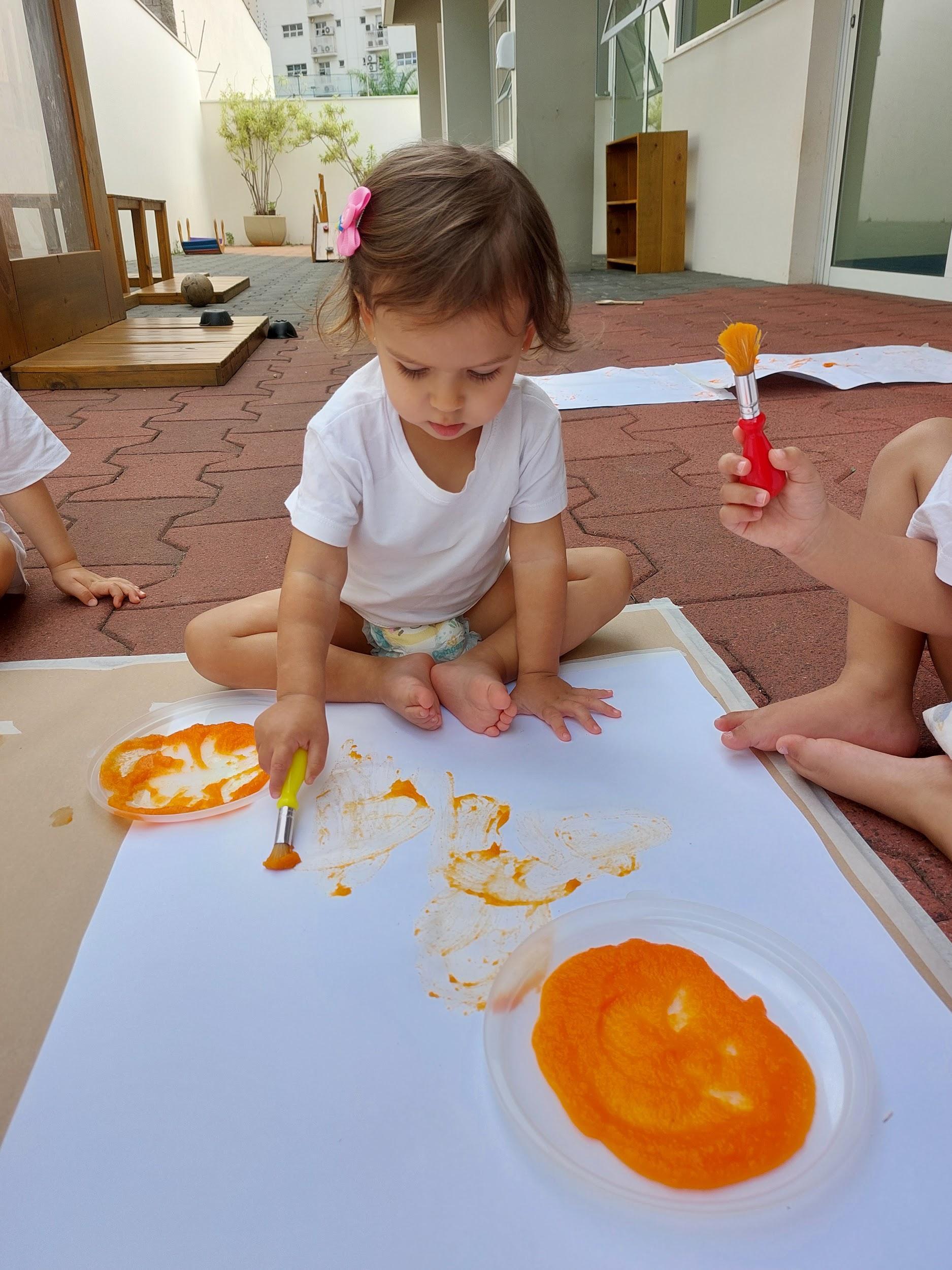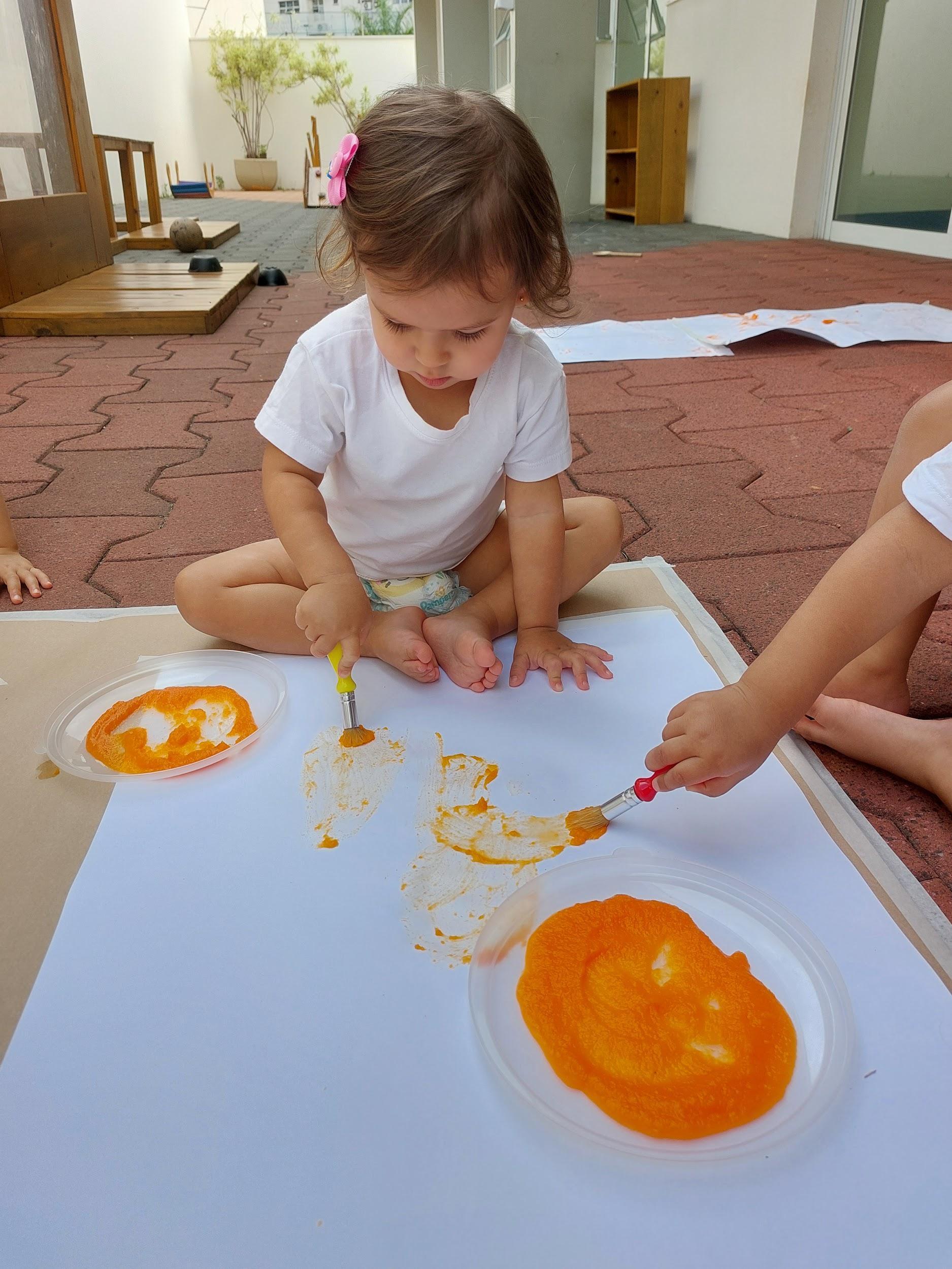 Ana se diverte ao explorar a tinta de cenoura, molhando o pincel com cuidado e deixando suas marcas delicadas sobre o papel. Cada traço é feito com atenção, enquanto observa atentamente as formas que vão surgindo.