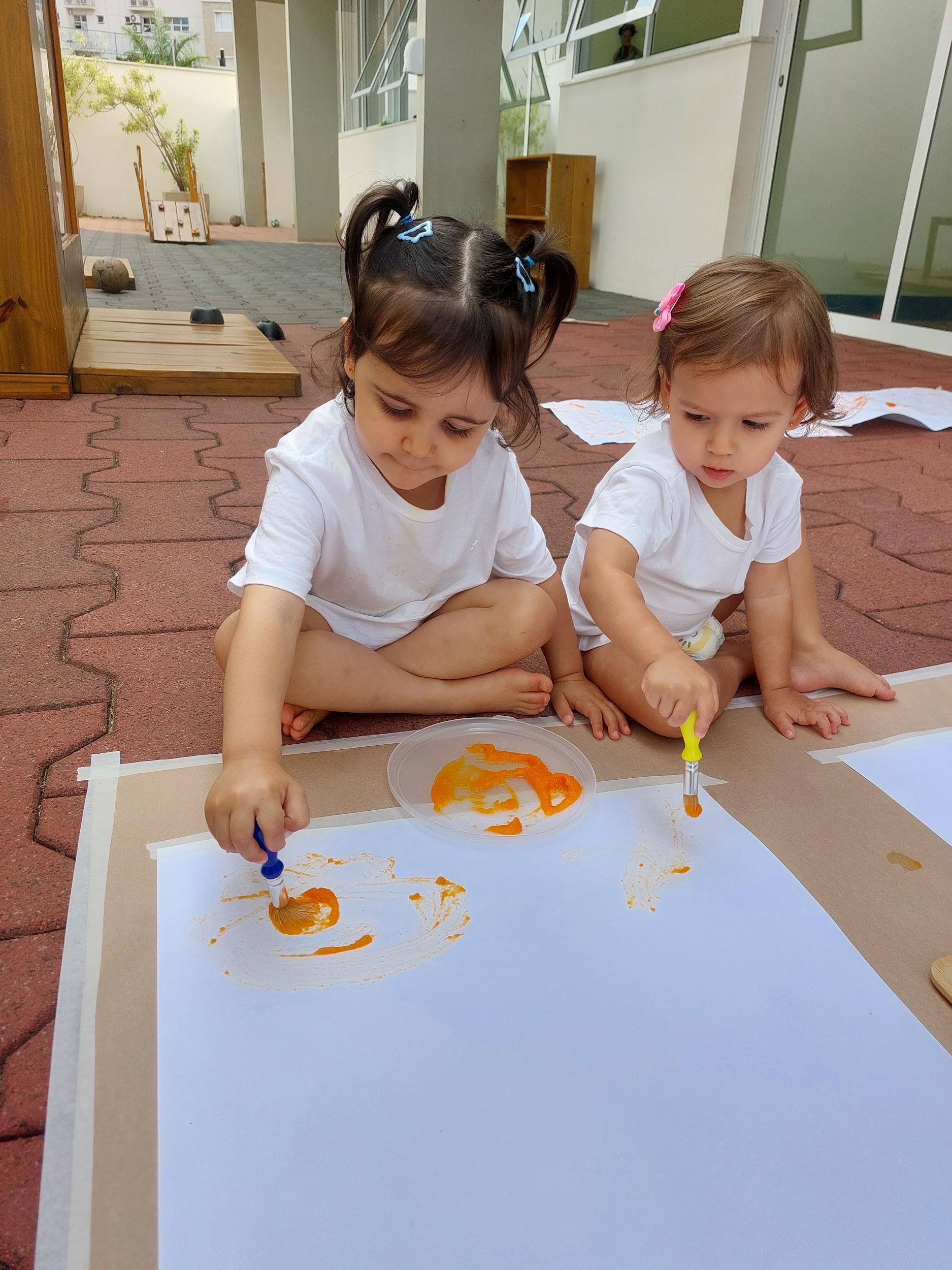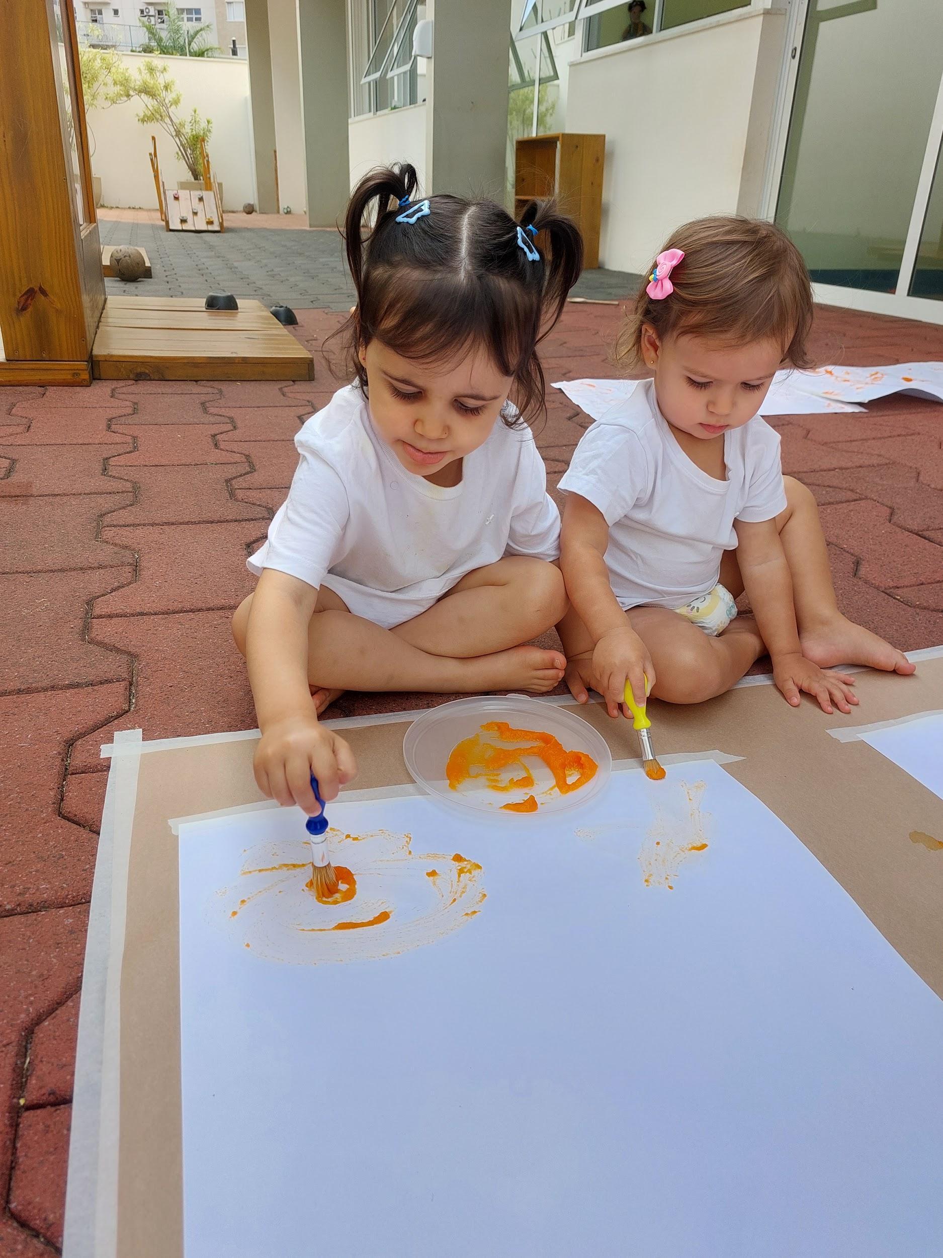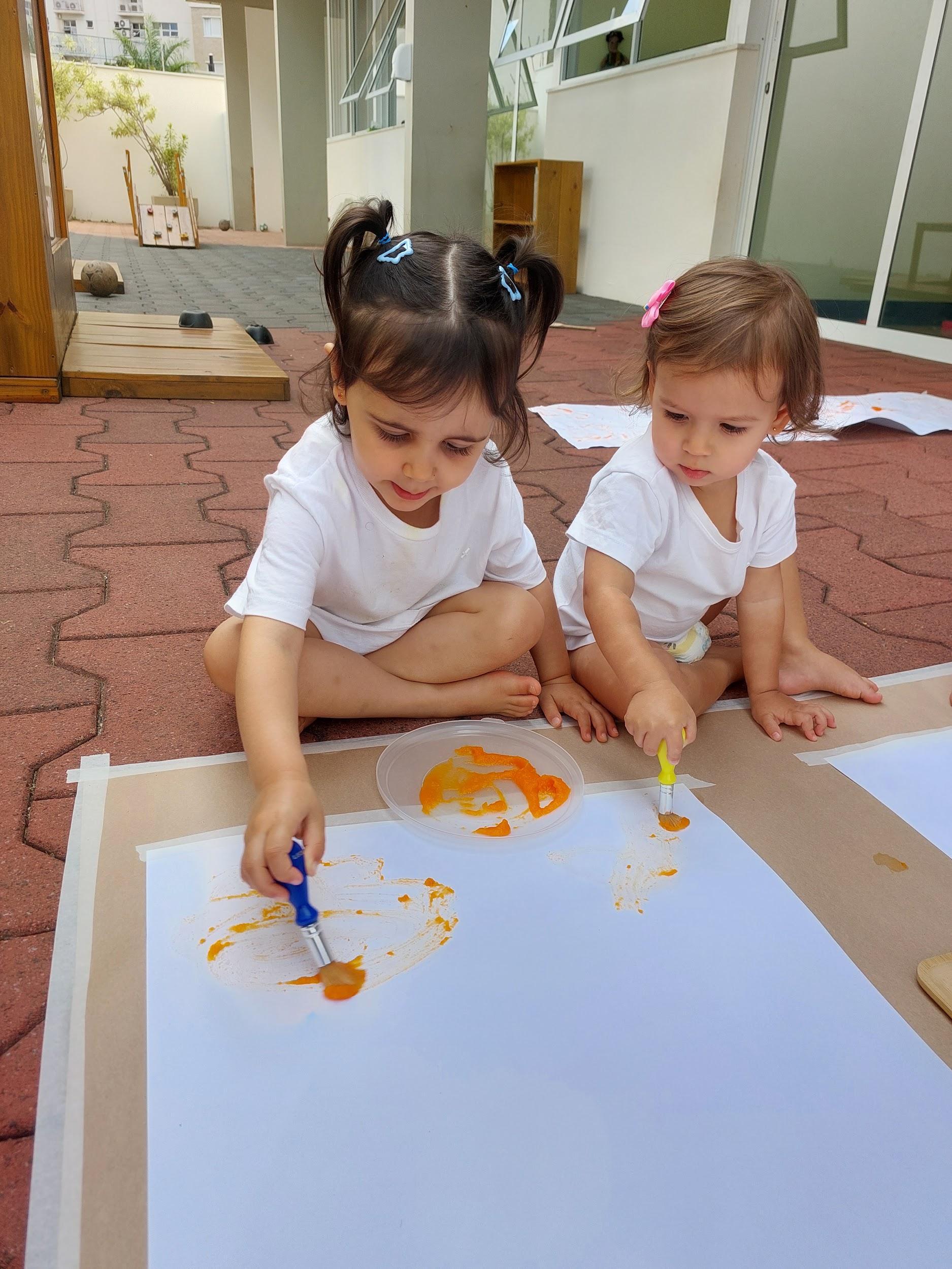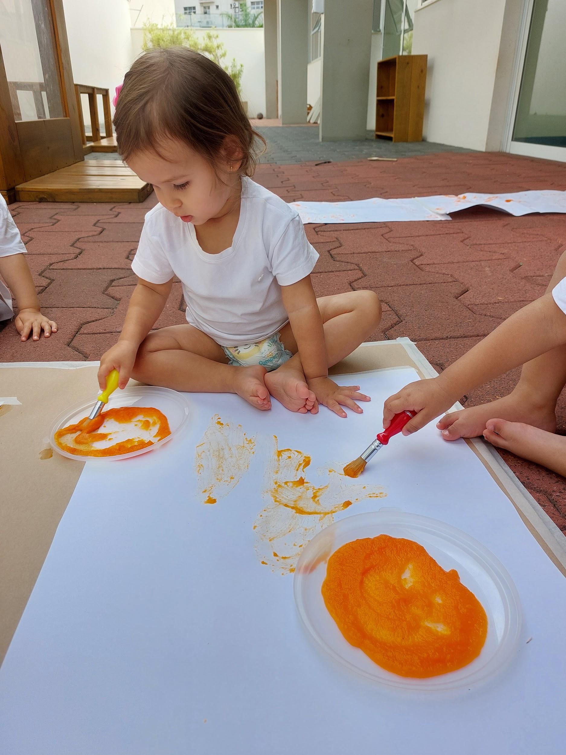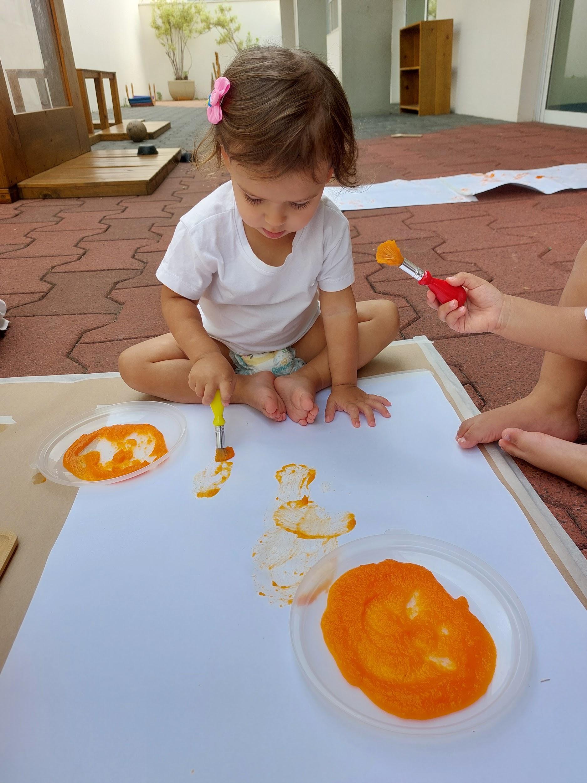 Ana se diverte ao explorar a tinta de cenoura, molhando o pincel com cuidado e deixando suas marcas delicadas sobre o papel. Cada traço é feito com atenção, enquanto observa atentamente as formas que vão surgindo.