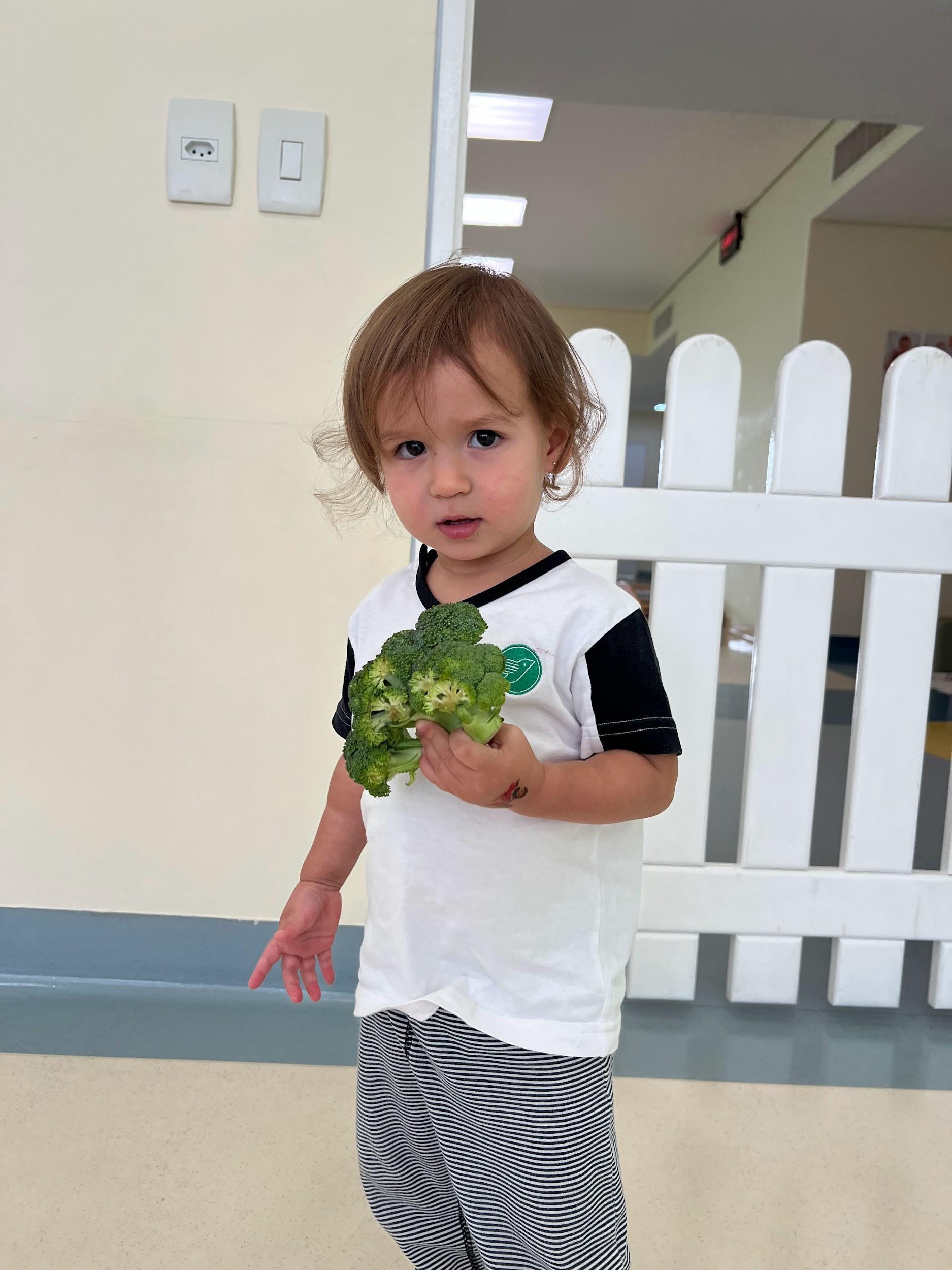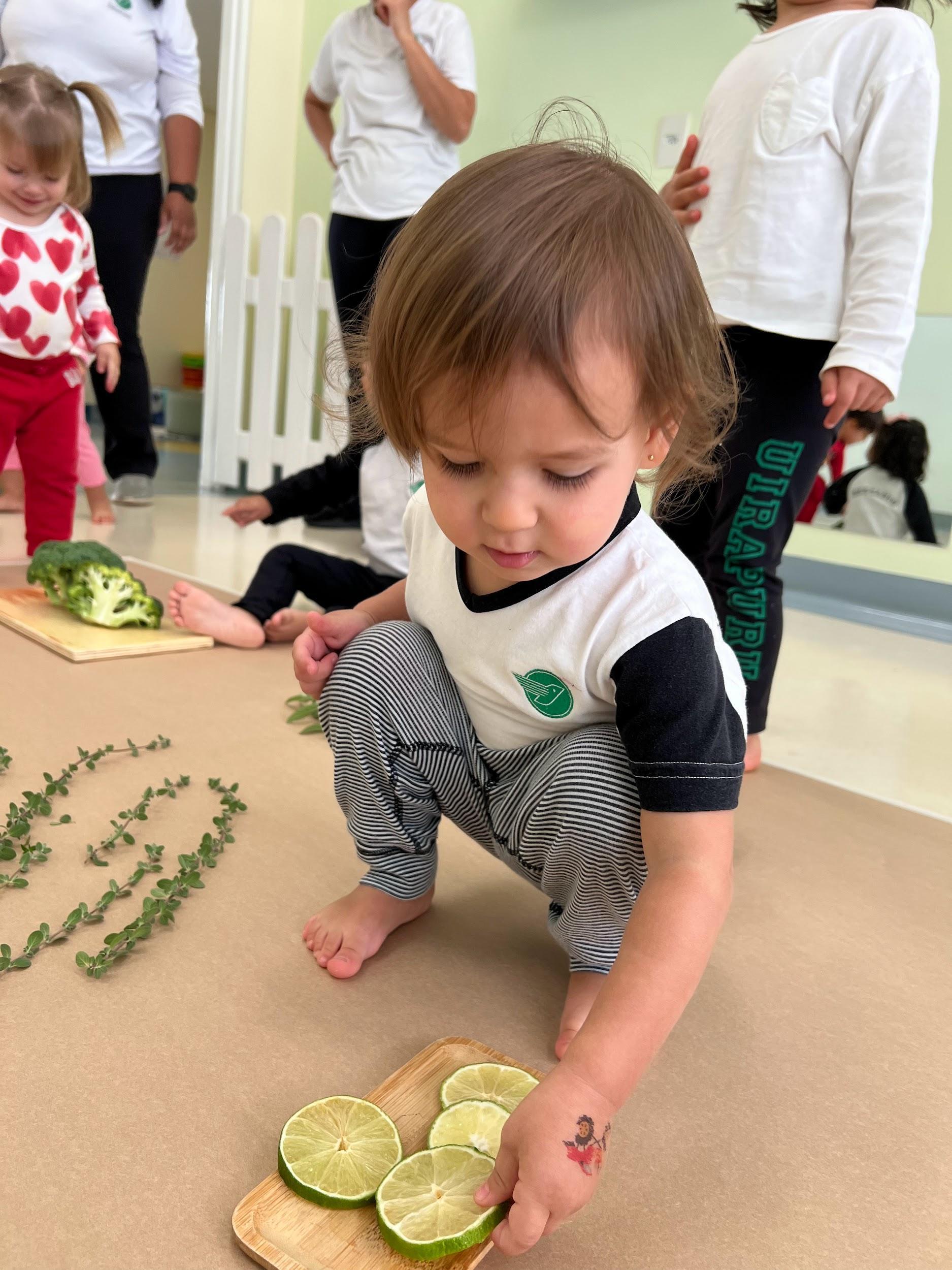 Entre sabores, texturas e descobertas, Ana vai explorando o mundo com aquilo que toca, e o mundo se deixa conhecer por ela. No verde, seus olhos se iluminam ao experimentar o limão, sentindo sua textura e provando um pedacinho suculento. Em seguida, segura o brócolis com curiosidade, observando seu formato e percebendo o aroma característico. Cada toque e cada gesto revelam sua atenção e entusiasmo, como se cada alimento fosse uma pequena descoberta a ser saboreada e apreciada.