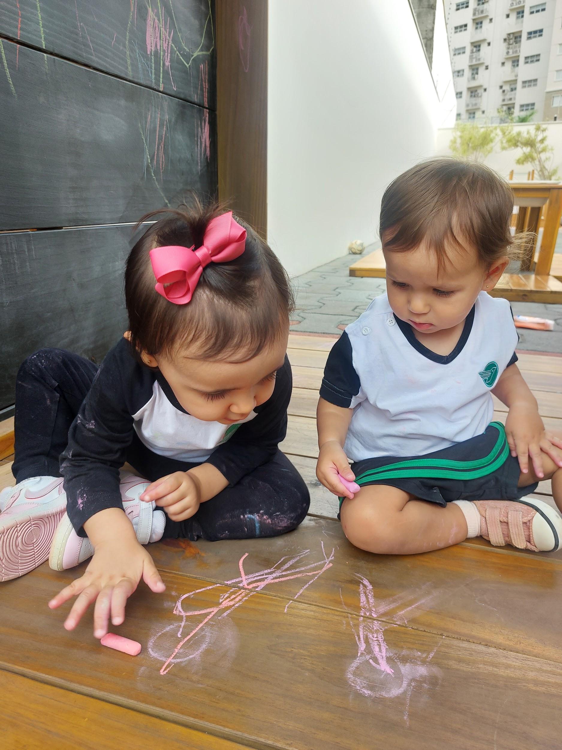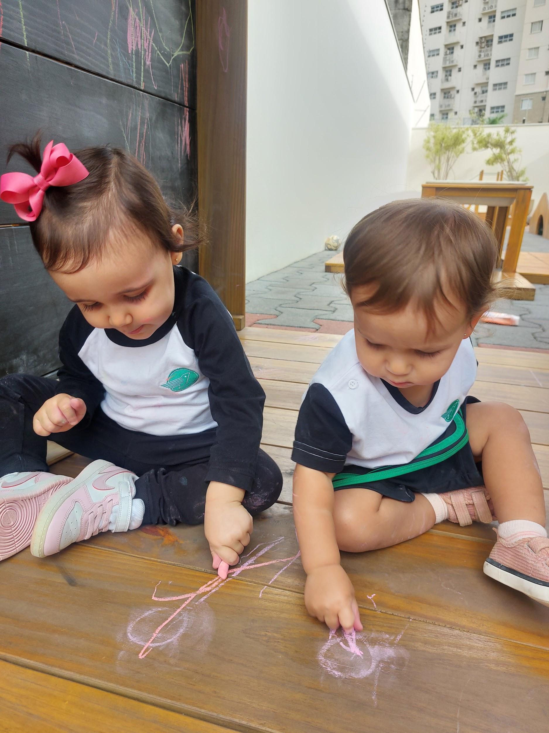 Ana e Helena se encontram na casinha, imersas em um momento criativo, desenhando juntas com giz de lousa. Observam atentamente os traços uma da outra, trocando risos e ideias, descobrindo caminhos inesperados em cada gesto.