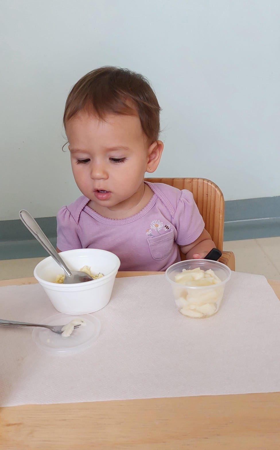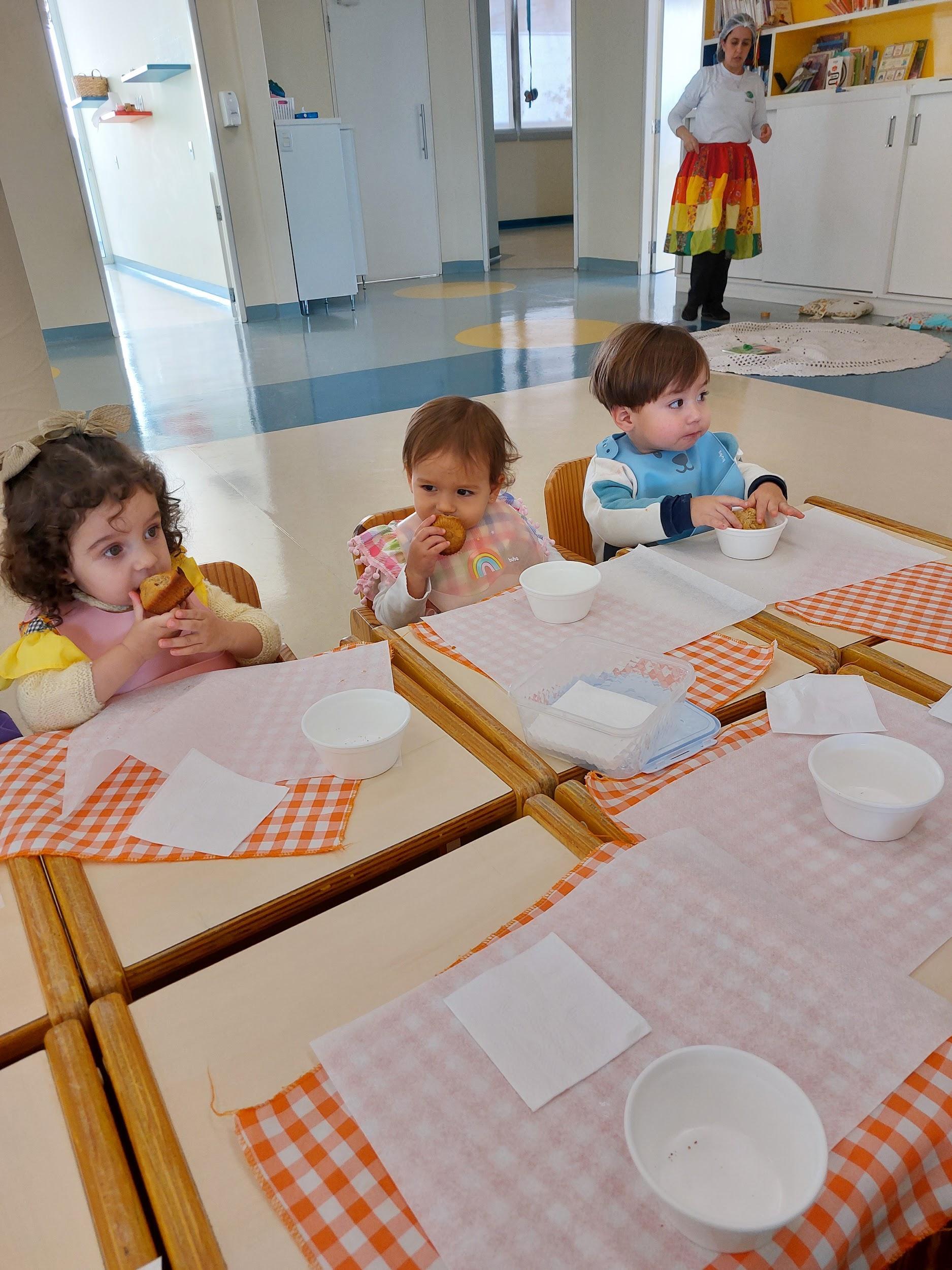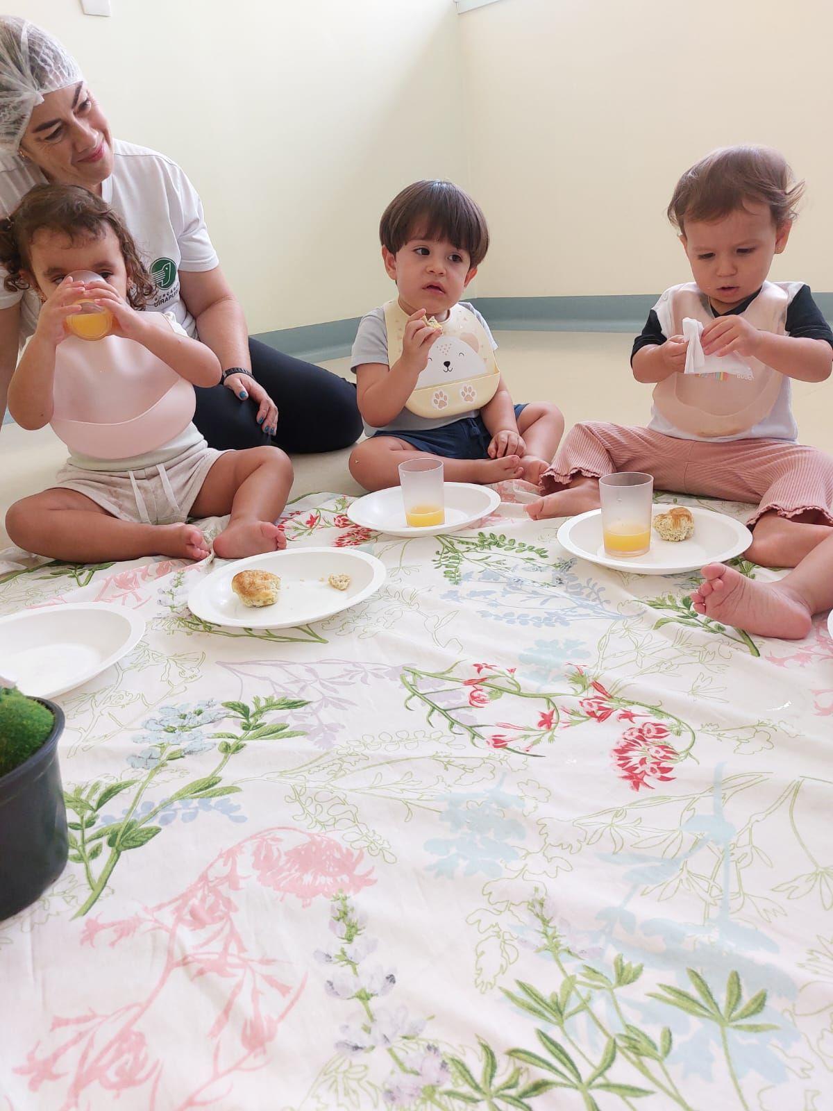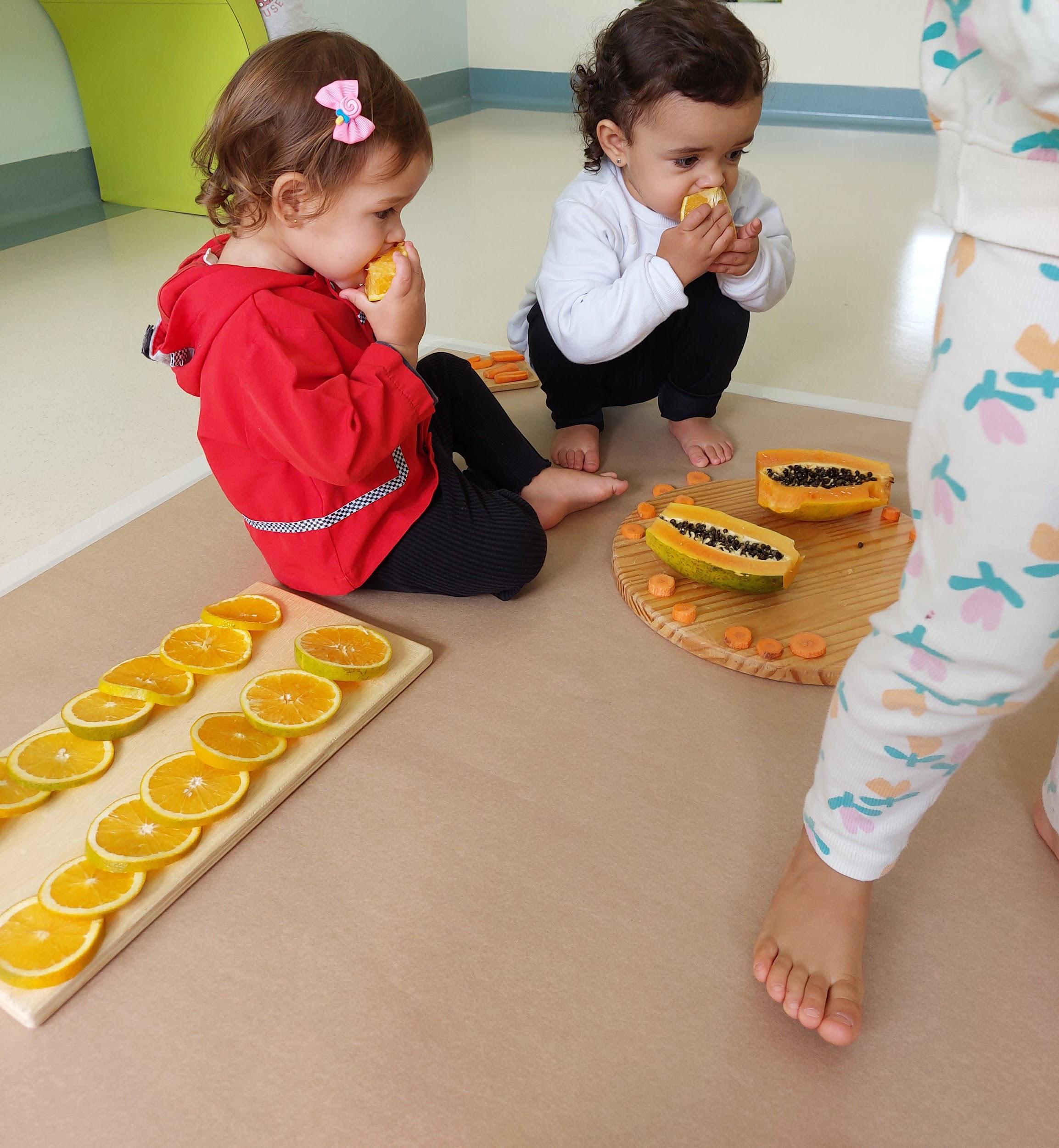 Experimenta texturas e sabores, provando frutas, pães e pequenas porções, desenvolvendo coordenação e independência a cada gesto.