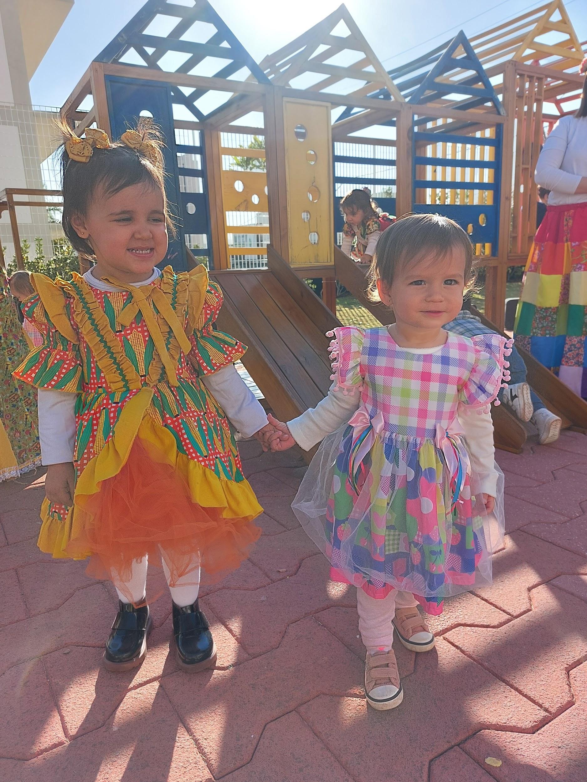 Uma lembrança doce de Ana na festa junina do berçário, sentada à mesa entre os amigos, partilhando sabores e sorrisos que aquecem o instante.