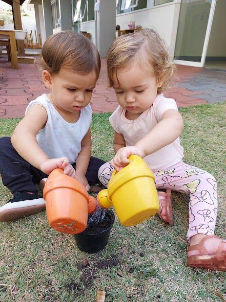 Por fim, regaram com delicadeza, deixando que a água tocasse o solo com suavidade. Assim, entre mãos miúdas, terra úmida e esperança brotando, nasceram os primeiros passos de um jardim.