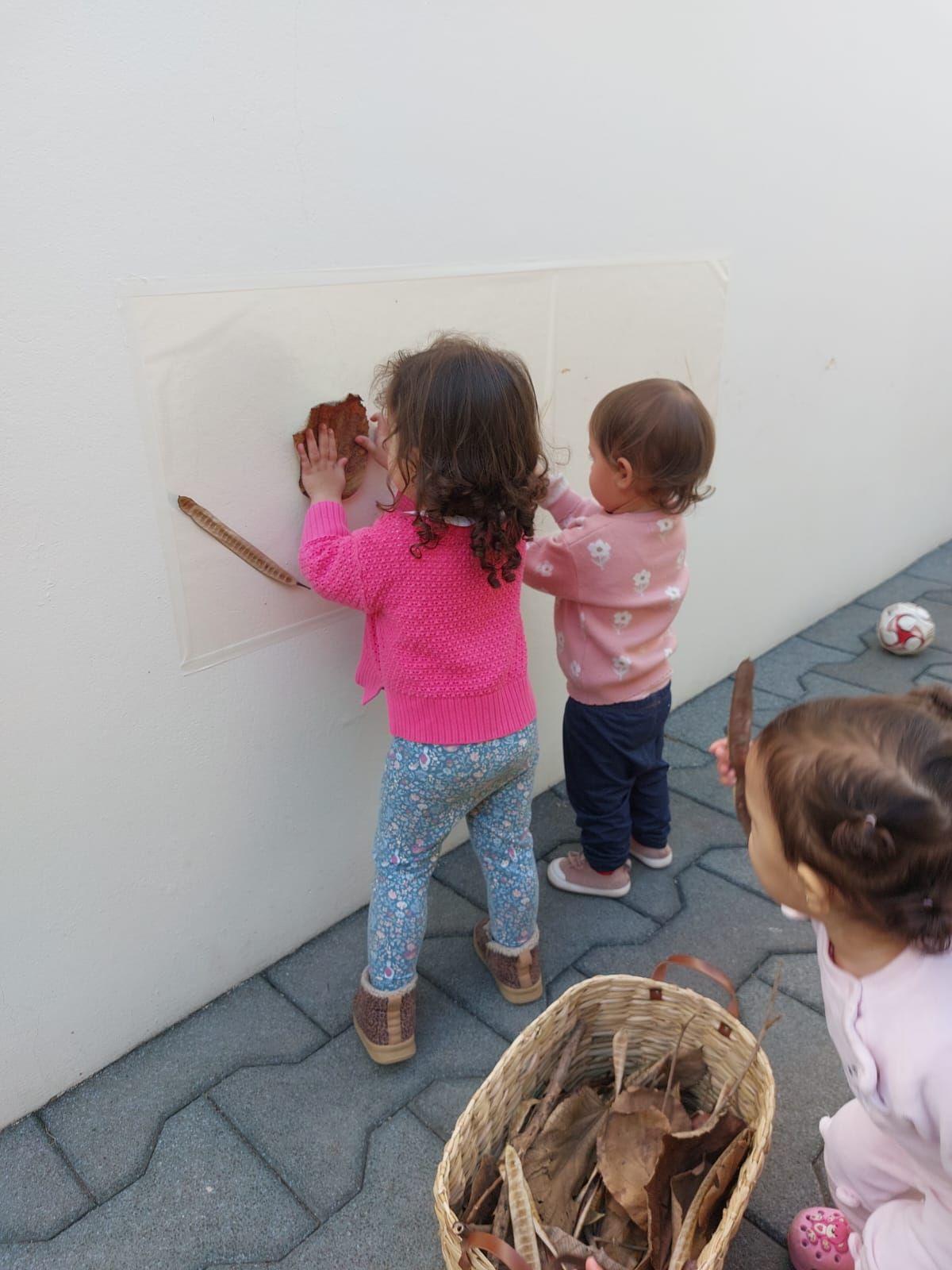 No parque, Ana se junta às amigas para criar um painel inspirado na natureza. Diante do papel contact preso à parede, ela se dedica a escolher folhas secas e outros elementos naturais, observando suas formas, texturas e nuances.