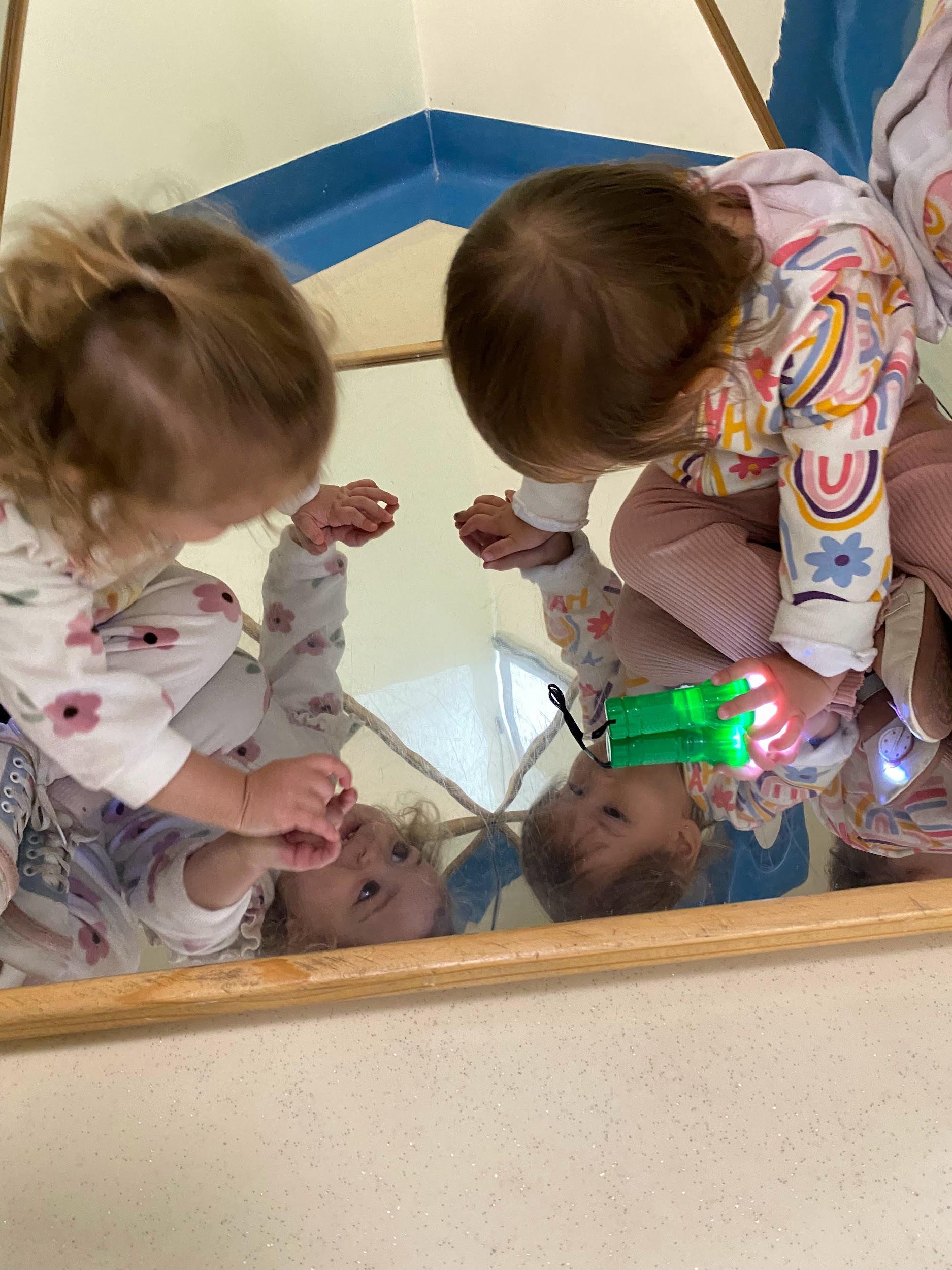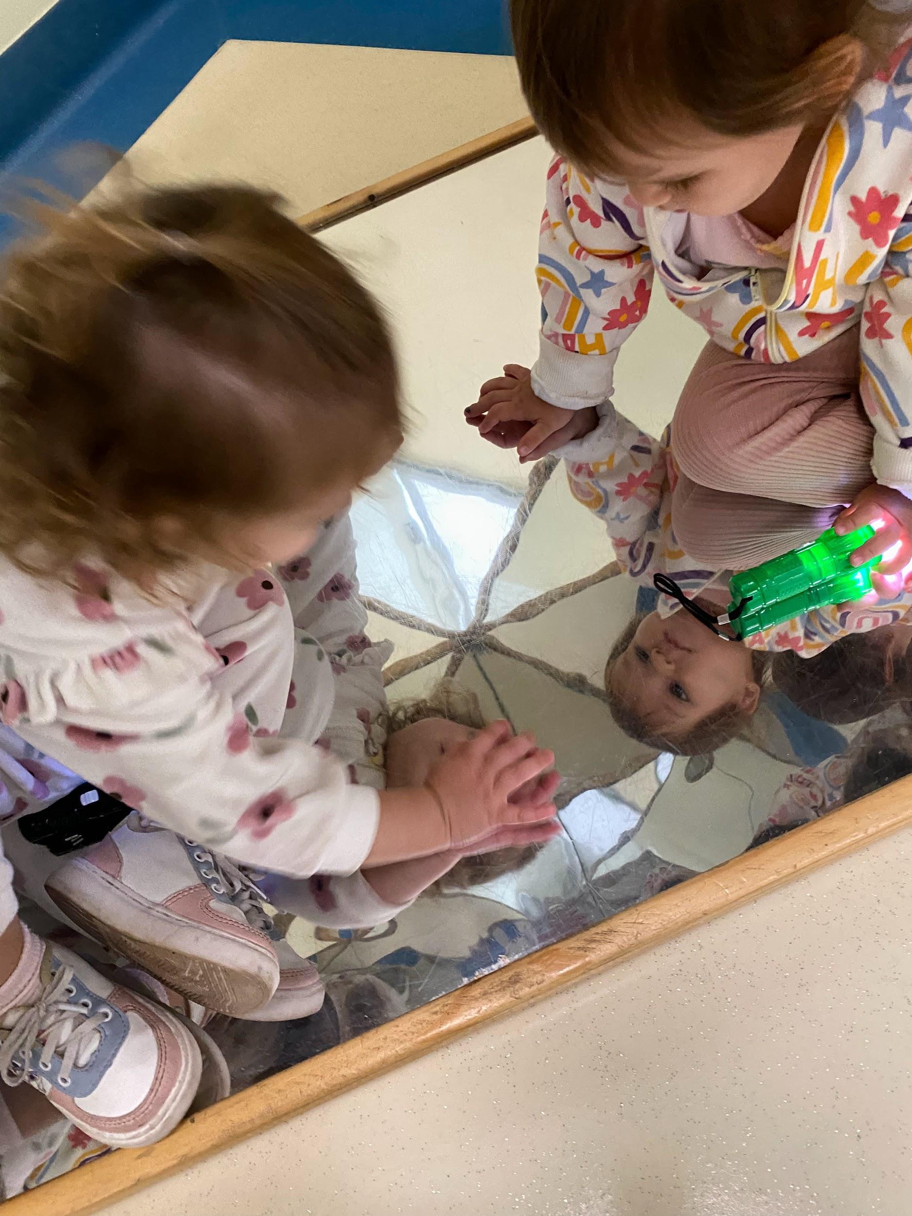 Ana e Luma se divertem no prisma espelhado, fascinadas pelos reflexos que se multiplicam diante delas. Juntas, descobrem suas imagens em diferentes formatos e ângulos, encantando-se com as distorções e novas perspectivas que os espelhos oferecem. Entre risos e olhares atentos, exploram o mundo refletido ao seu redor, enquanto a experiência de brincar lado a lado fortalece sua amizade e desperta criatividade, curiosidade e encantamento.