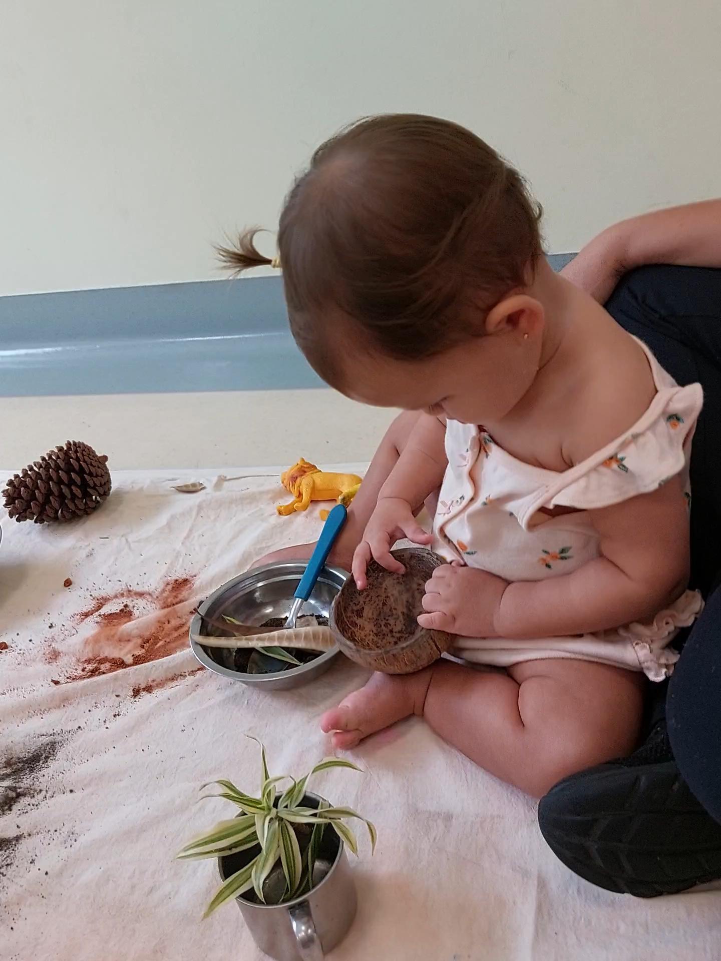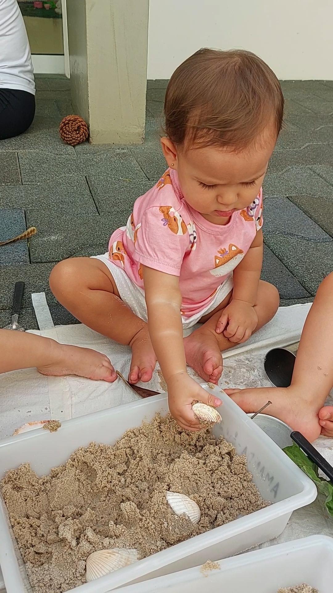 Curiosa, Ana recolhe uma delas, ergue-a para fora da bandeja e a observa com calma, sentindo ainda a areia que se prende à sua superfície. Seus olhos se fixam na concha, enquanto os dedinhos percorrem seus contornos, explorando cada detalhe com uma atenção profunda, quase reverente.
