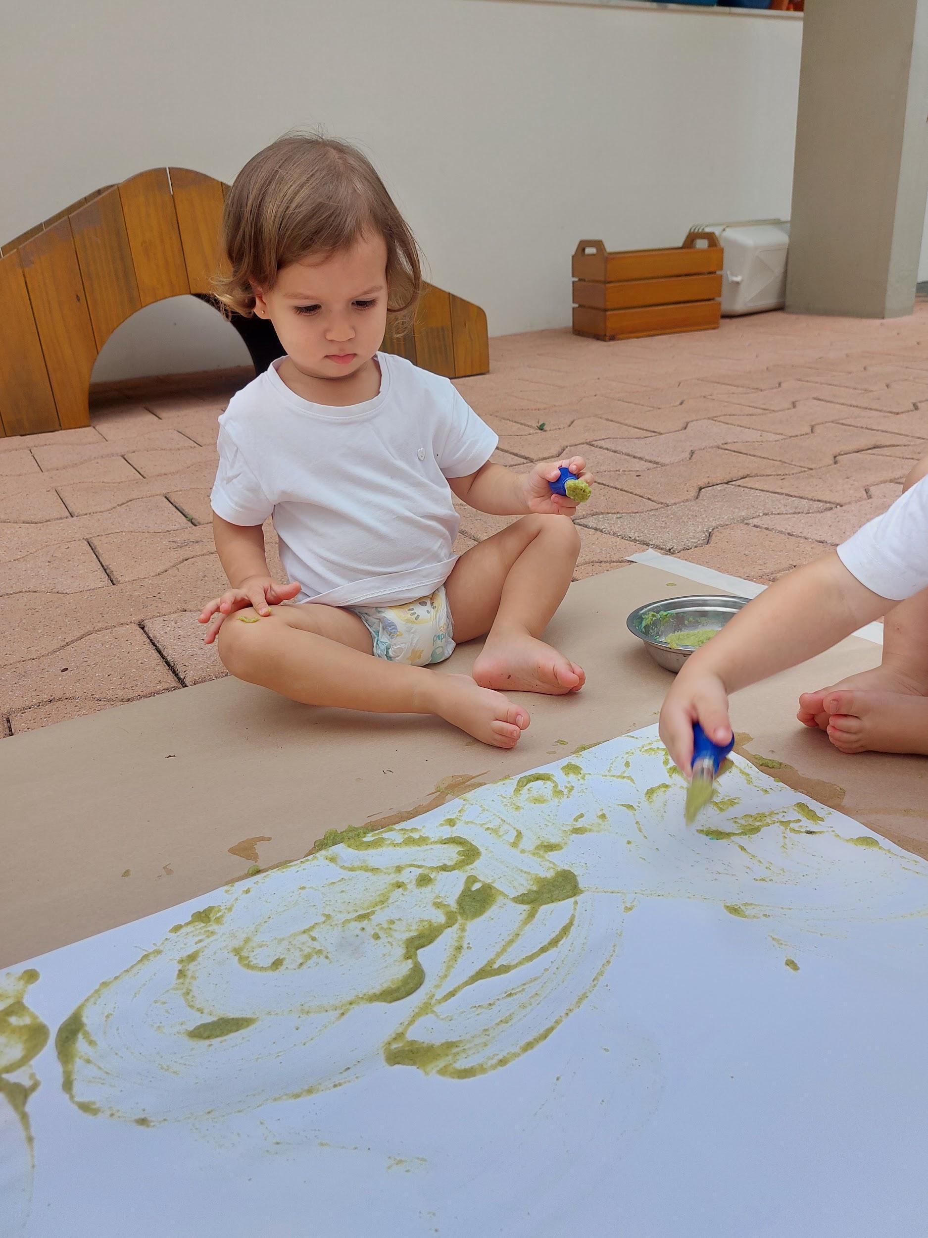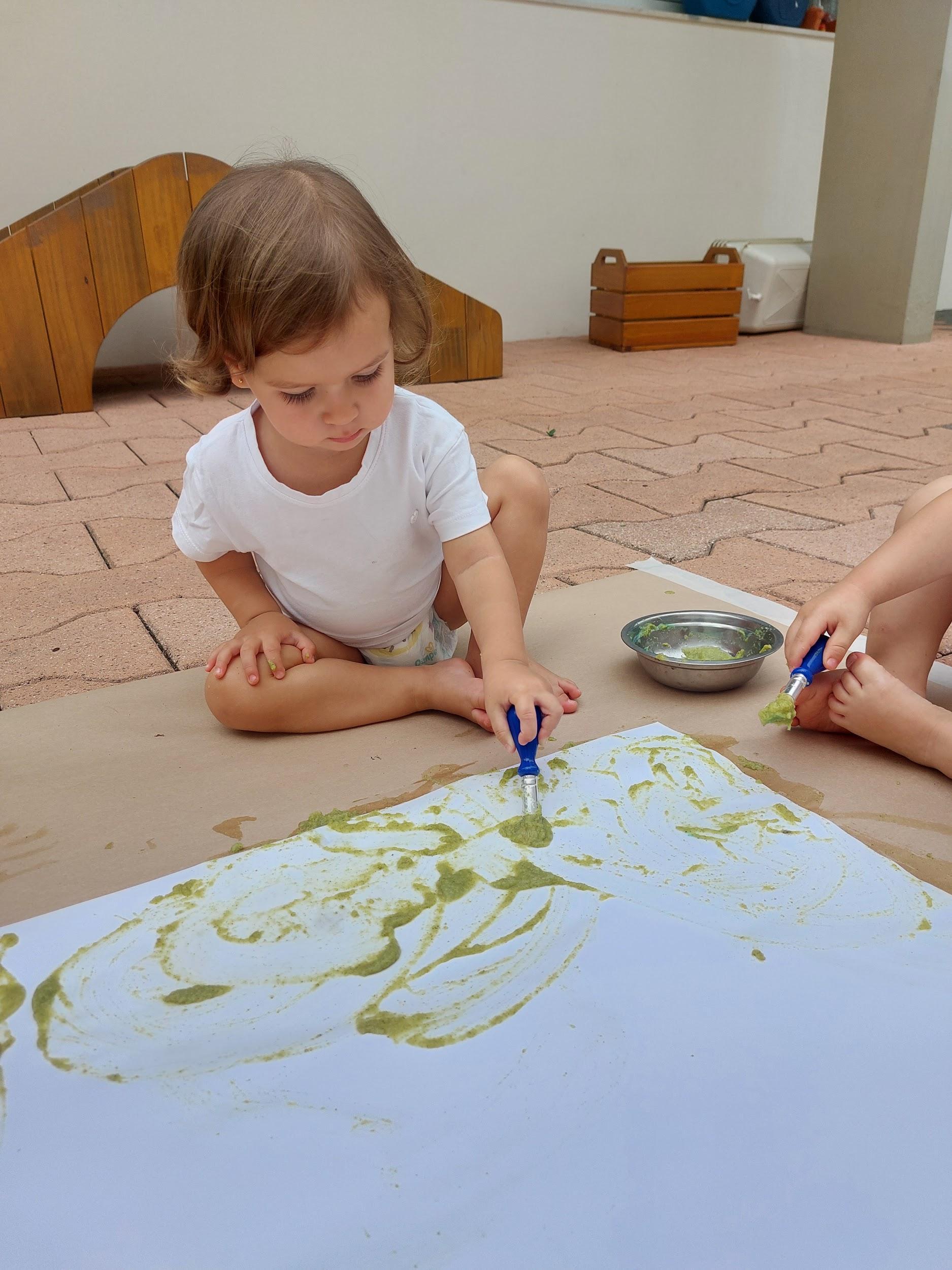 Com o pincel firme em suas mãos delicadas, Ana espalha a tinta de brócolis pelo papel, como quem deixa a própria curiosidade se transformar em cores e formas.
