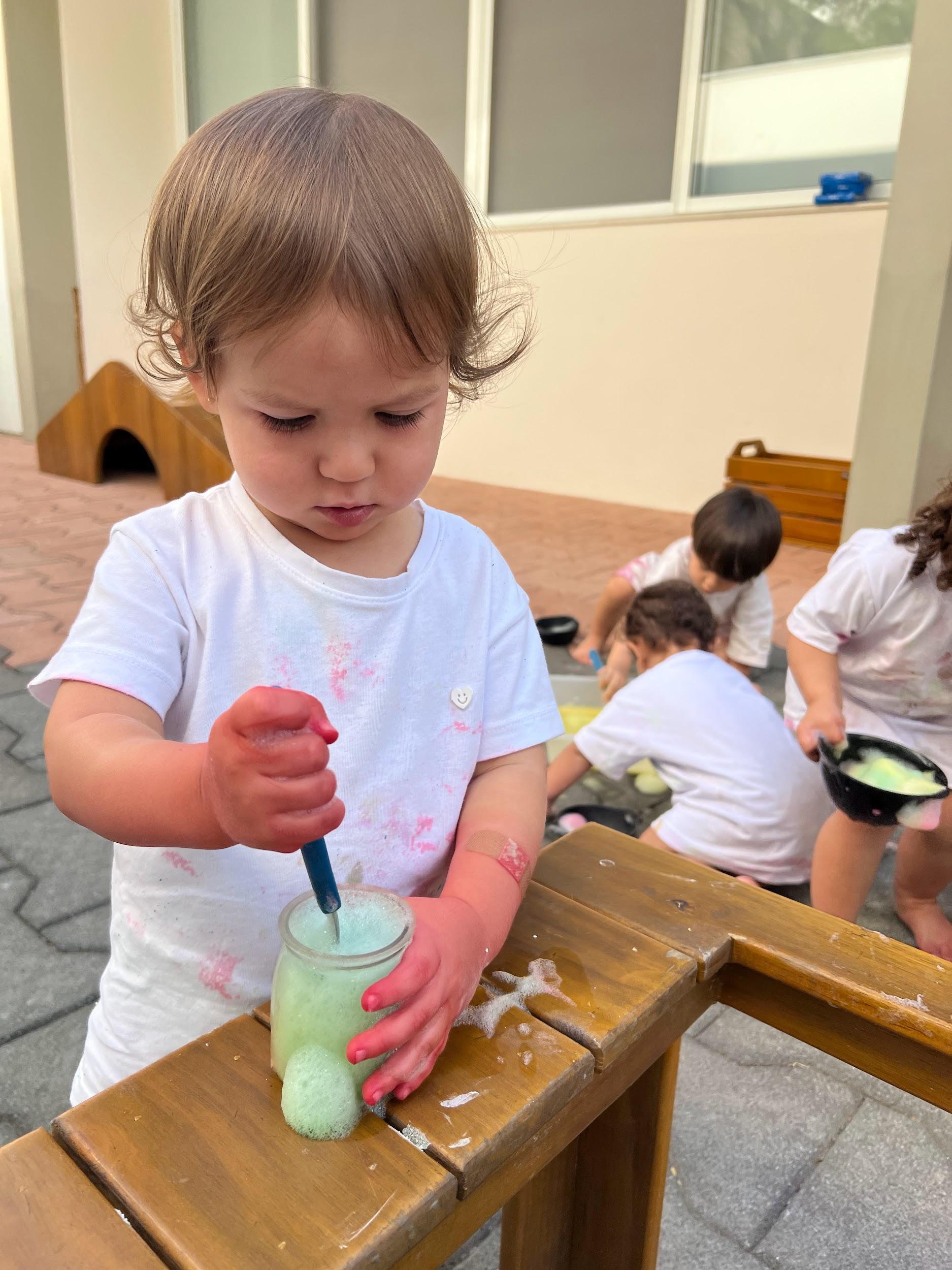 Explora cores diferentes, mas é o verde que mais a fascina, tornando a brincadeira ainda mais divertida. Entre toques delicados, criatividade e imaginação, Ana se entrega completamente à proposta lúdica, descobrindo formas, texturas e possibilidades em cada movimento. É um momento de alegria pura, onde sua imaginação ganha vida de maneira única.
