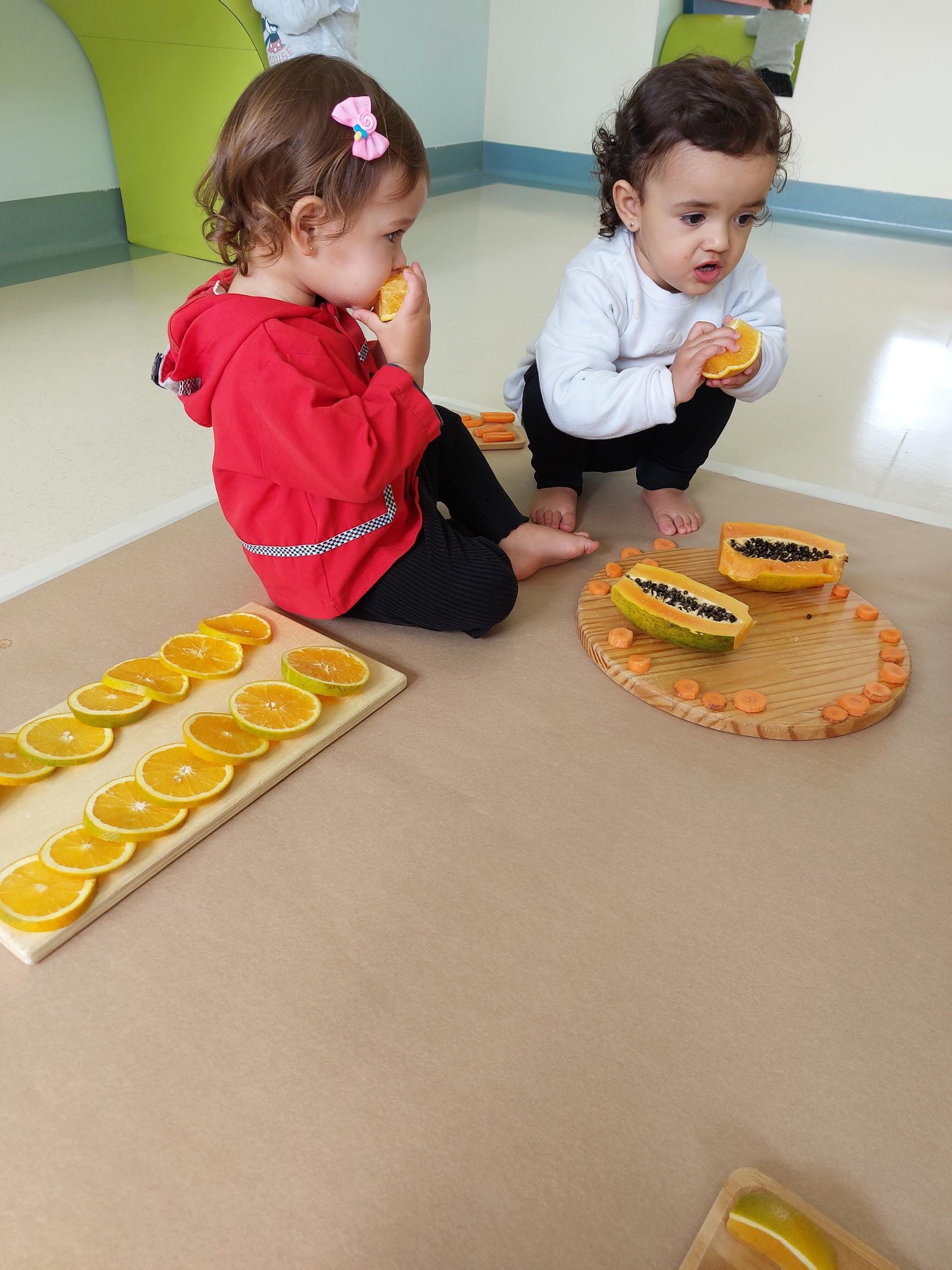 Ana experimenta o amarelo, entre laranja e mamão, provando a laranja e degustando com doçura. Entre momentos compartilhados com Júlia, ela mergulha em diferentes texturas e sabores, descobrindo nuances e encantando-se com cada nova experiência.