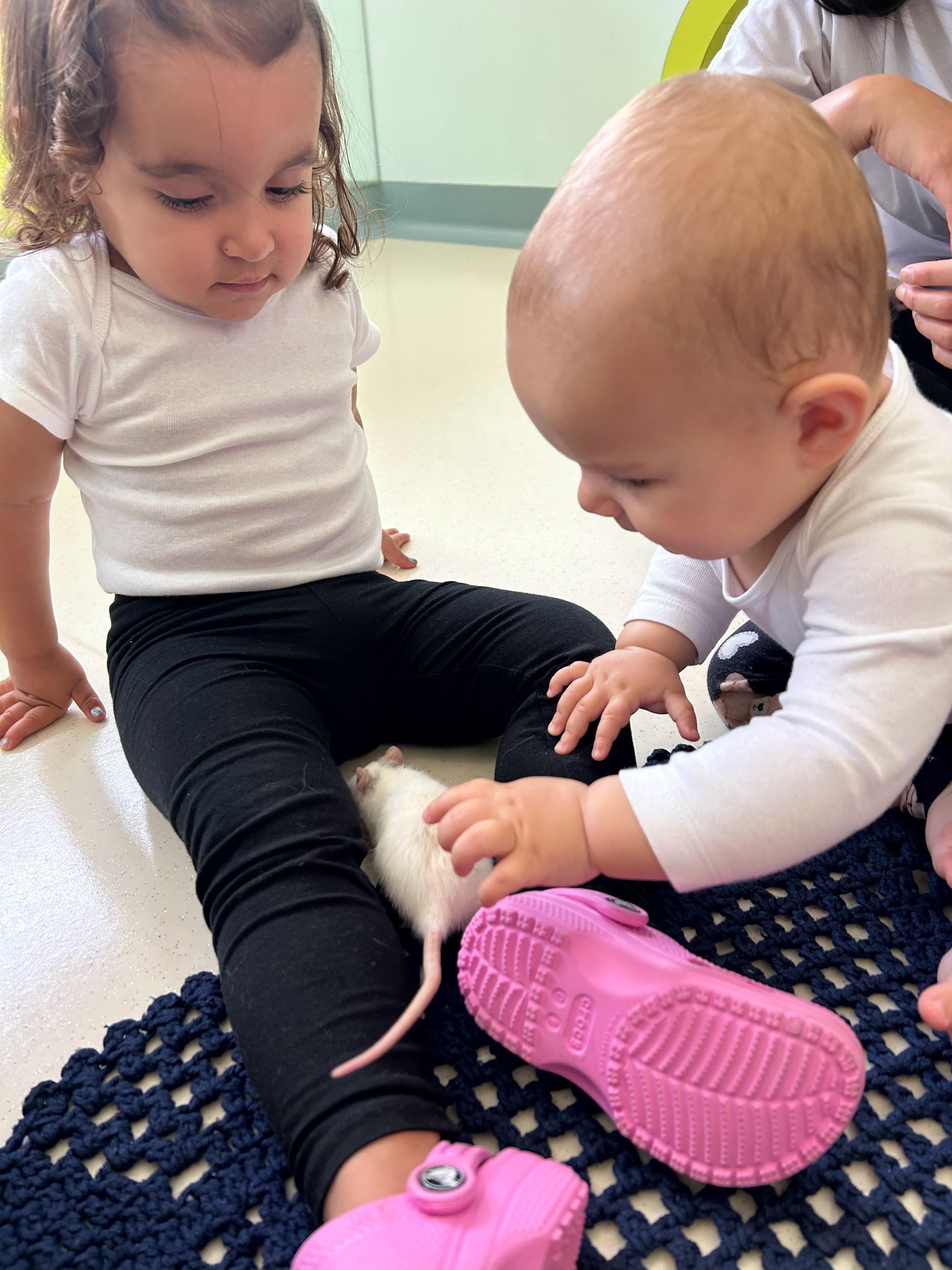 Em outro encontro cheio de delicadezas, Bella se encanta pela ratinha que repousa nas mãos do adulto. Seus olhos se iluminam, acompanhando cada movimento miúdo, cada vibrar de bigode, como quem descobre um segredo sussurrado pela natureza.